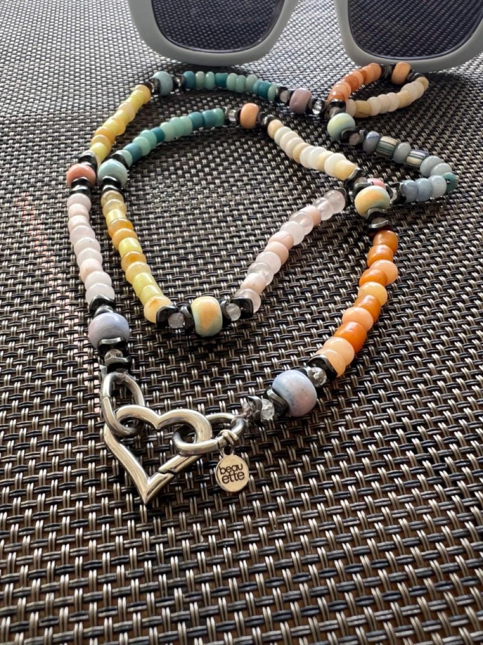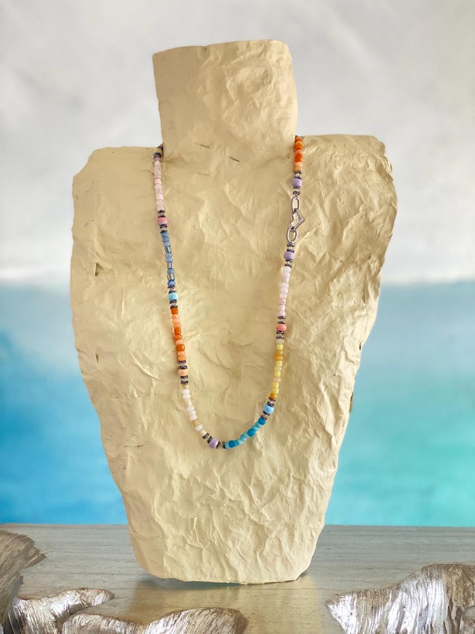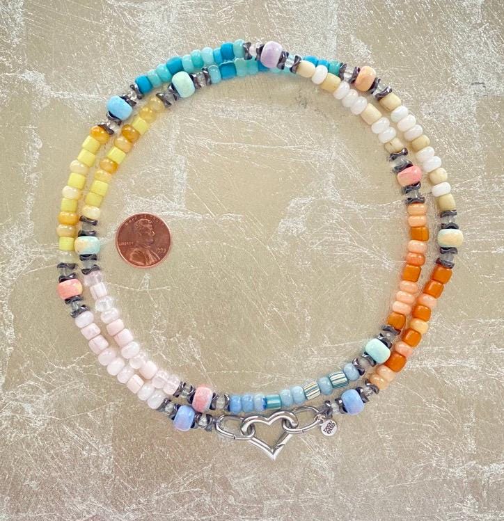One of a kind, mixed pastels, gemstone and glass beaded necklace with silver heart clasp is 30 inches in length and designed to be worn either long or doubled as a choker, with or without the heart showing.