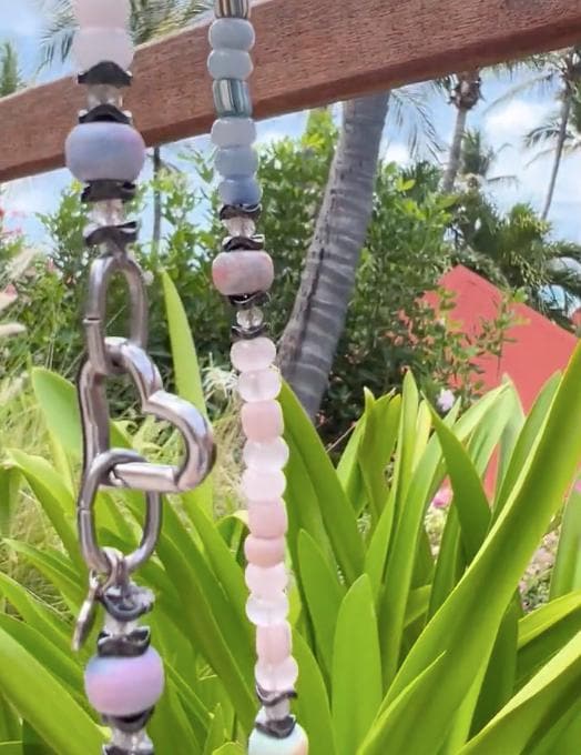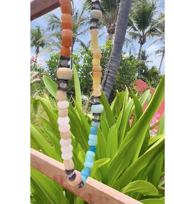 Gemstones are: watercolor agate, hematite, clear quartz, rose quartz, amazonite, white jade, peach aventurine, sodalite. Glass beads are vintage Czech glass and Java glass.