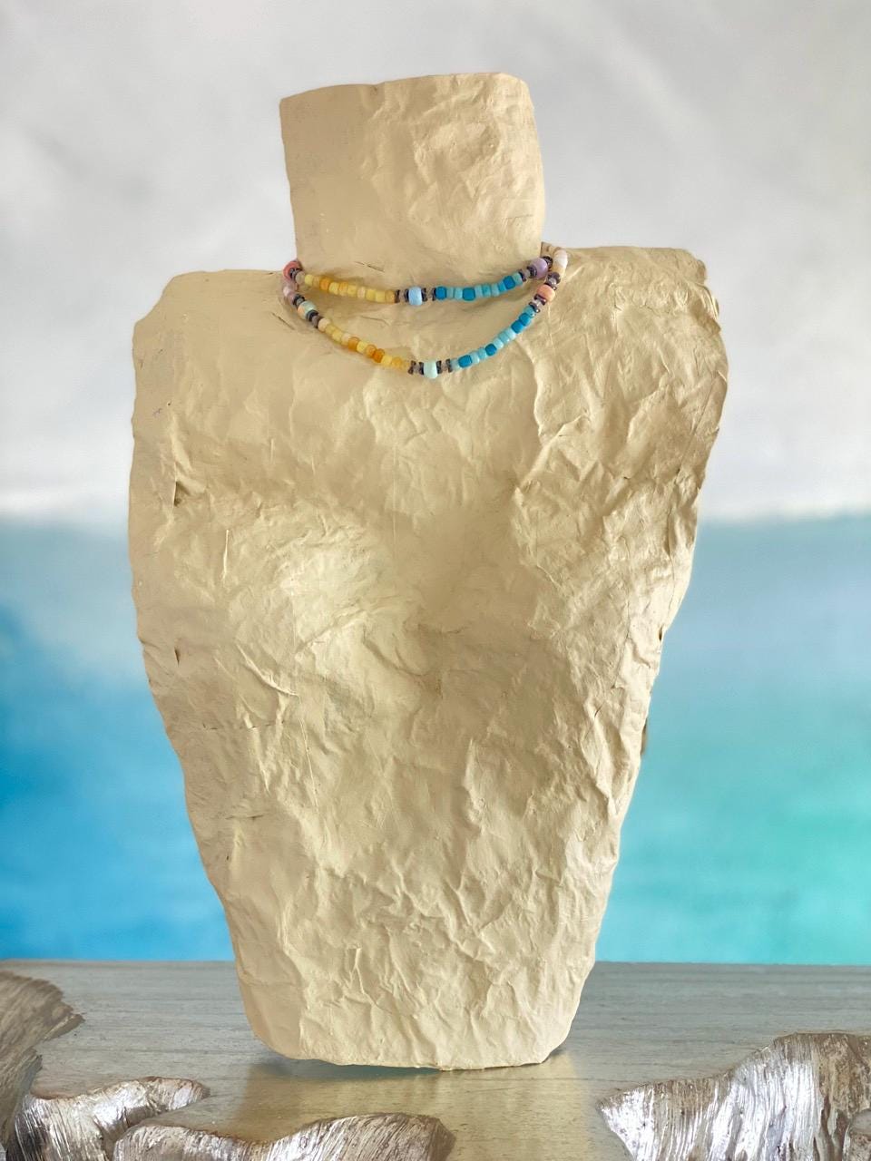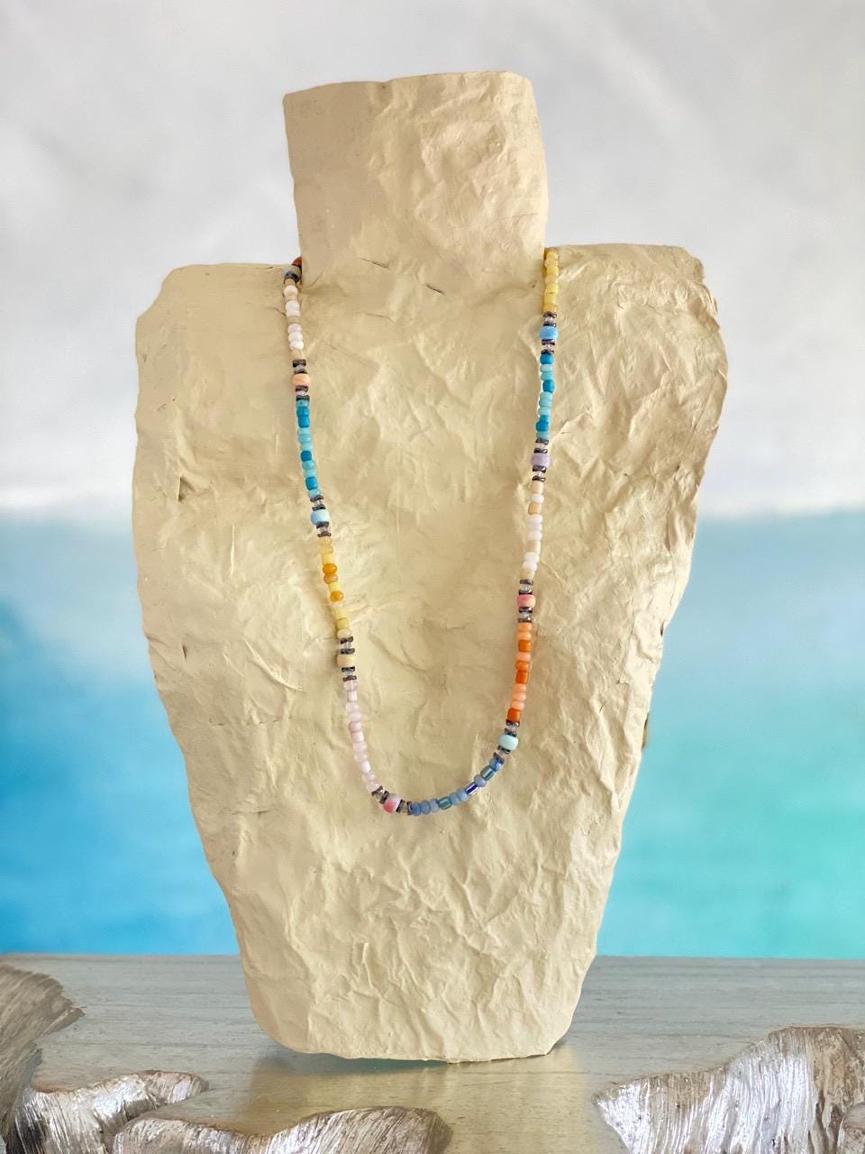 All jewelry is handmade of natural materials, by me, by the beach in California or by the mountains in Colorado. Packaging is compostable or recycled and/or recyclable. Items are shipped in an organic cotton jewelry bag, in a gift box with raffia ribbon and wood beads, ready for gifting to yourself or another.