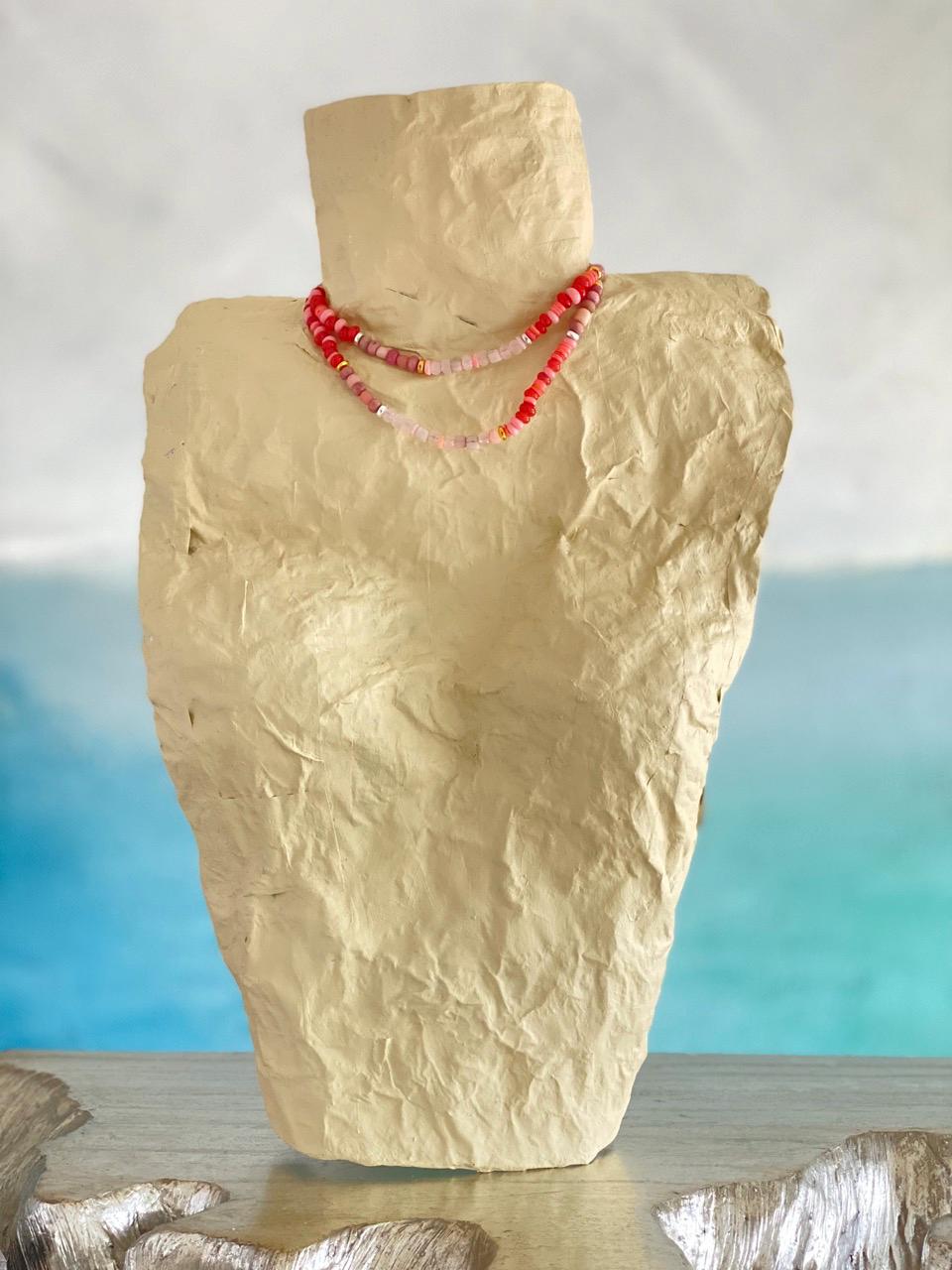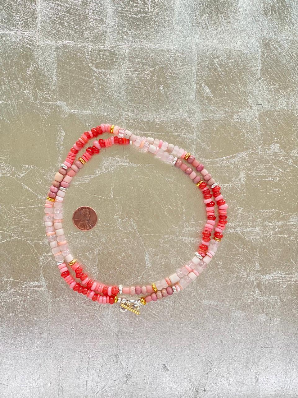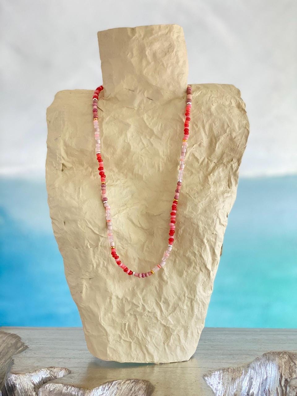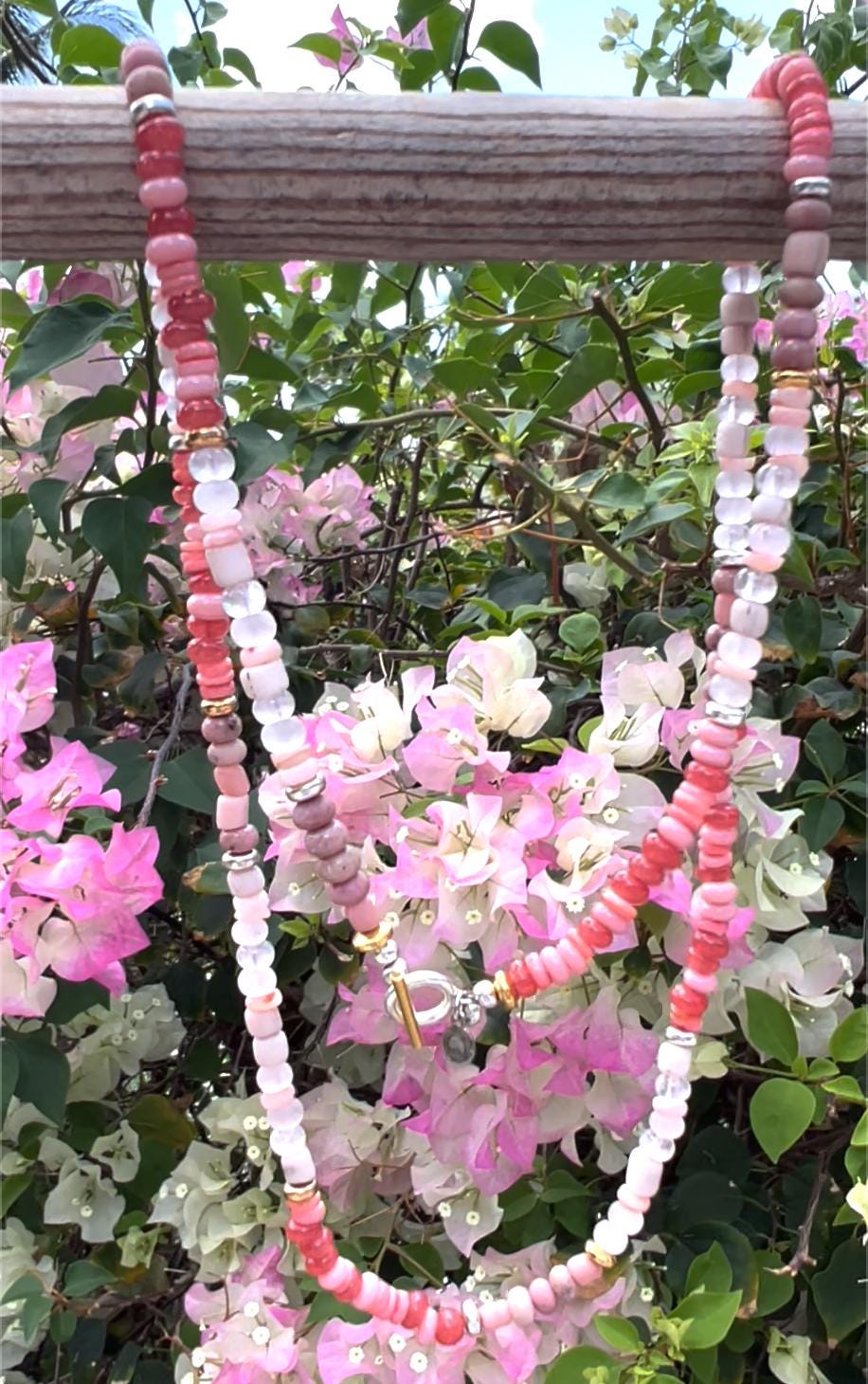 Hot pink, magenta & pale pink and lots of pink in between! mixed natural materials beaded necklace with silver and gold clasp is 31 inches in length and may be worn either long or doubled as a choker, with or without the clasp showing. Beads consist of sea shell, matte rose quartz, smooth rose quartz, wood rhodonite, pink rhodonite, Java glass, vintage Java glass, silver plate, gold plate. Clasp is silver plate and gold plate. This listing is for the pink necklace only; the charm pendant shown in some images may be found in my shop.