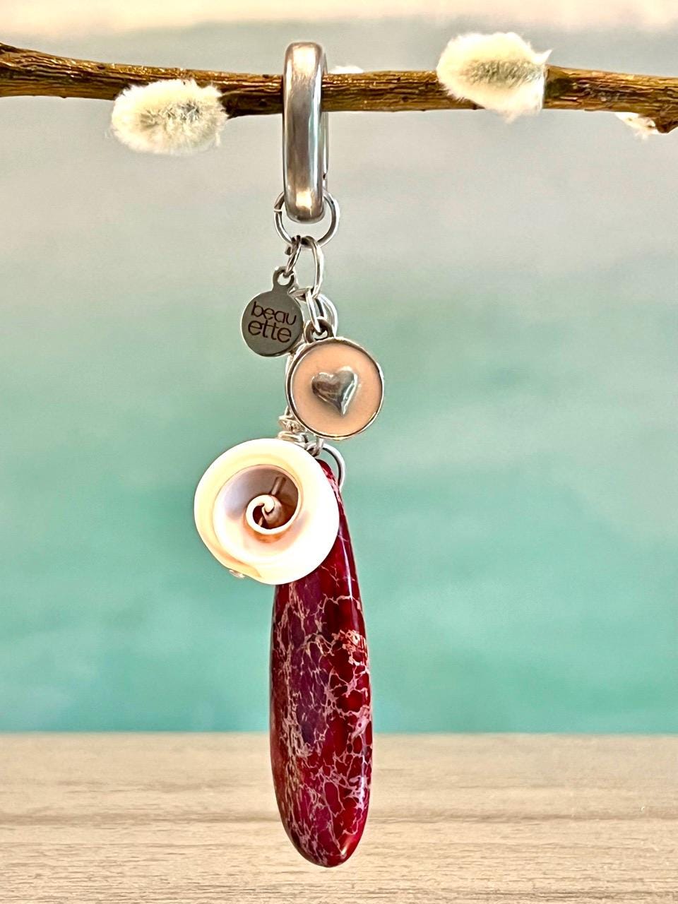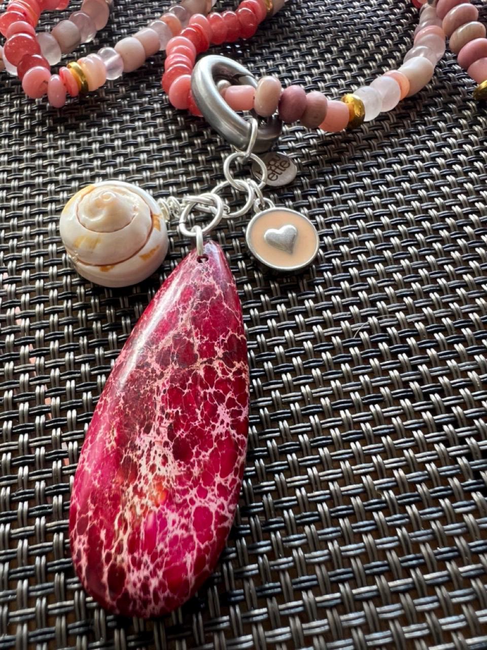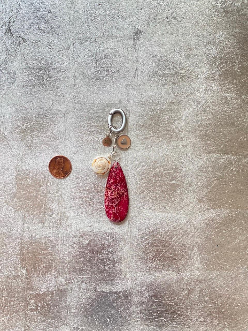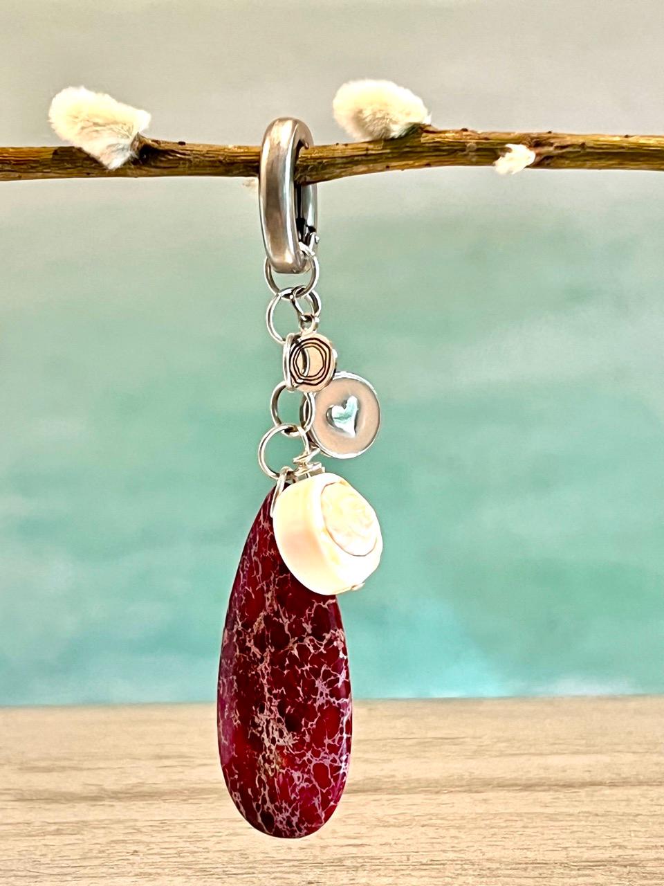 Pendant charms are a ruby impression jasper teardrop, enamel heart, Luhuanus Everlasting Shell and a silver tone beauette charm, each hung from small silver plated rings.