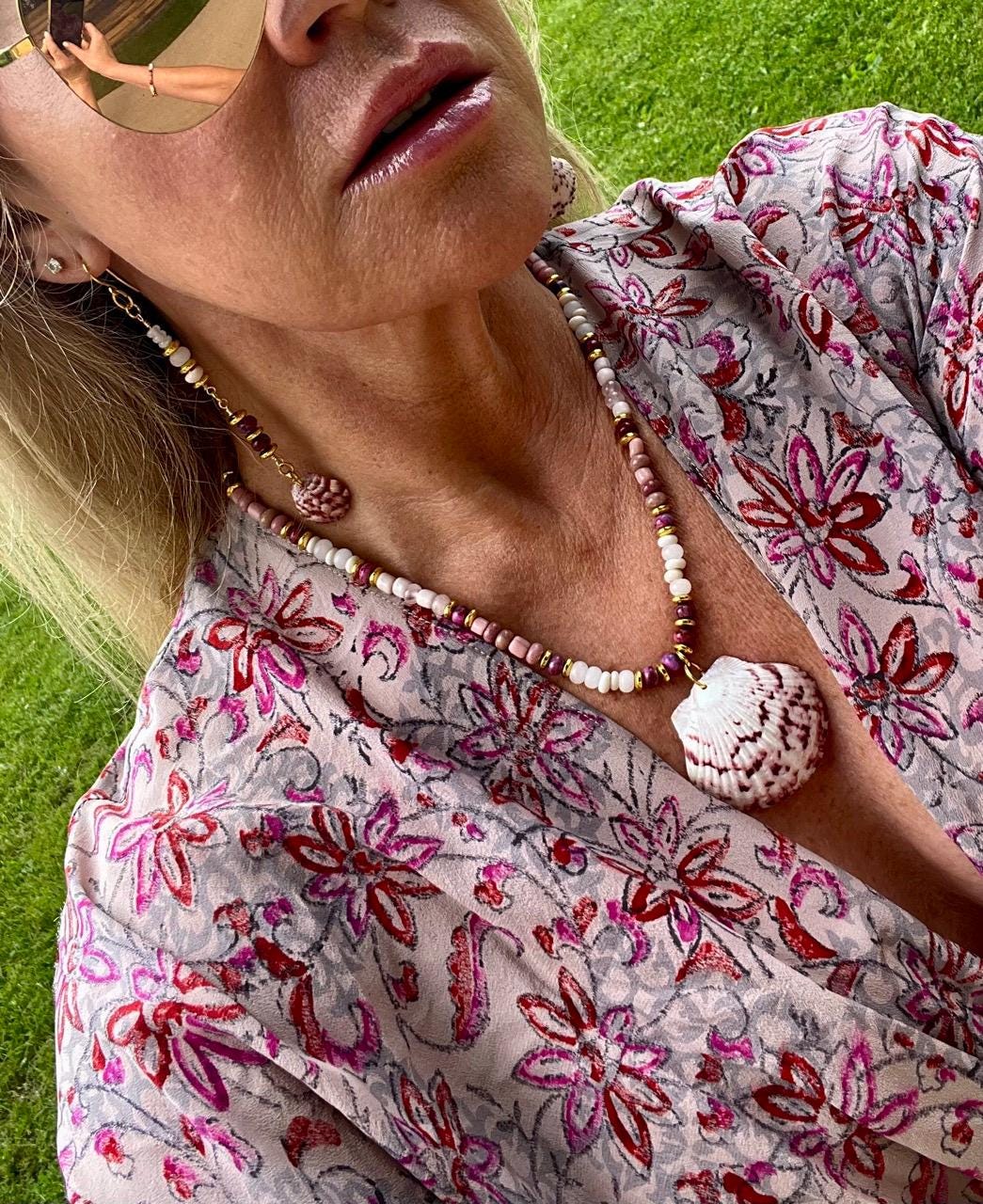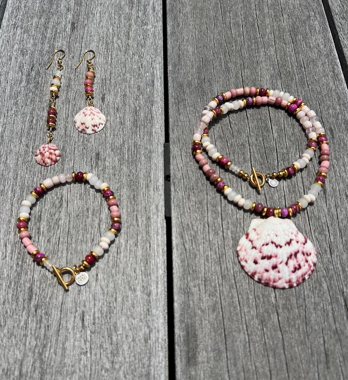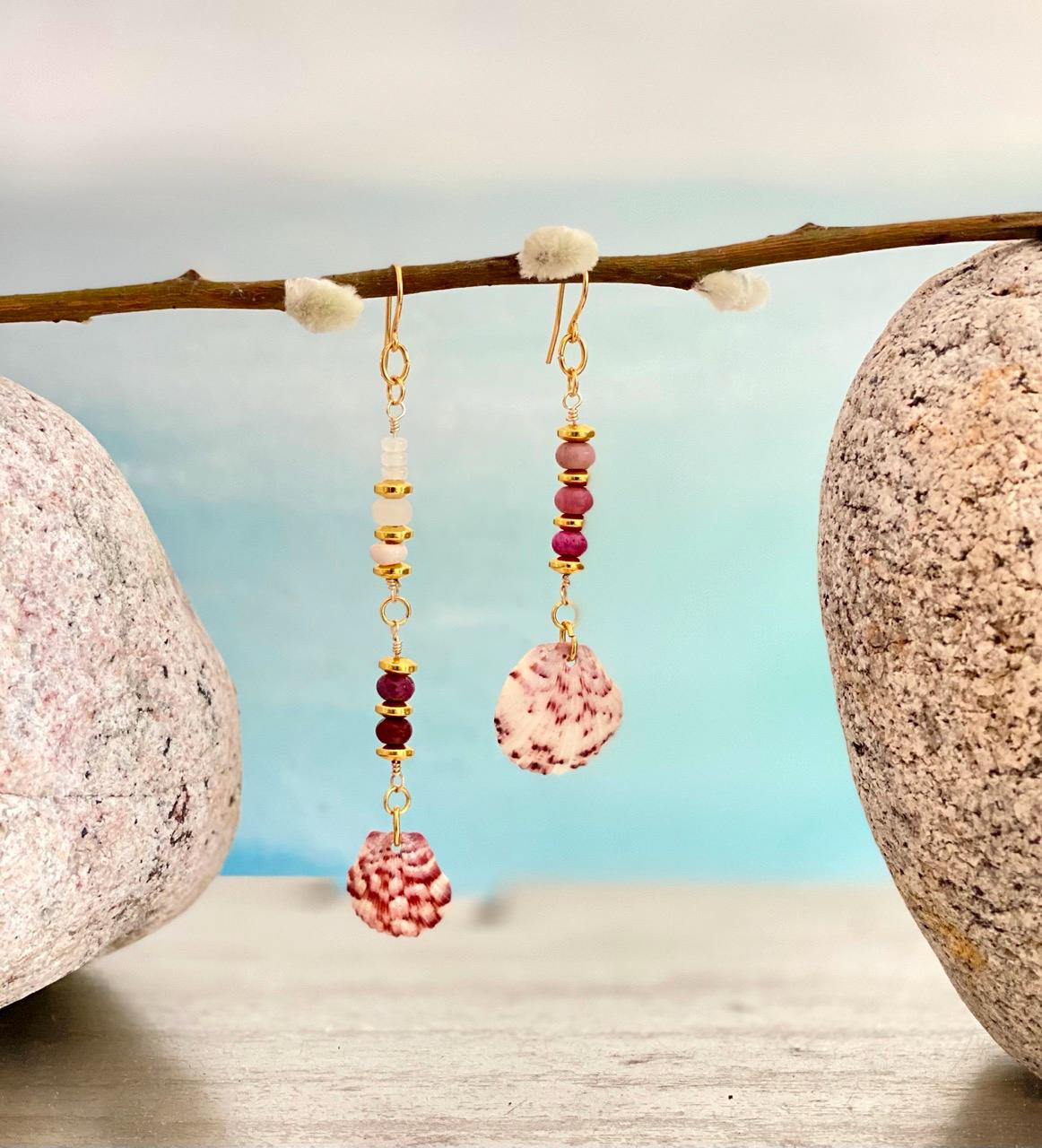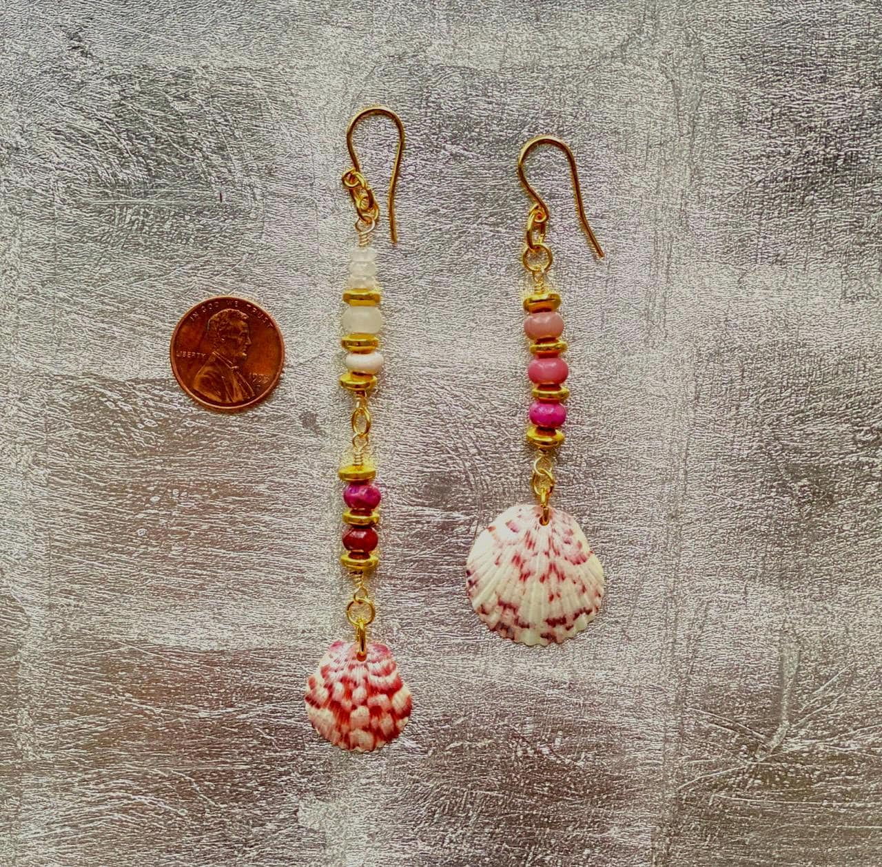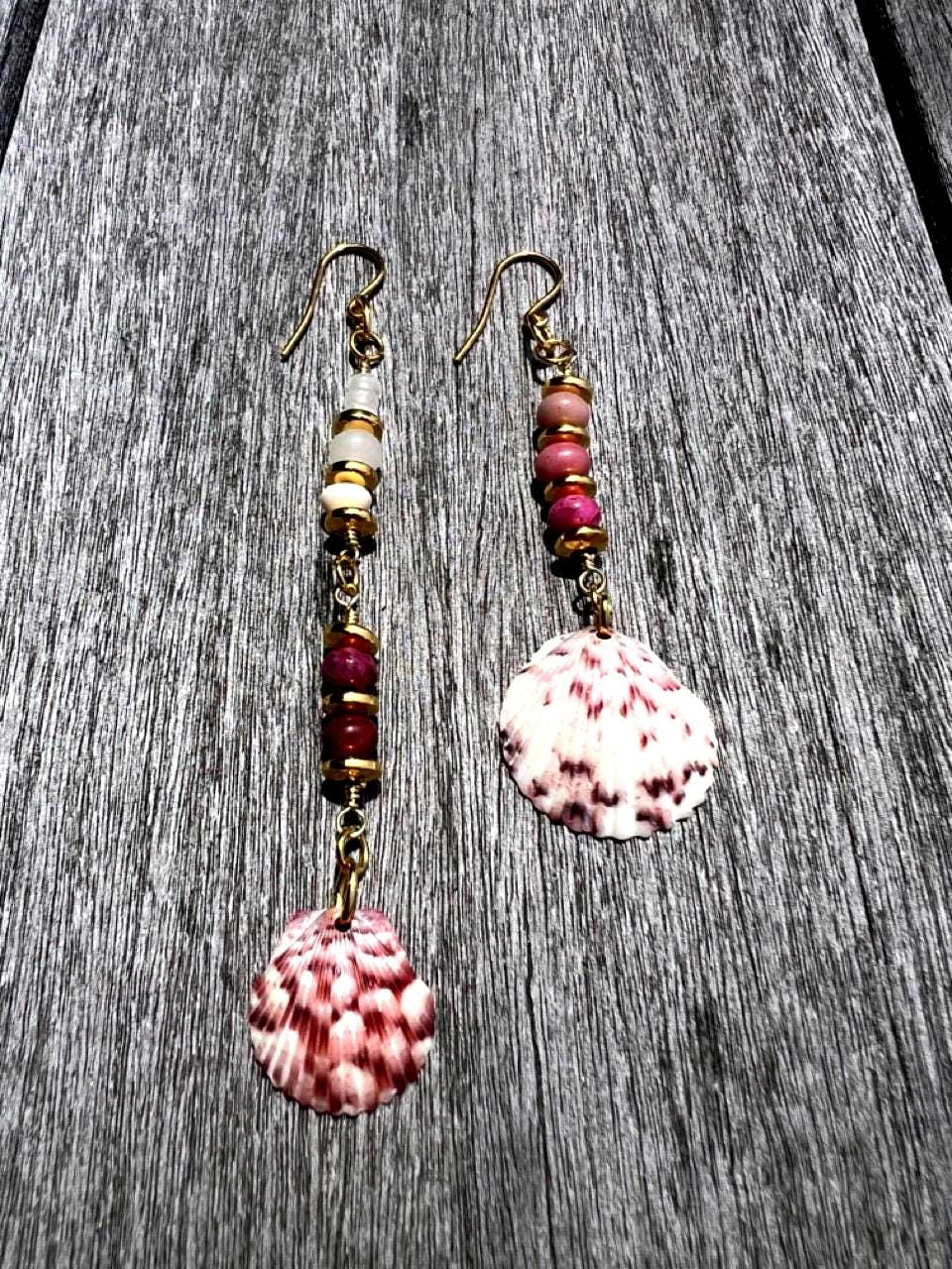These mismatched dangle earrings of gemstones, shells and gold-plate evoke tropical vacations and summer. The gemstones of pink rhodonite, ruby crazy lace agate and white jade tie in beautifully with the natural colors of the small calico seashells that dangle from the ends, and the gold finishes bring a sophisticated polish. The asymmetrical lengths (approximately 3" and 4" make them elegant and a just touch edgy. These earrings are beautiful on their own or as a set with the matching necklace https://www.etsy.com/listing/4317661135.