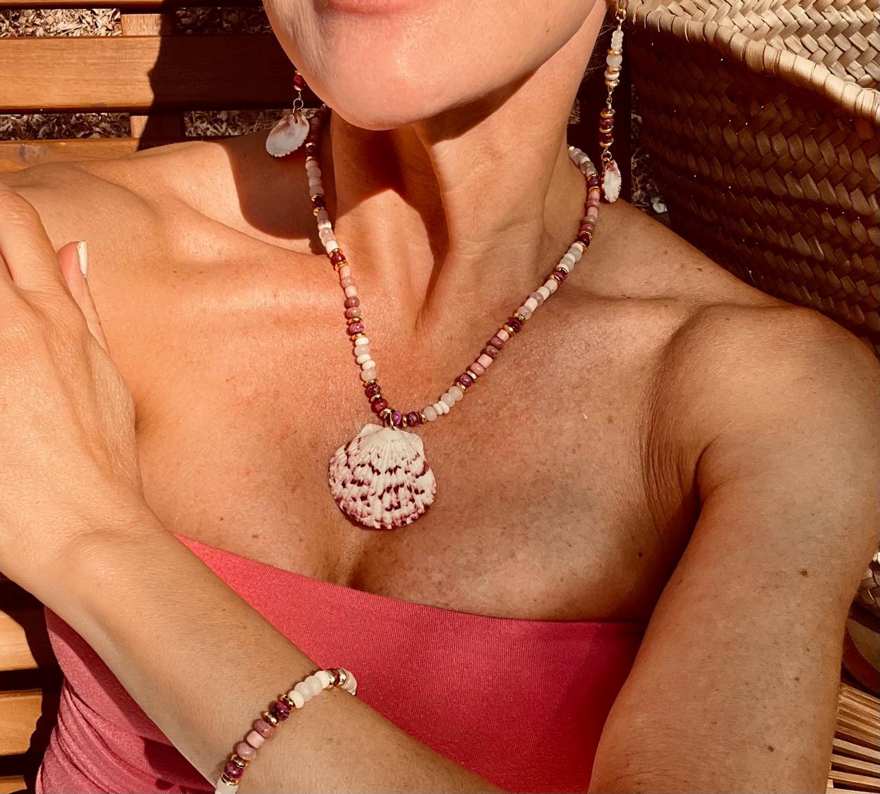 All jewelry is handmade of natural materials, by me, by the beach in California or by the mountains in Colorado. Packaging is compostable or recycled and/or recyclable. Items are shipped in an organic cotton jewelry bag, in a gift box with raffia ribbon and wood beads, ready for gifting to yourself or another.