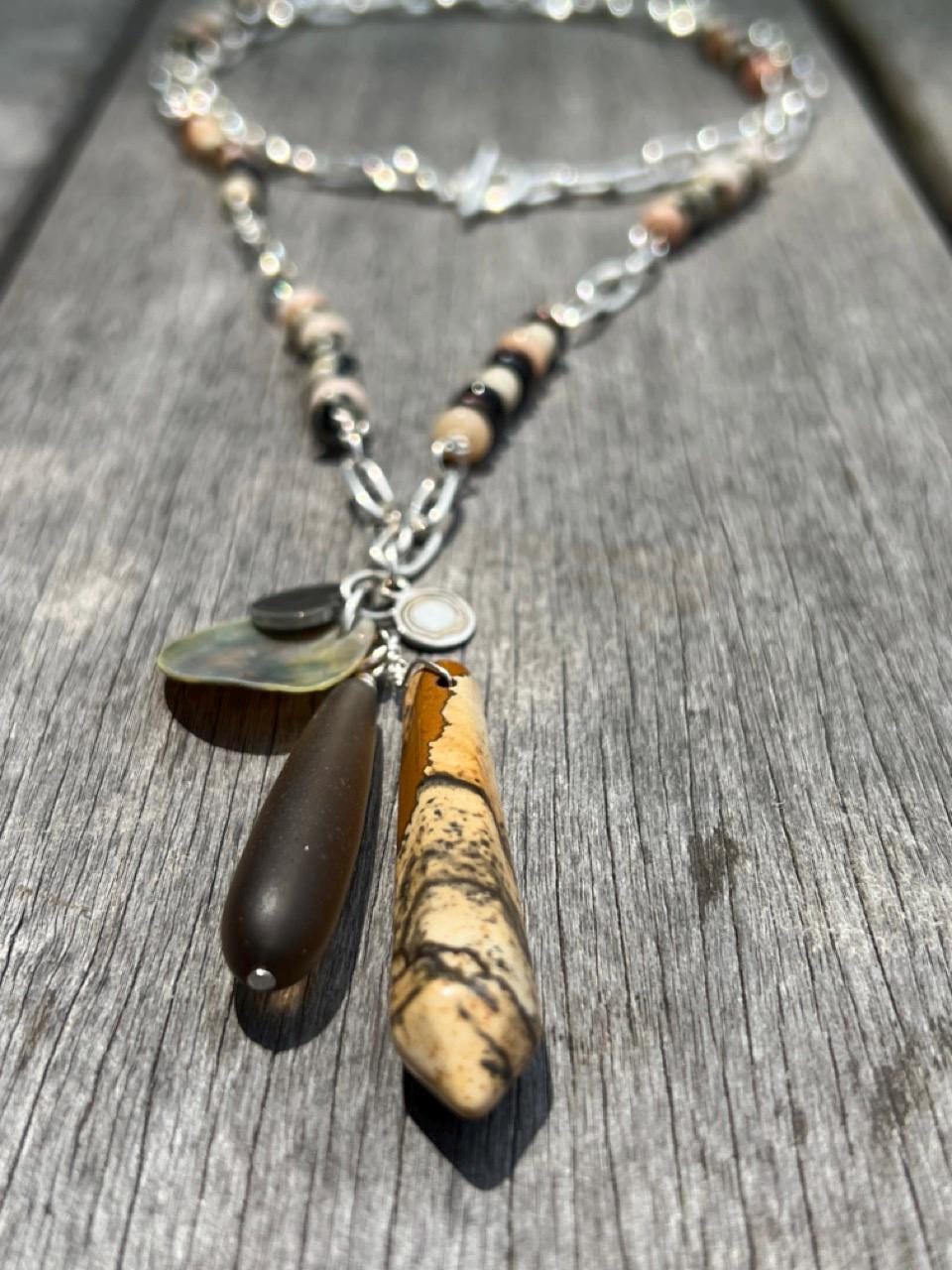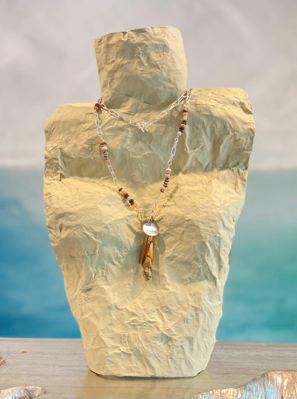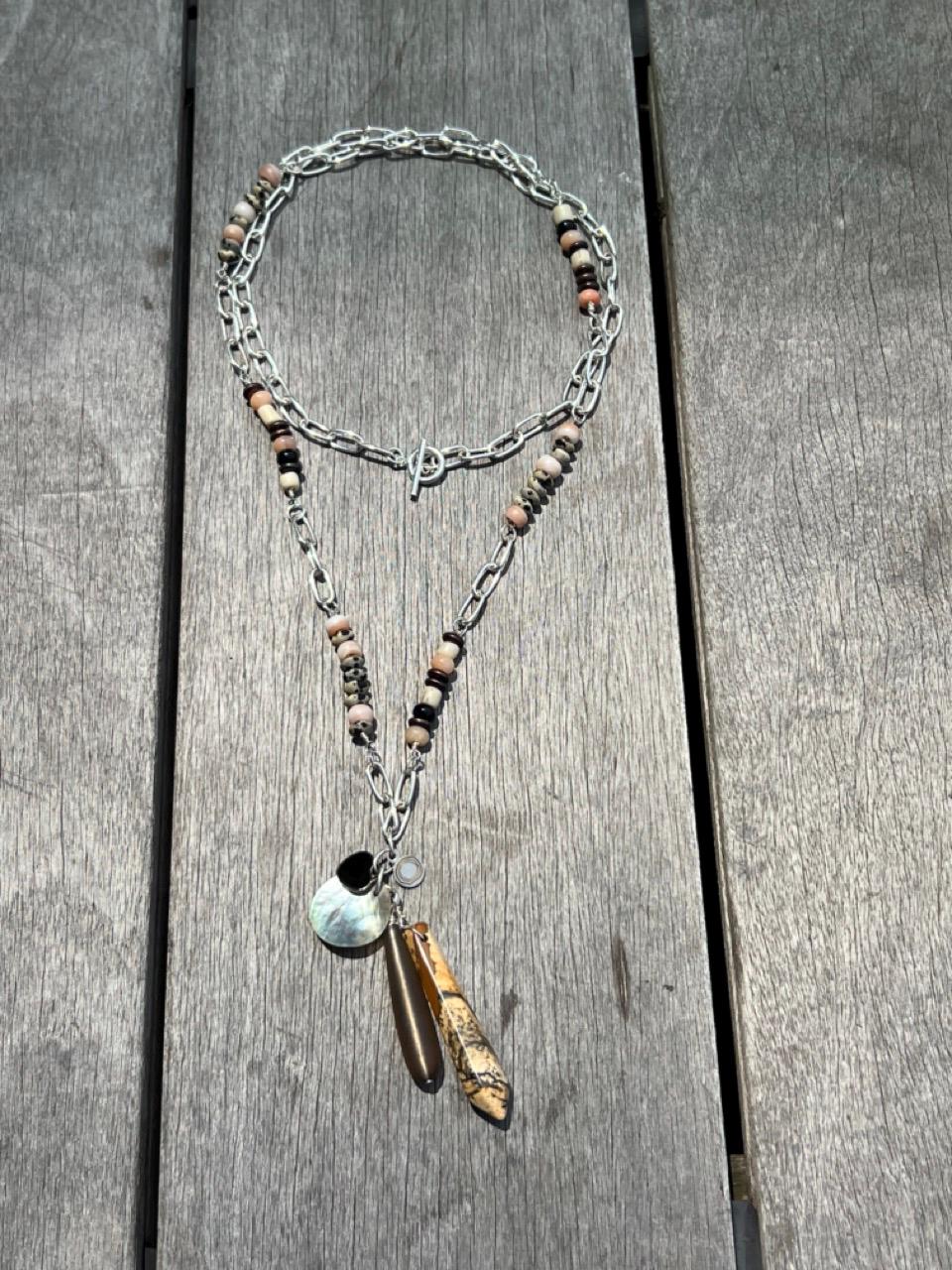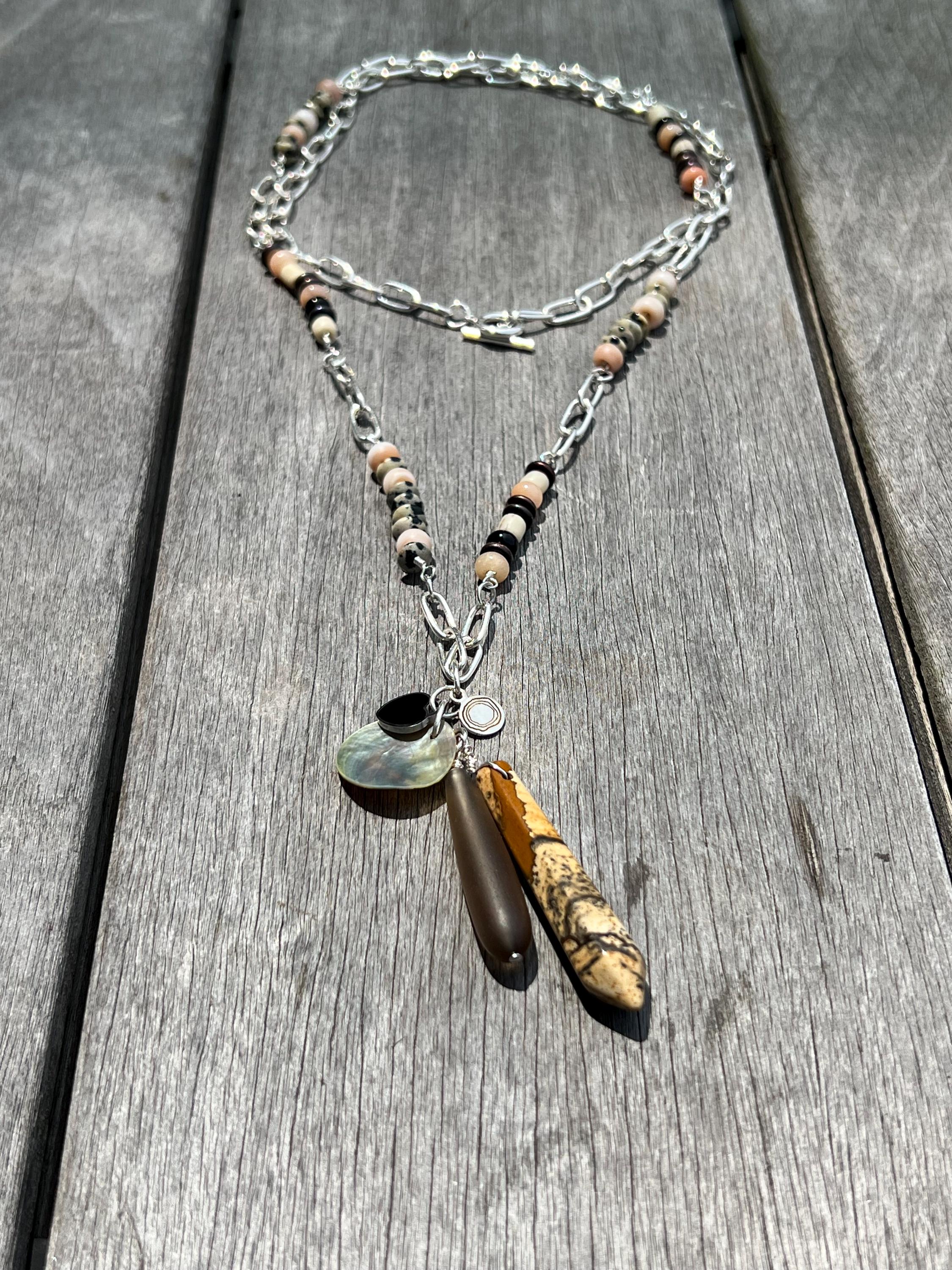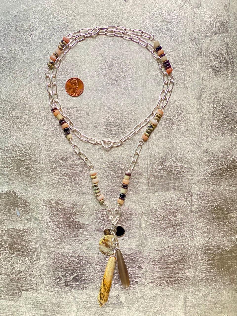 Approximately 34.75” long necklace plus 3.5” attached charm pendant. This long silverplated and bead necklace with attached pendant can be worn doubled or adjusted to many lengths in between as the toggle bar fits the chain links. The neutral colors in this necklace make it so versatile, upgrading any outfit with black, brown, white, peach/orange. Looks great with a bikini, a dress or a tee shirt and jeans. The beads are: Dalmatian Jasper, Onyx, Peach Aventurine, Antiqued Copper, Glass Padre beads and Java glass beads. The charm pendant is made up of a Picture Jasper spike, a shell coin, an enamel and silverplated heart charm, tumbled glass teardrop and rhodium plated beauette charm.