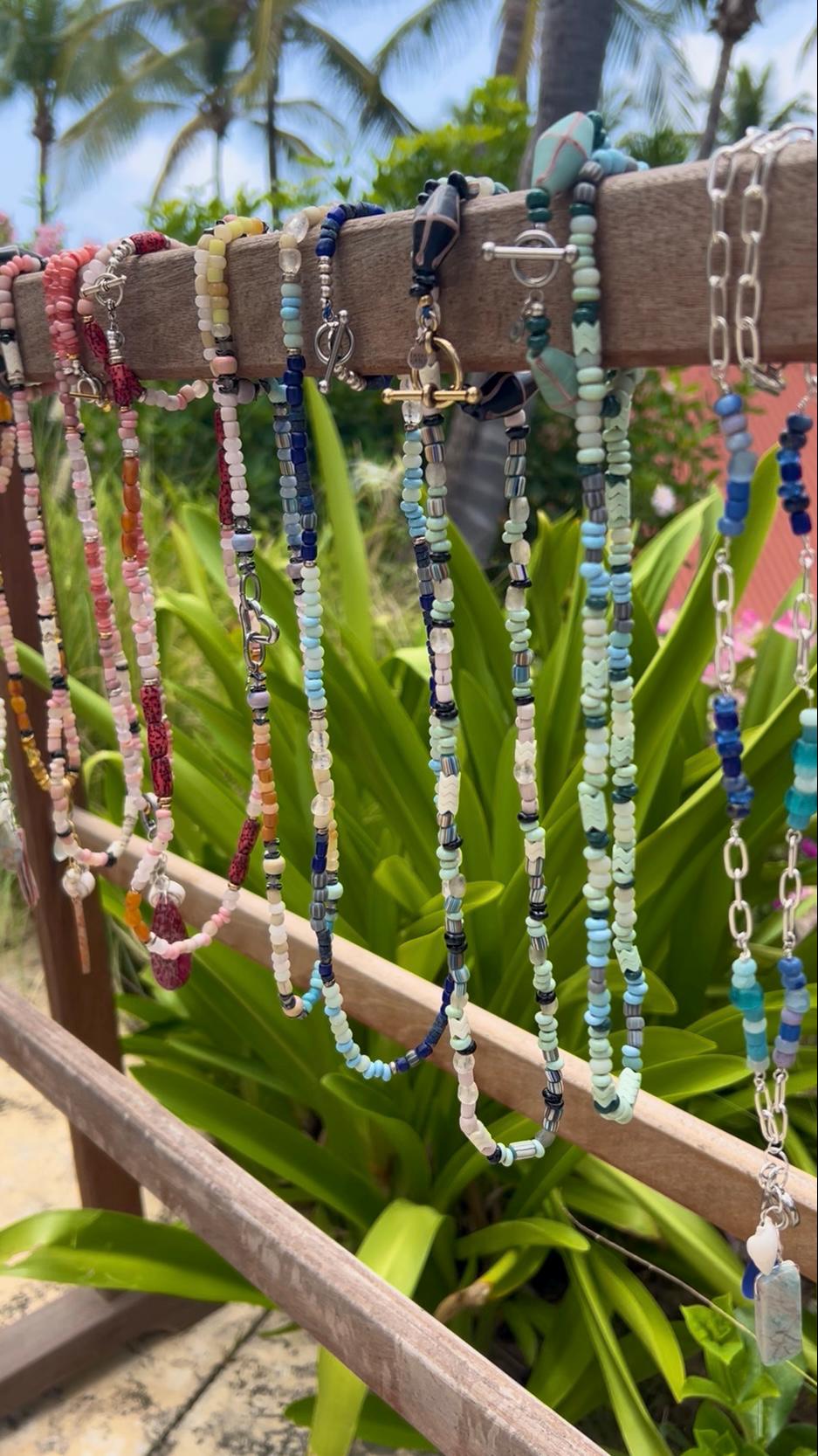 All jewelry is handmade of natural materials, by me, by the beach in California or by the mountains in Colorado. Packaging is compostable or recycled and/or recyclable. Items are shipped in an organic cotton jewelry bag, in a gift box with raffia ribbon and wood beads, ready for gifting to yourself or another.