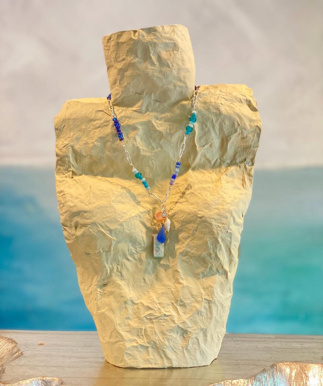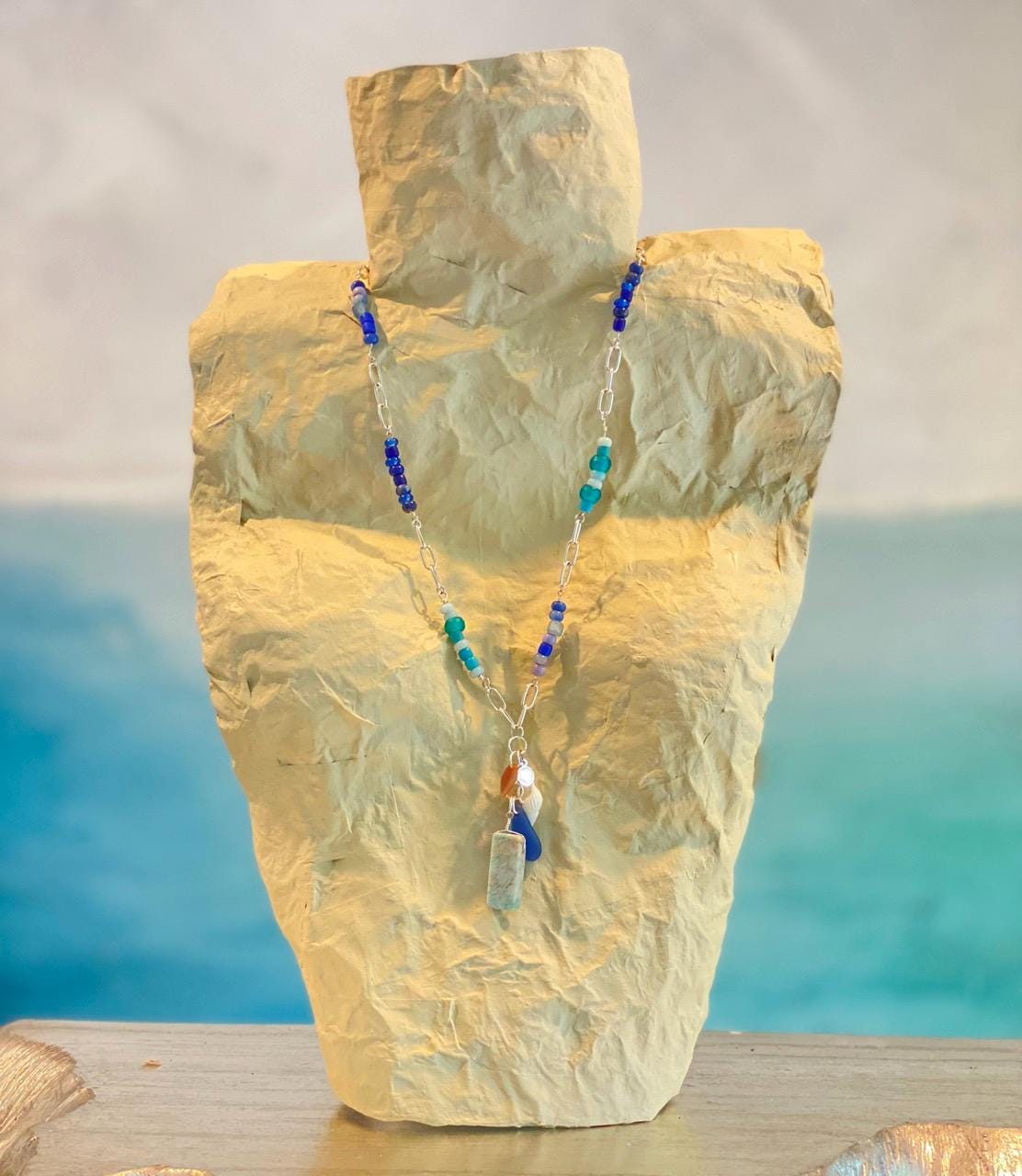 The beads on this silverplated paperclip chain necklace evoke all the magical shades of blue, turquoise, aqua and mint of the Caribbean Sea. Necklace length is approximately 26” plus a 2.75” pendant. Made of Silverplated chain, Lapis Lazuli, Amazonite, Sodalite, Glass beads of Java glass, Vintage Turkana beads, Padre beads, and recycled glass. Charm contains Amazonite, white Nassa shell, pink shell and rhodium plated Beauette charm. More necklaces and jewelry available in my shop.