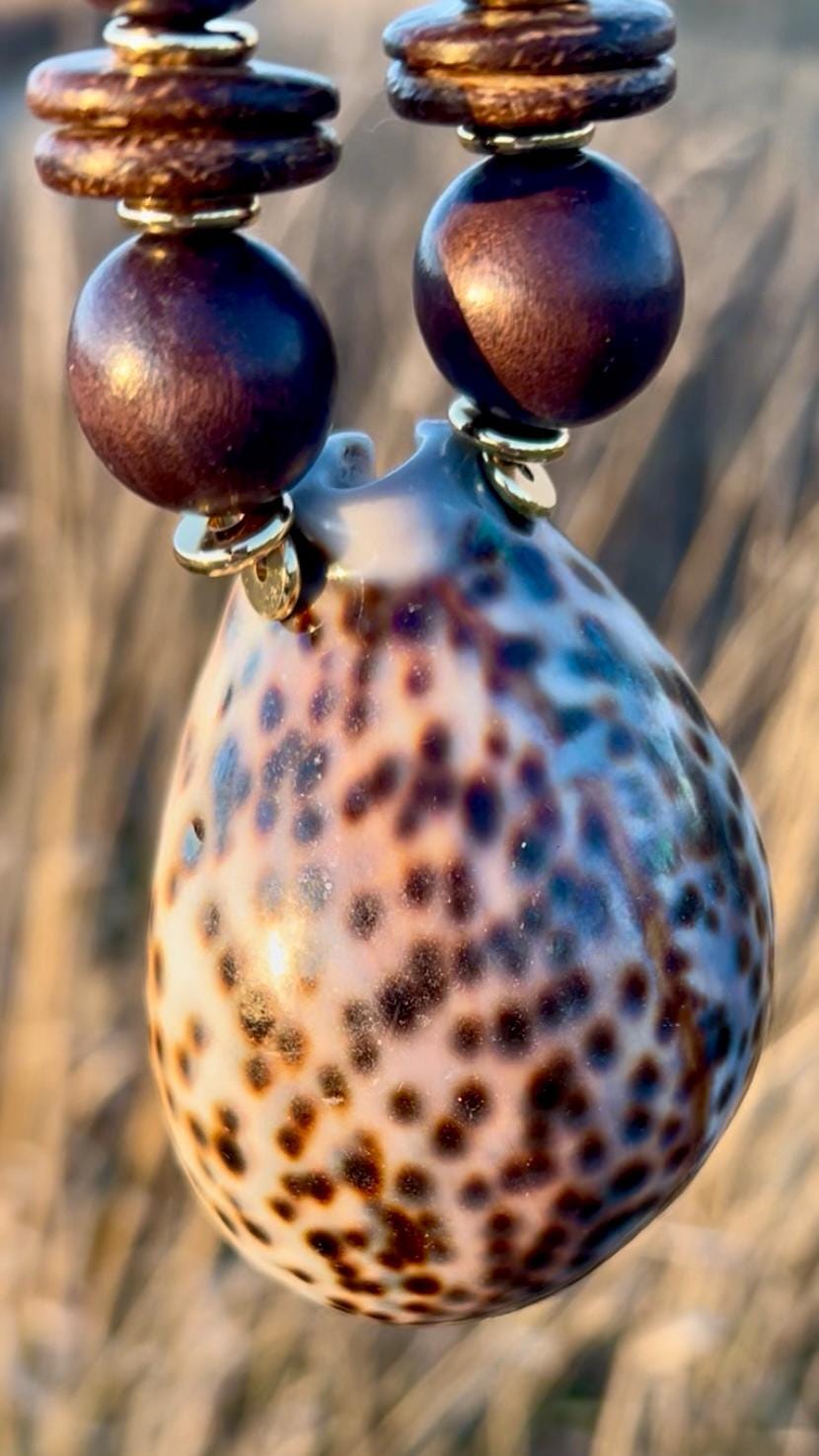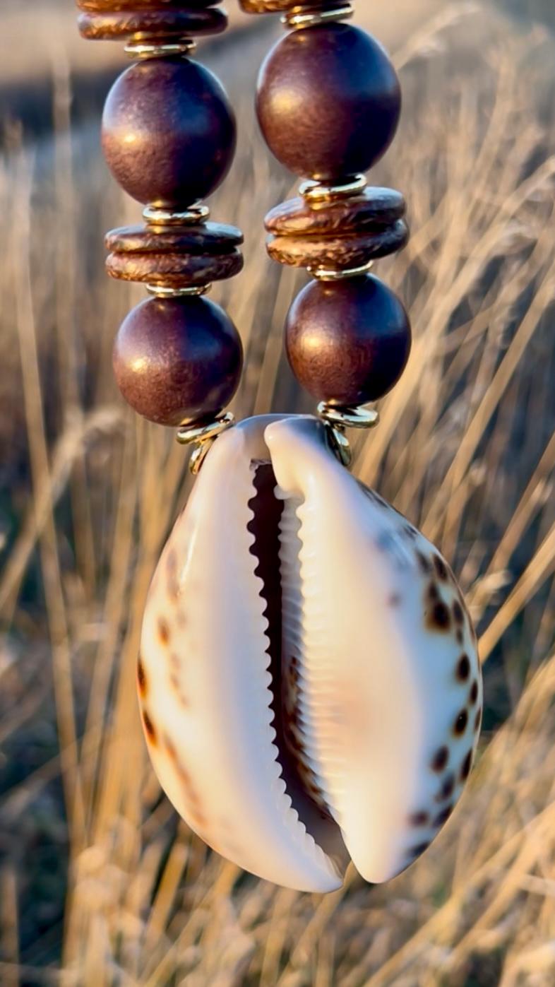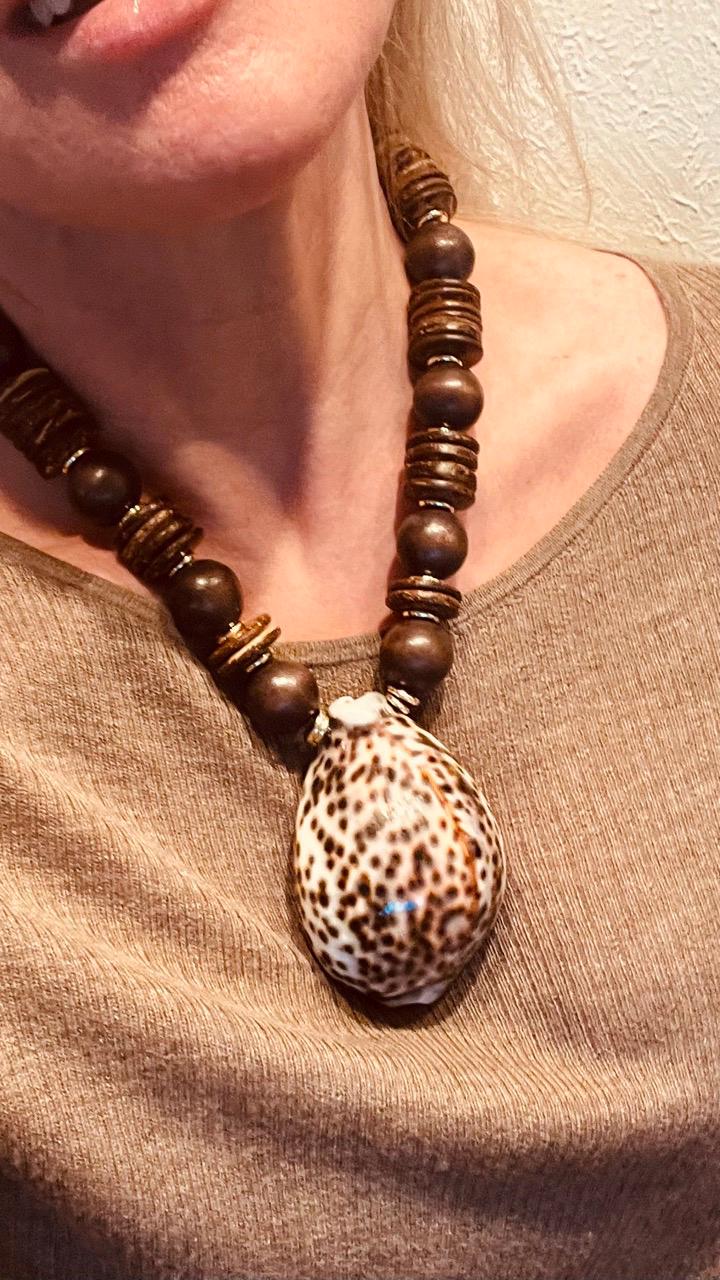 Thanks to the dark brown shades in this oversized shell statement necklace, it works surprisingly well with your Fall outfits, as well as your tropical vacation plans. It features a large cowrie shell (approximately 3.5" x 2.25") suspended between gold-filled beads, wood balls and coconut disks. The necklace is adjustable from approximately 18" up to 20" so that it can be worn as a choker or a medium length pendant necklace. Finished with gold-plated chain with a gold-plated lobster clasp.