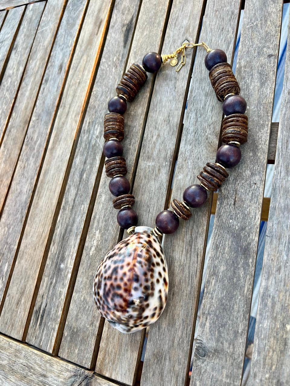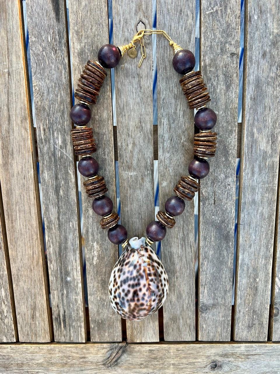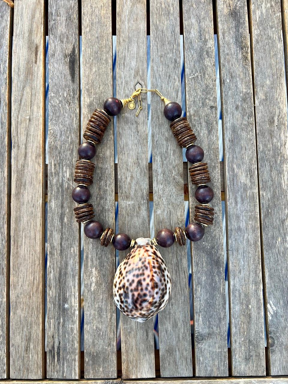 Thanks to the dark brown shades in this oversized shell statement necklace, it works surprisingly well with your Fall outfits, as well as your tropical vacation plans. It features a large cowrie shell (approximately 3.5" x 2.25") suspended between gold-filled beads, wood balls and coconut disks. The necklace is adjustable from approximately 18" up to 20" so that it can be worn as a choker or a medium length pendant necklace. Finished with gold-plated chain with a gold-plated lobster clasp.
