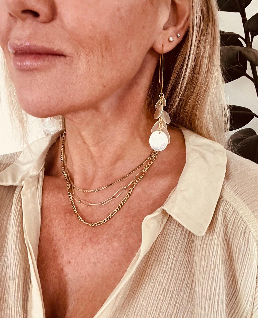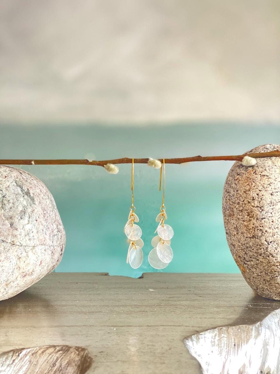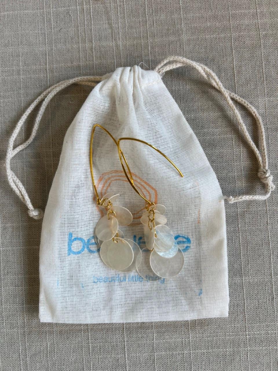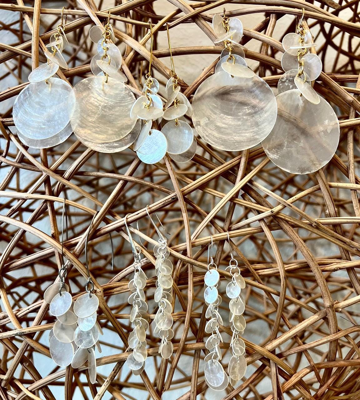 These make a great gift; they've been very popular in my shop, and you can see the 5-star review for the silver pair. They are surprisingly flattering-- popping just where your jawline starts to narrow, framing your face in a very attractive way. Also amazing about these earrings-- they weigh practically nothing but still provide a lot of impact. The shells jingle lightly when you move, creating a pleasing and festive sound. They are comprised of capiz shells individually linked together by hand with gold plated oval rings. They are approximately 3.75" long and .75" - 1" at their widest point (depending on what position they're in.) I have many other styles of dangly capiz shell earrings in my shop.