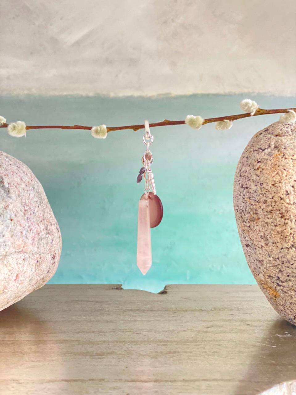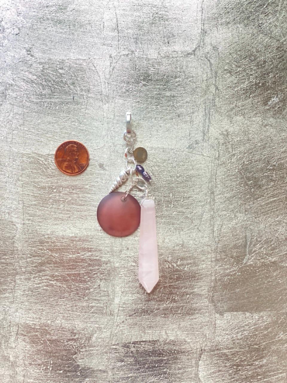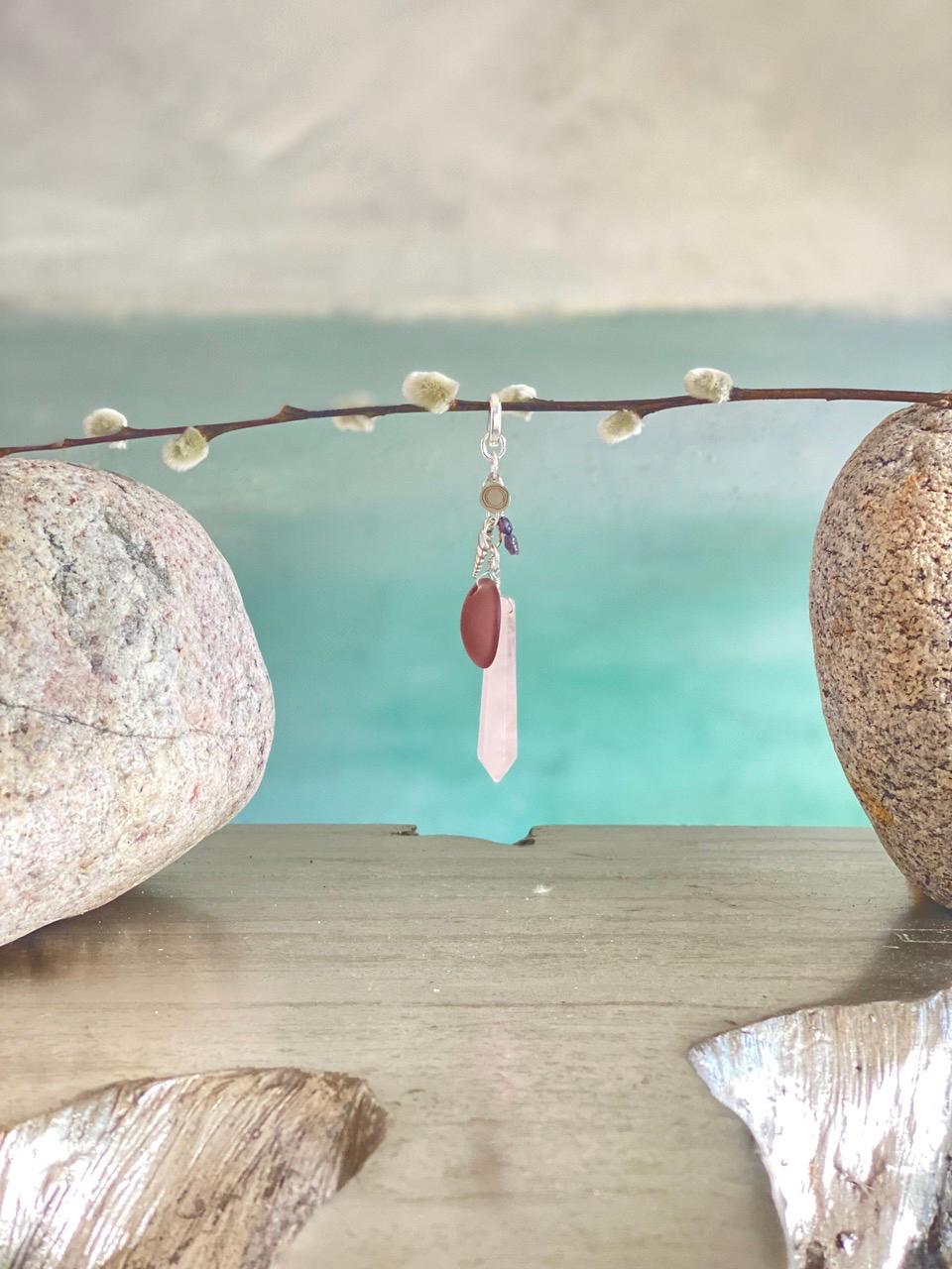 This unique pendant hangs from a small silver-plated hinge clasp so that you can wear it on your own chain or cord or on one of the beaded necklaces in my shop (sold separately). Total length approx. 4.25". The clasp can slide over a piece up to 6mm in diameter or opened and clipped to a chain up to 1mm diameter. The charms are a rose quartz spike, a silver plated horn shell shaped charm, 2 dark Japanese river pearls, a sea glass disc and a Beauette brand charm, each hung from silver plated rings. All jewelry is handmade of natural materials, by me, by the beach in California or by the mountains in Colorado. Packaging is compostable or recycled and/or recyclable. Items are shipped in an organic cotton jewelry bag, with a care card, in a gift box with raffia ribbon and wood beads, ready for gifting to yourself or another.