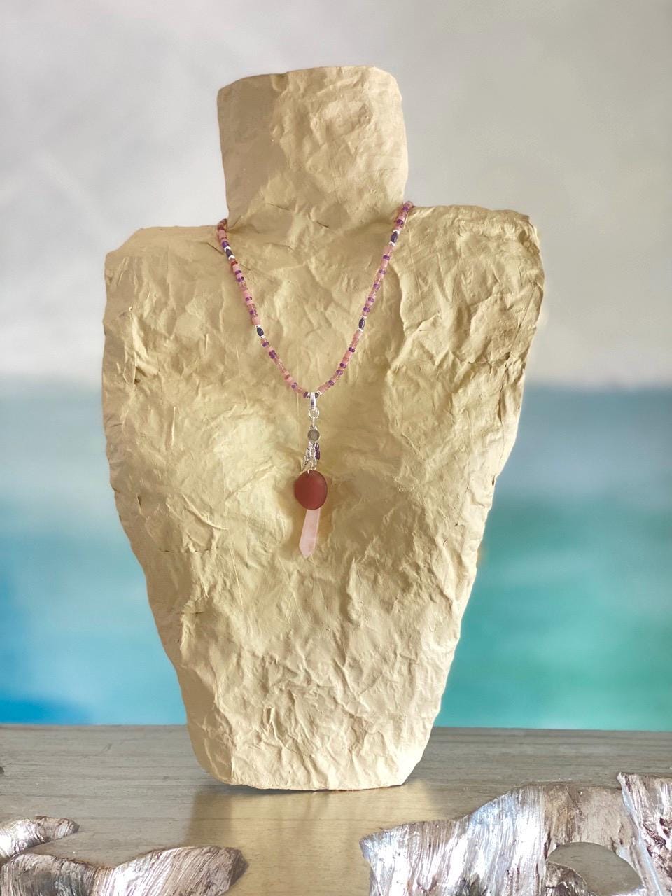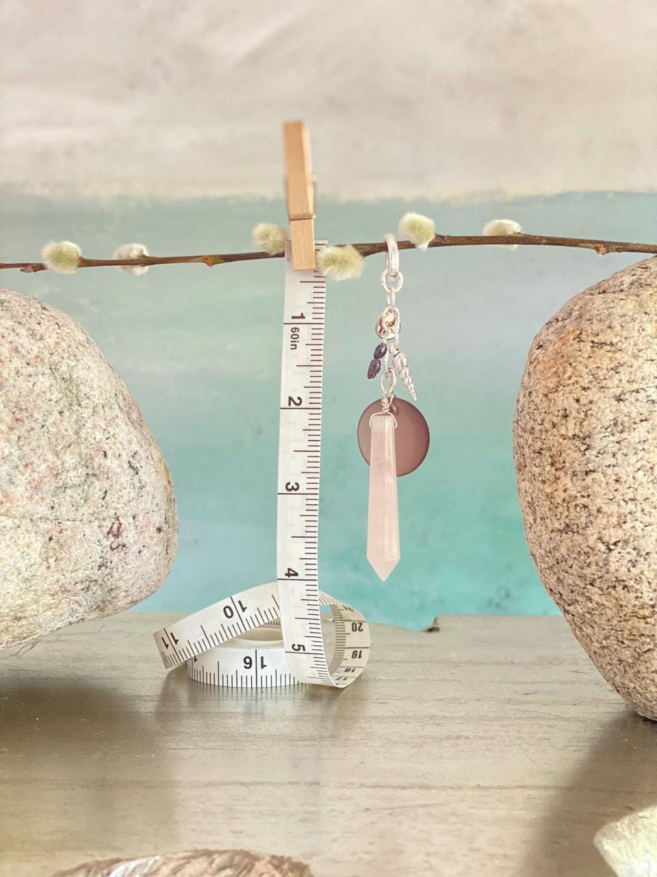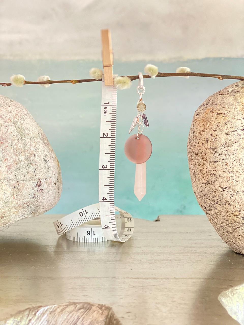 This unique pendant hangs from a small silver-plated hinge clasp so that you can wear it on your own chain or cord or on one of the beaded necklaces in my shop (sold separately). Total length approx. 4.25". The clasp can slide over a piece up to 6mm in diameter or opened and clipped to a chain up to 1mm diameter. The charms are a rose quartz spike, a silver plated horn shell shaped charm, 2 dark Japanese river pearls, a sea glass disc and a Beauette brand charm, each hung from silver plated rings. All jewelry is handmade of natural materials, by me, by the beach in California or by the mountains in Colorado. Packaging is compostable or recycled and/or recyclable. Items are shipped in an organic cotton jewelry bag, with a care card, in a gift box with raffia ribbon and wood beads, ready for gifting to yourself or another.