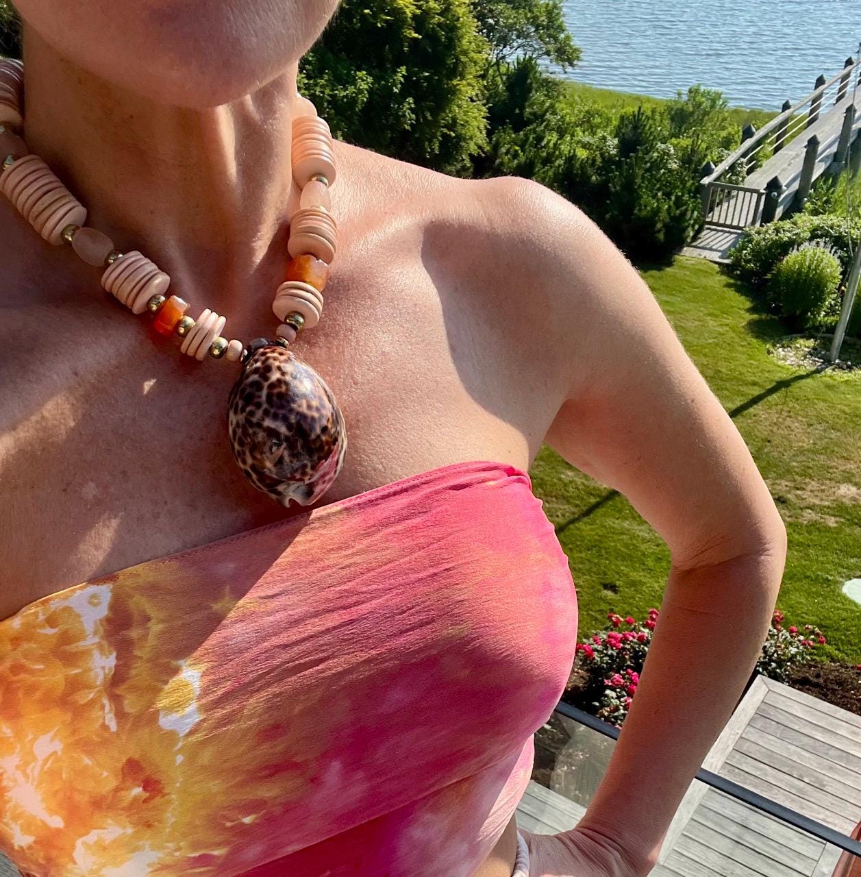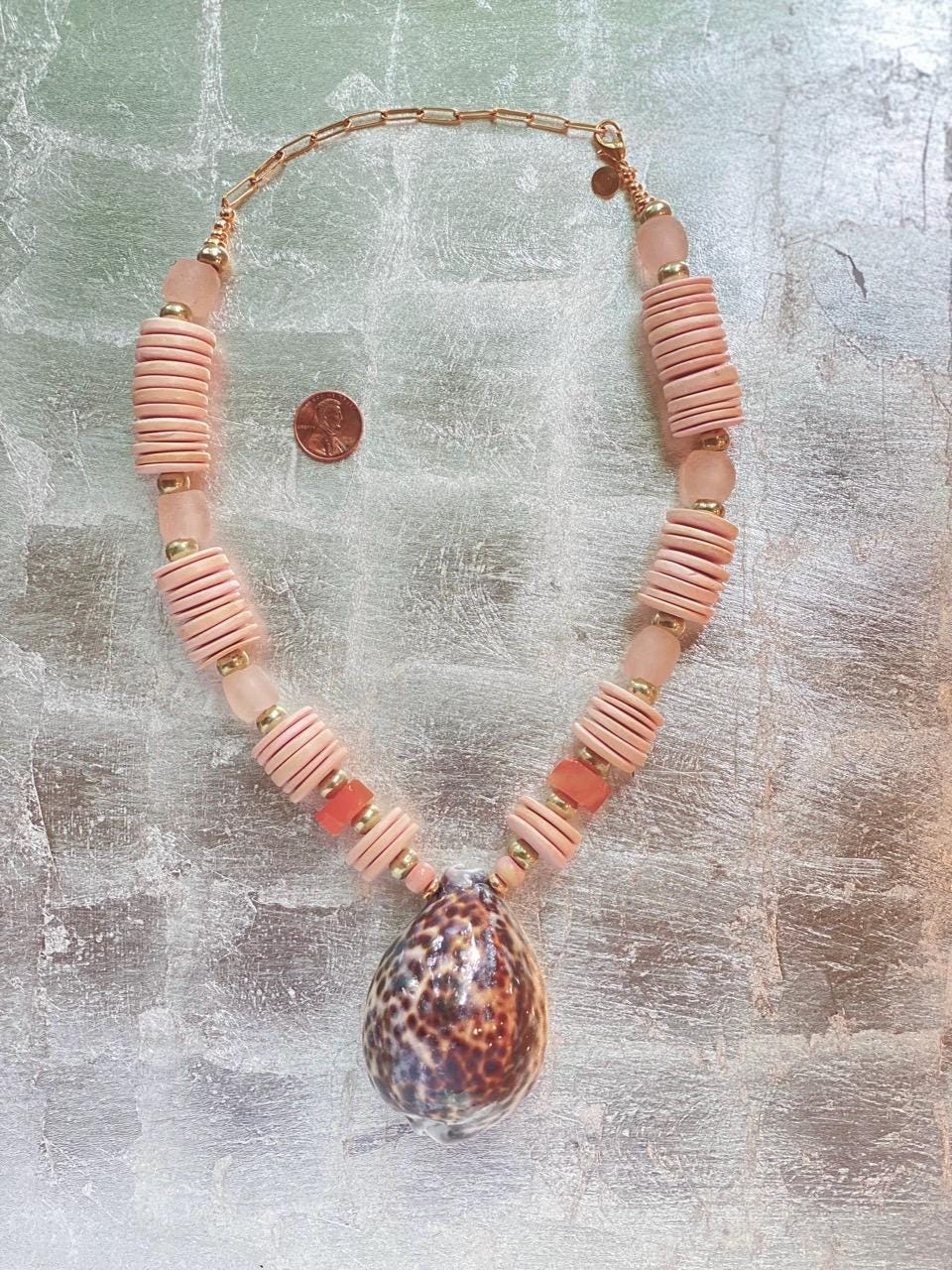 One of kind statement necklace, adjustable length. This has been a popular style in my shop, and you can find two, 5-star reviews for this style in my review section. Extra-large tiger cowrie shell suspended between beads of gold plate, brass, coconut shell, orange carnelian and recycled glass. Gold filled lobster claw clasp attaches to gold plated paperclip chain in the back allowing you to wear the necklace at multiple lengths between 18"- 22". The shell pendant is approx. 2" wide by 3" long.