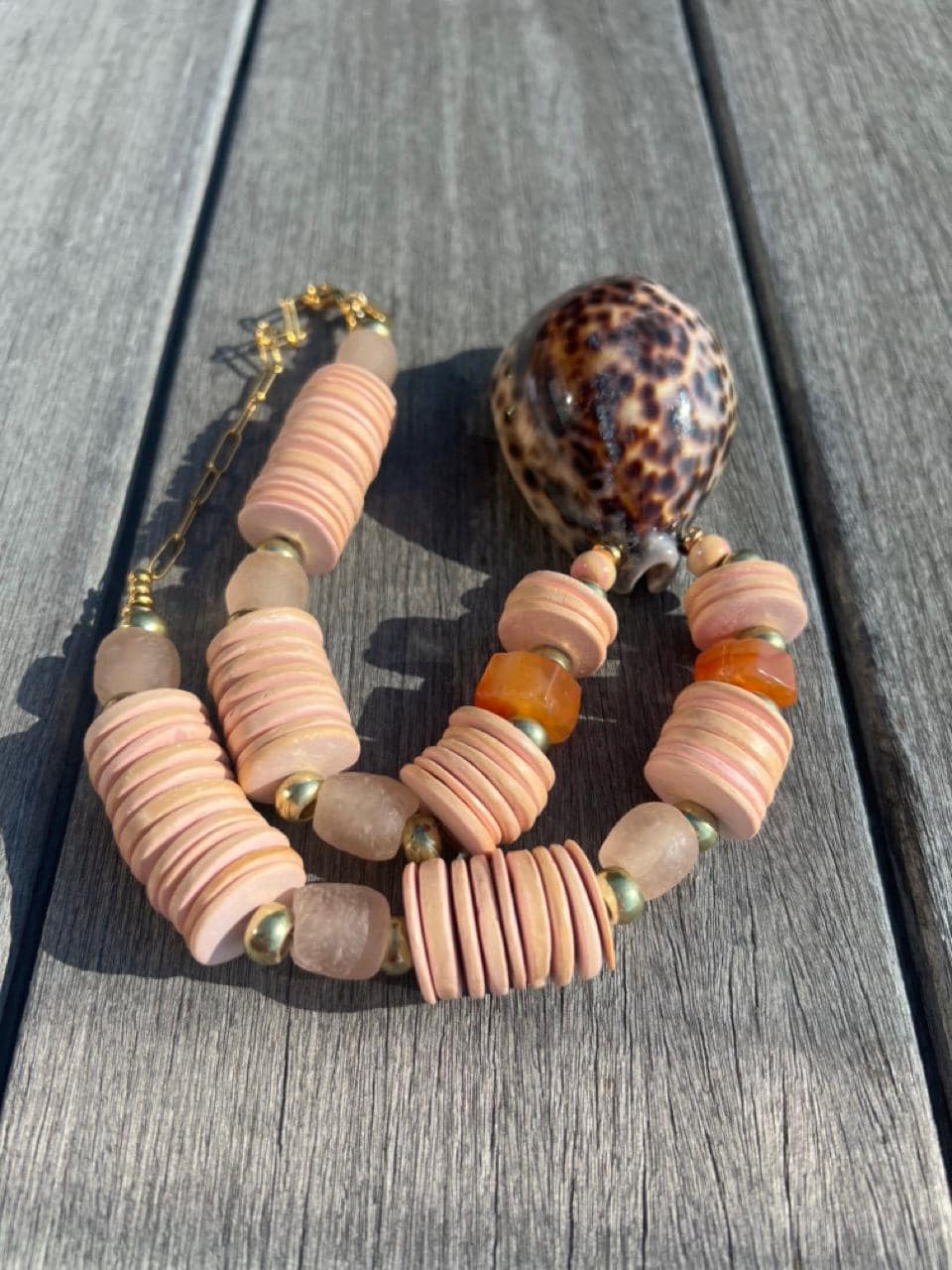 All jewelry is handmade of natural materials, by me, by the beach in California or by the mountains in Colorado or wherever I happen to be traveling. Packaging is compostable or recycled and/or recyclable. Items are shipped in an organic cotton jewelry bag, with a care card, in a gift box with raffia ribbon and wood beads, ready for gifting to yourself or another.