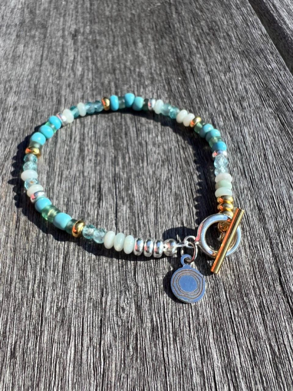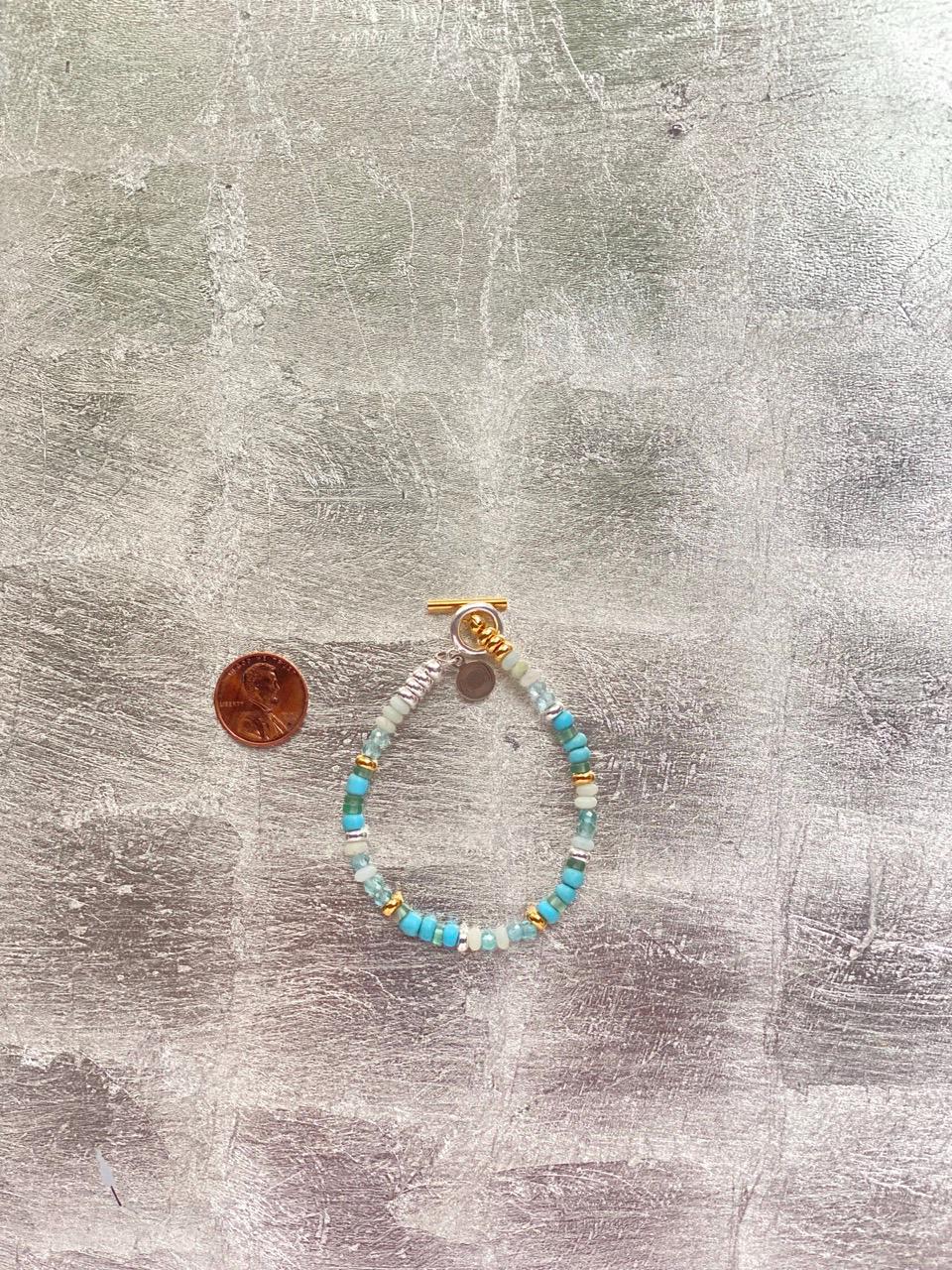 Elegant little bracelet, handmade, one of a kind, made of small 4mm diameter beads of Amazonite, Green Apatite, Green Aventurine and Java glass with accents of silver plate and gold plate. 7" in length. There is also a matching necklace available in my shop.