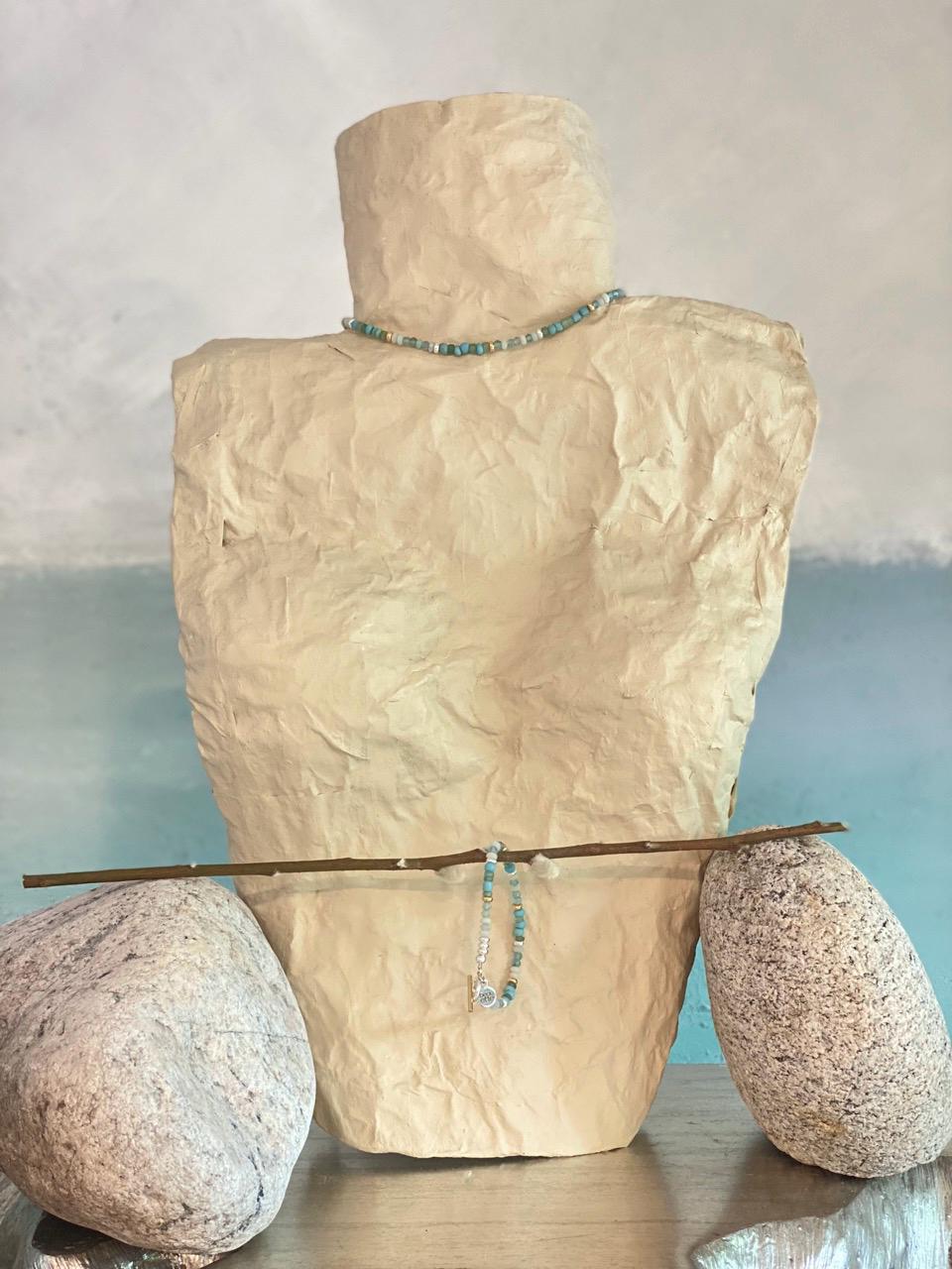 All jewelry is handmade of natural materials, by me, by the beach in California or by the mountains in Colorado or wherever I happen to be traveling. Packaging is compostable or recycled and/or recyclable. Items are shipped in an organic cotton jewelry bag, with a care card, in a gift box with raffia ribbon and wood beads, ready for gifting to yourself or another.