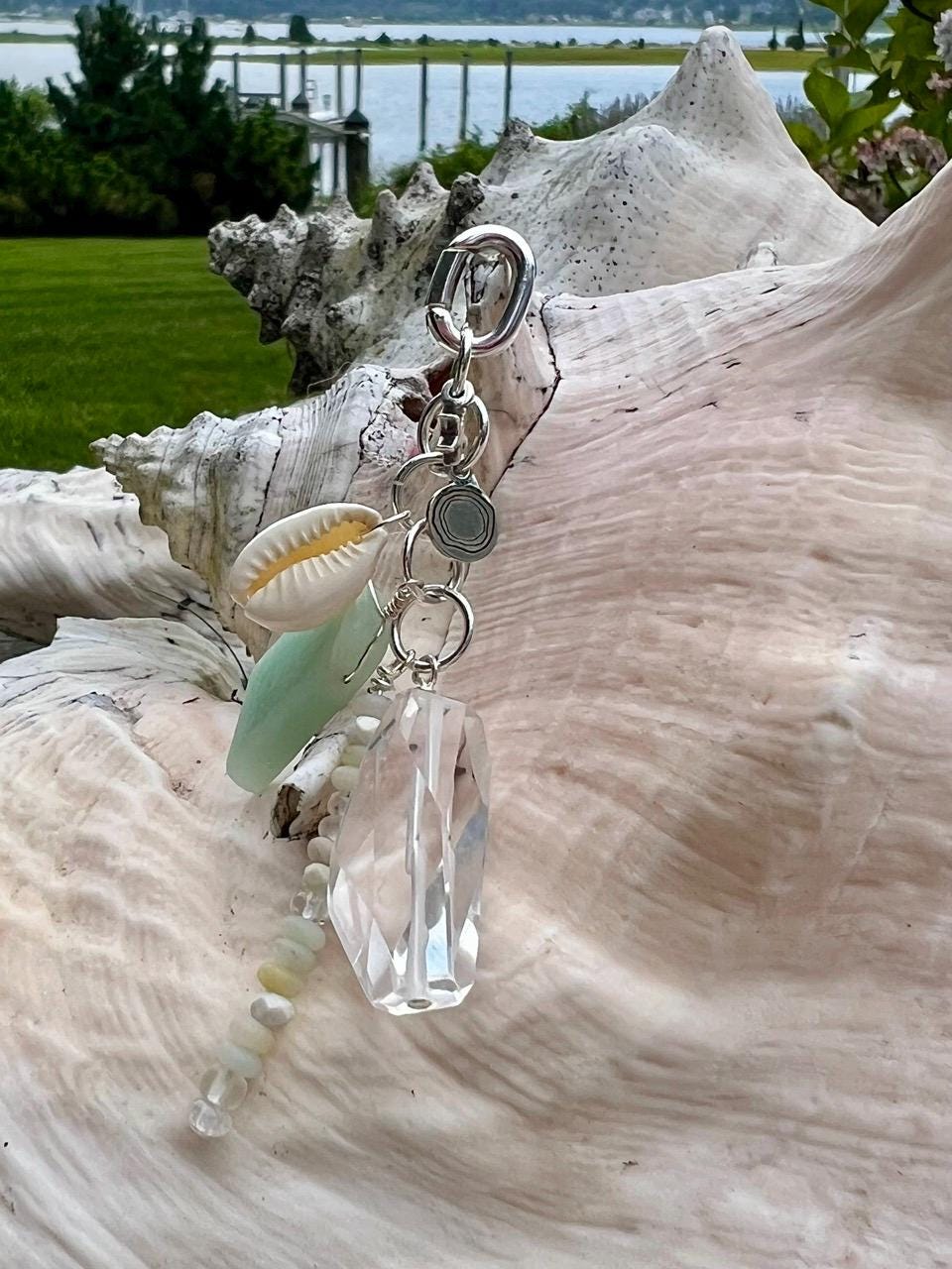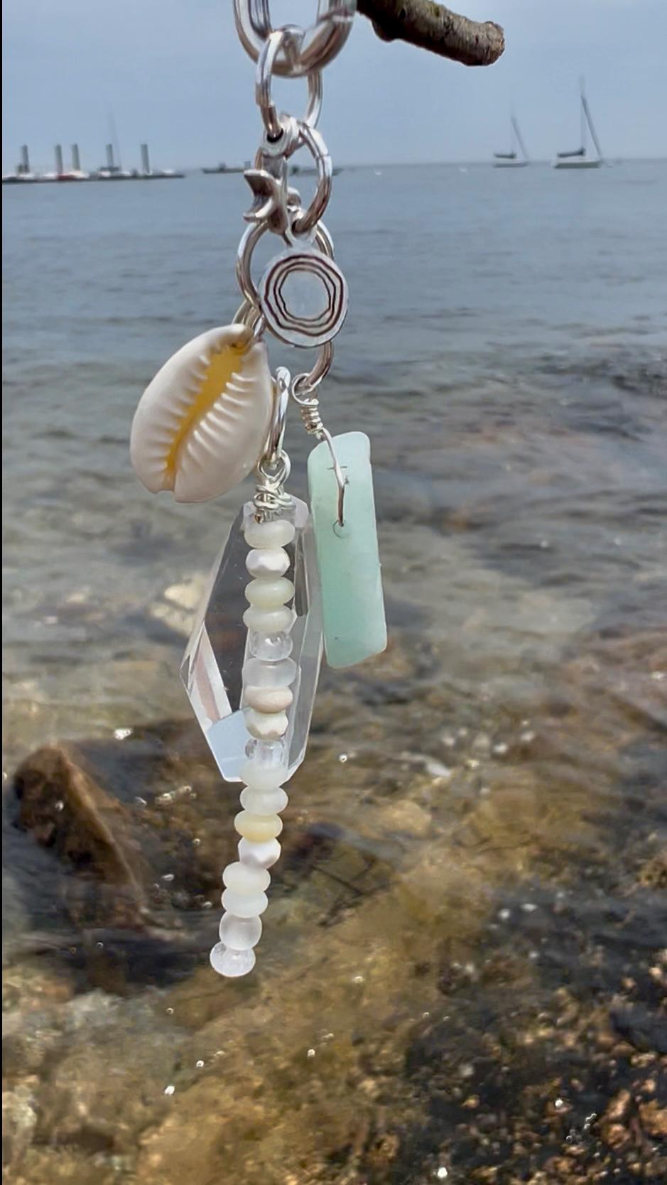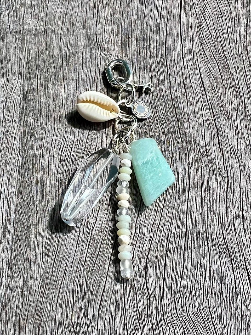 This charm pendant comes on a silver plated oval hinge clasp so that it can be attached to a variety of things including necklaces, bags, and phones. The charms are a large gem of clear quartz, a piece of amazonite, a small cowrie shell, a spear of layered tiny beads of amazonite, magnesite, clear crystal and matte glass from Ghana, a silverplated starfish and a rhodium Beauette brand charm, all linked together on silver plated rings. It pairs perfectly with the matching chain/beaded necklace https://www.etsy.com/listing/4337782961 available separately in my shop. The pendant hangs 3.5" long and about 1.5" at its widest point. The interior of the clasp is 5mm, for sliding on, and the opening of the hinge is 2MM, for clipping on.