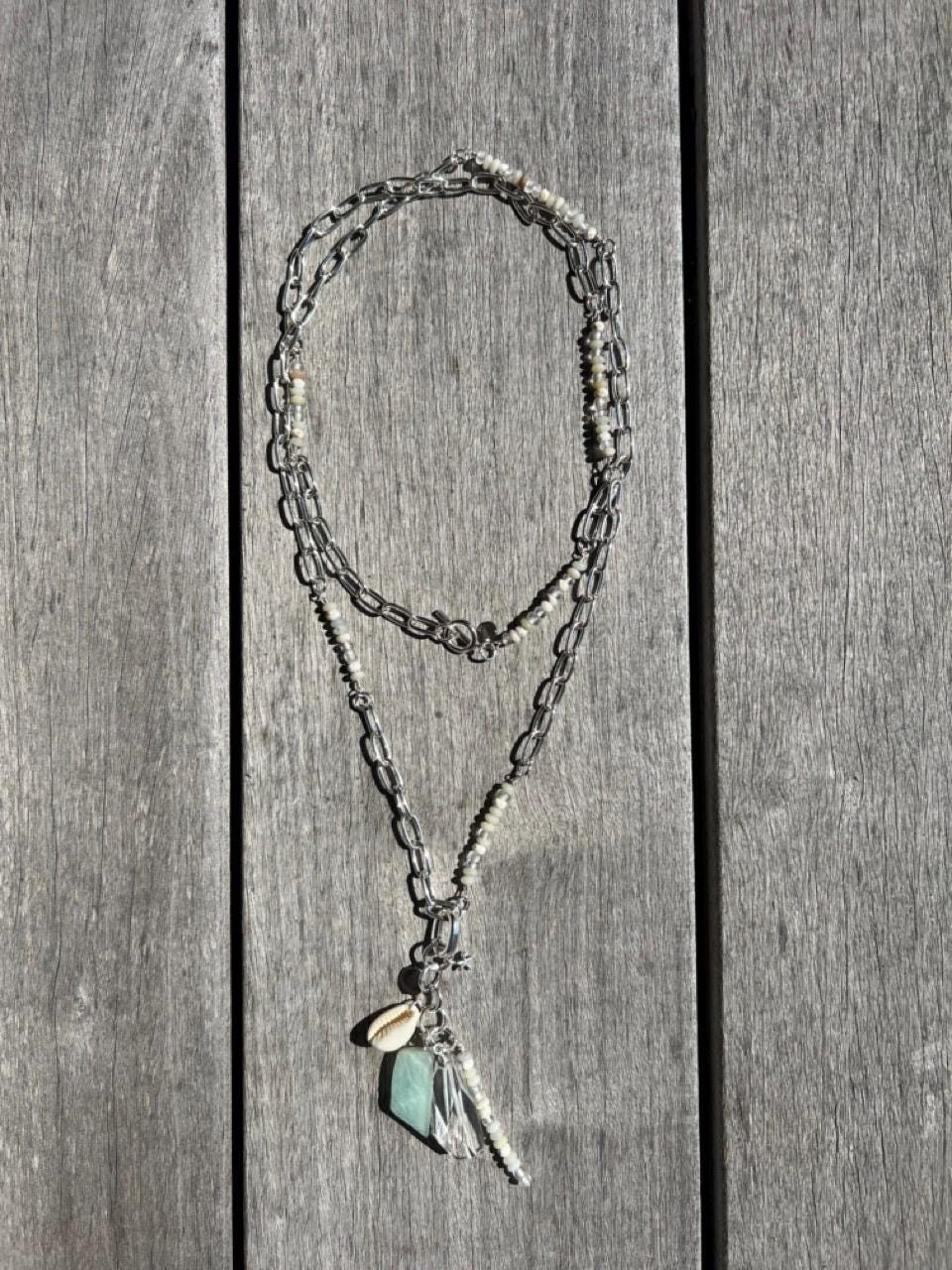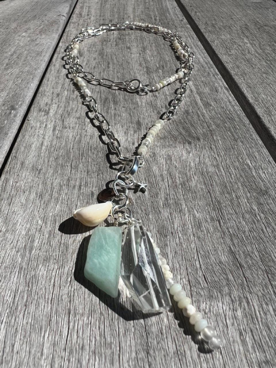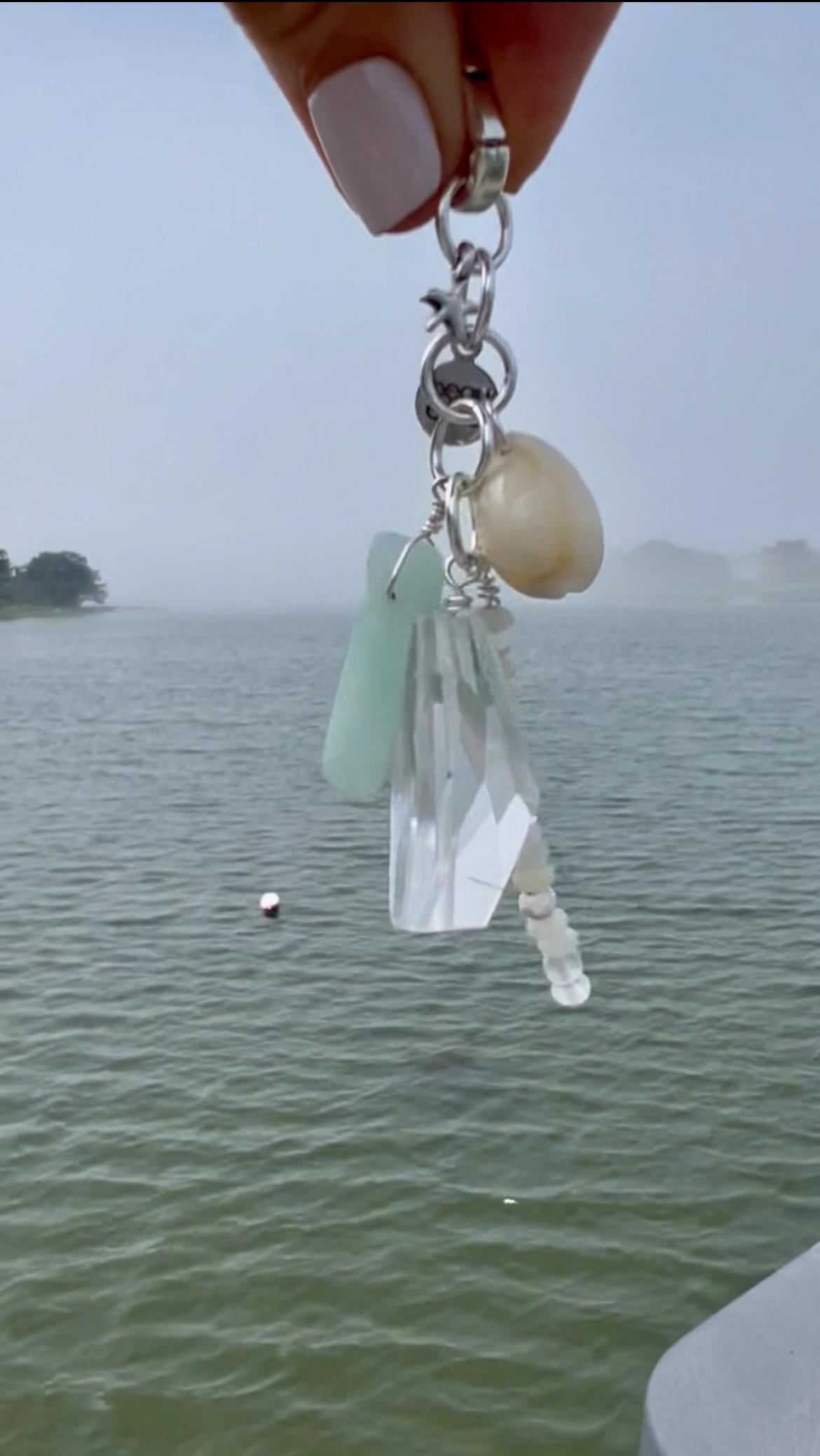 This charm pendant comes on a silver plated oval hinge clasp so that it can be attached to a variety of things including necklaces, bags, and phones. The charms are a large gem of clear quartz, a piece of amazonite, a small cowrie shell, a spear of layered tiny beads of amazonite, magnesite, clear crystal and matte glass from Ghana, a silverplated starfish and a rhodium Beauette brand charm, all linked together on silver plated rings. It pairs perfectly with the matching chain/beaded necklace https://www.etsy.com/listing/4337782961 available separately in my shop. The pendant hangs 3.5" long and about 1.5" at its widest point. The interior of the clasp is 5mm, for sliding on, and the opening of the hinge is 2MM, for clipping on.