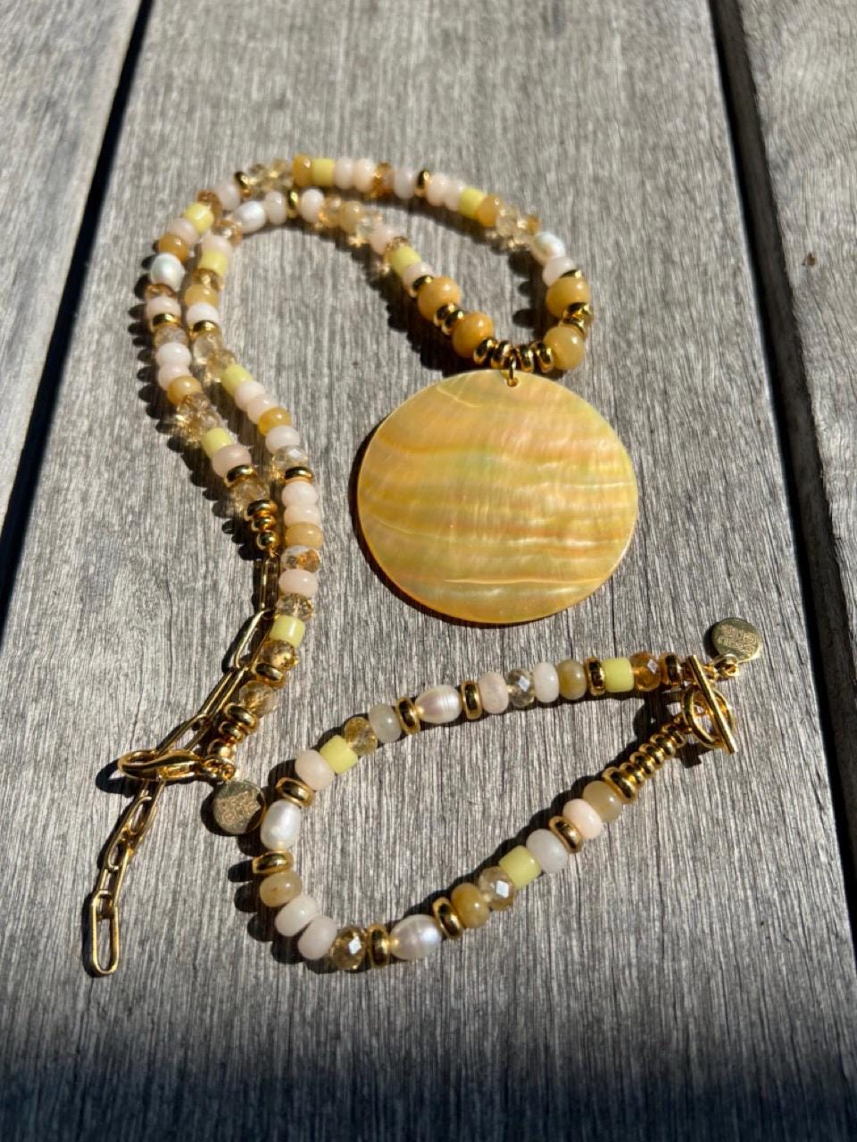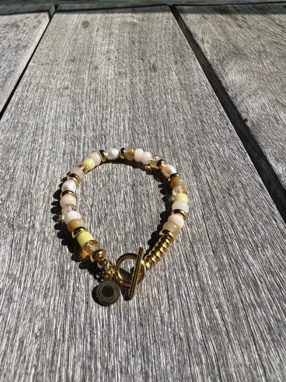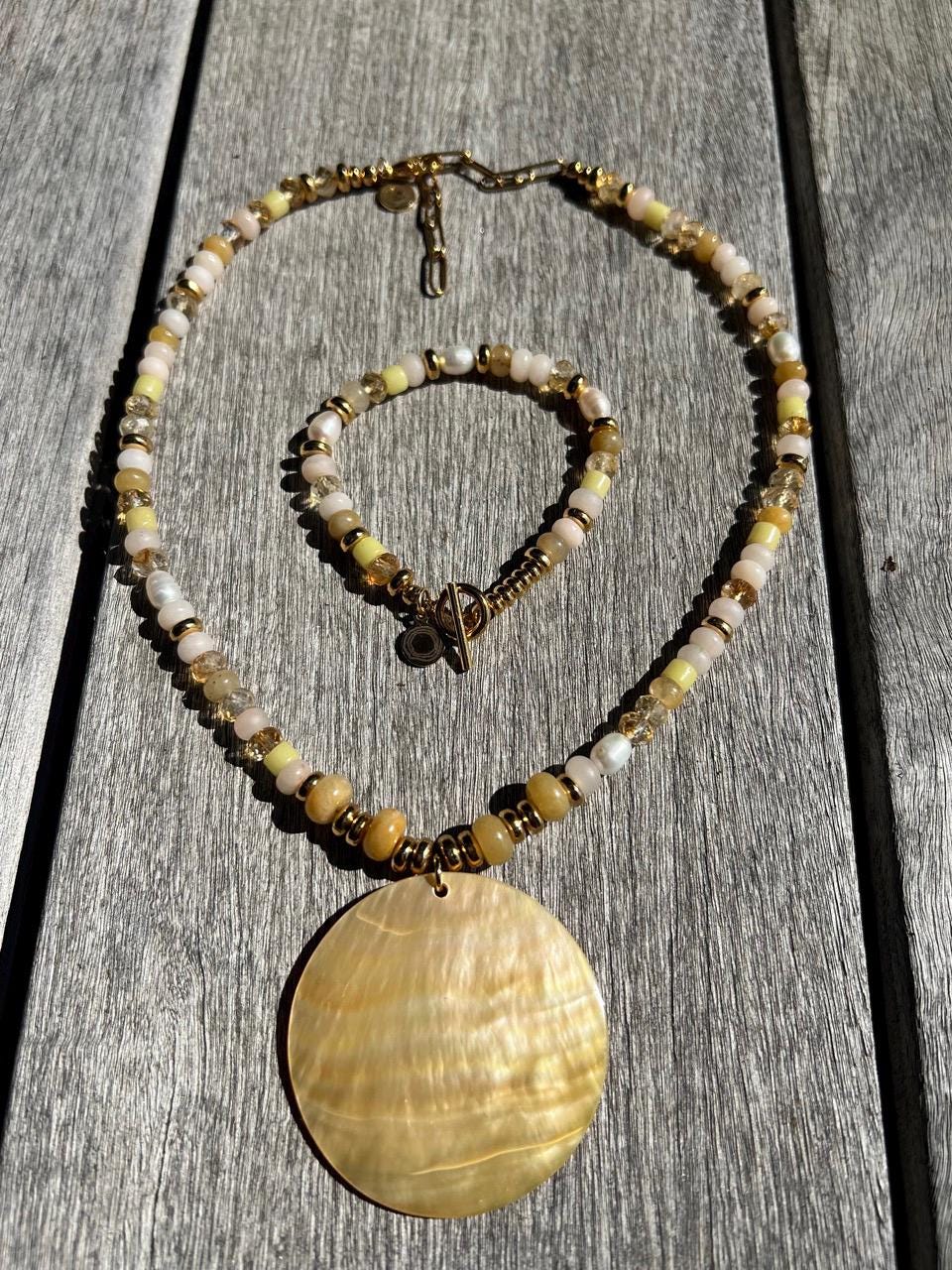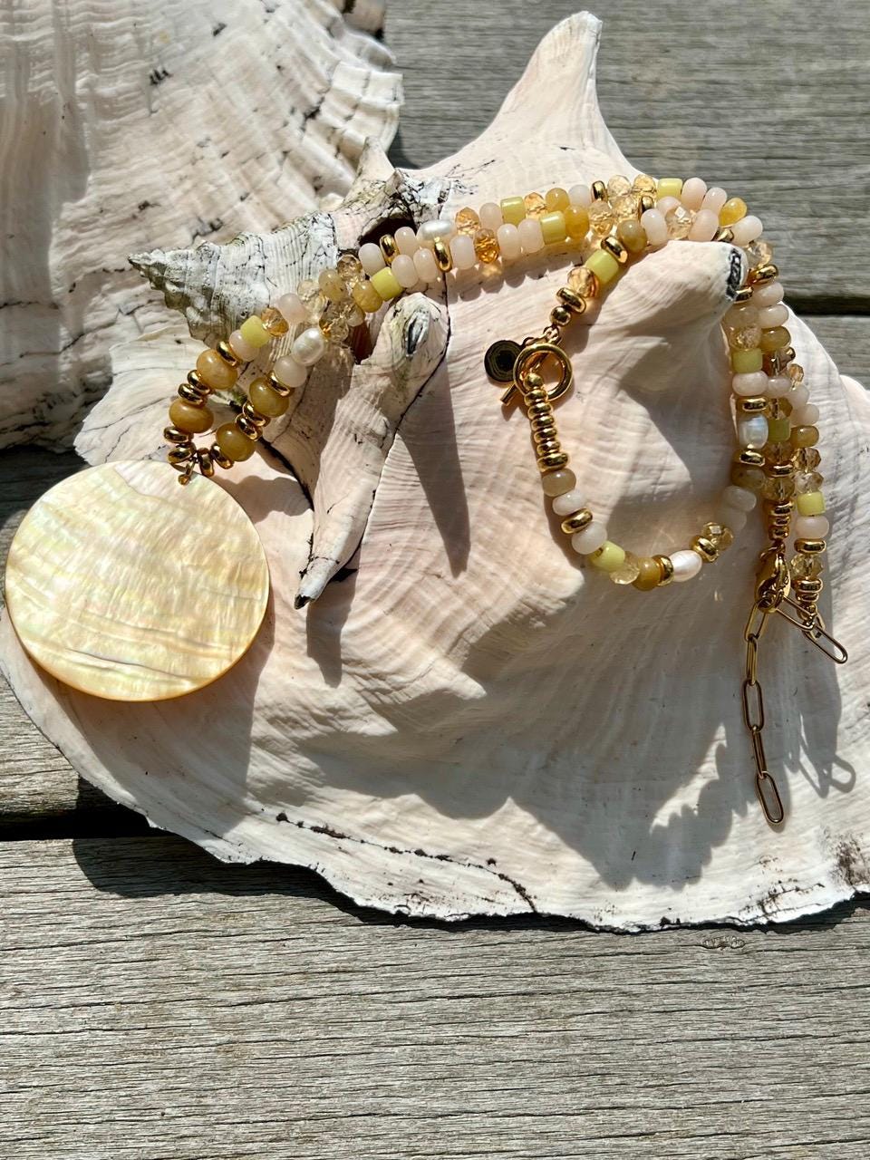 One of kind bracelet with beads of Citrine, Yellow Jade, Aventurine, Japanese River Pearls, and gold plated finishes is 7" in length. There is also a matching necklace available separately in my shop along with many other pieces of unique handmade jewelry.