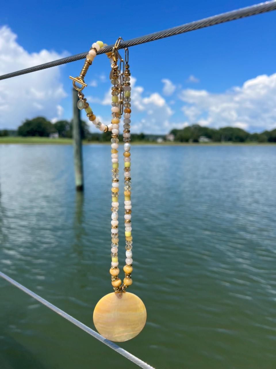 All jewelry is handmade of natural materials, by me, by the beach in California or by the mountains in Colorado or wherever I happen to be traveling. Packaging is compostable or recycled and/or recyclable. Items are shipped in an organic cotton jewelry bag, with a care card, in a gift box with raffia ribbon and wood beads, ready for gifting to yourself or another.