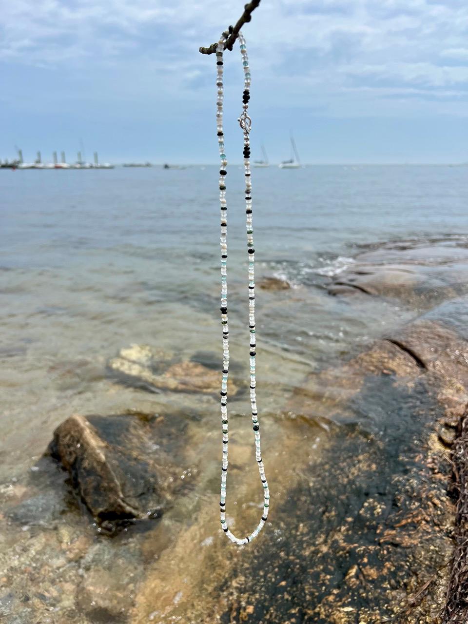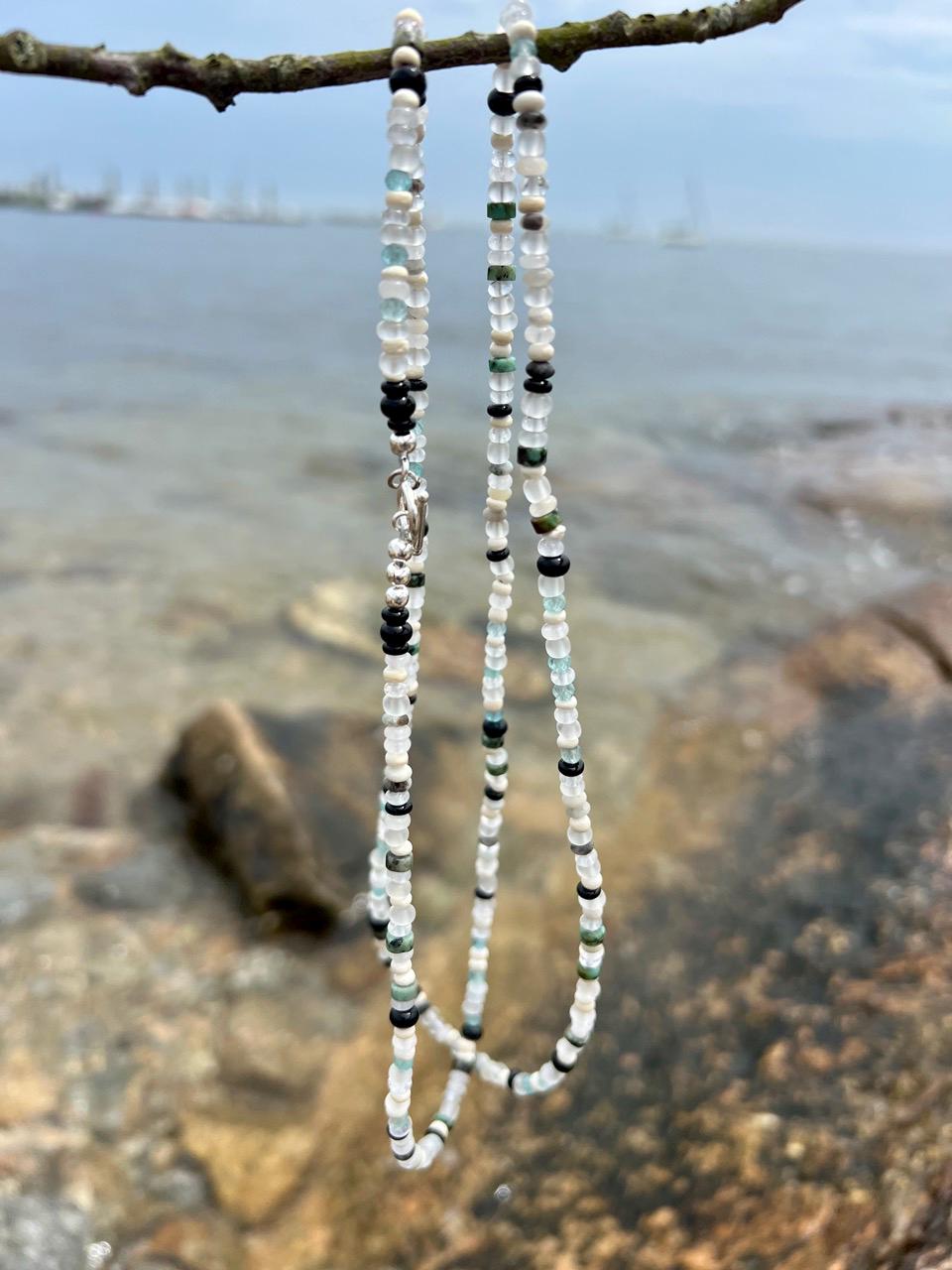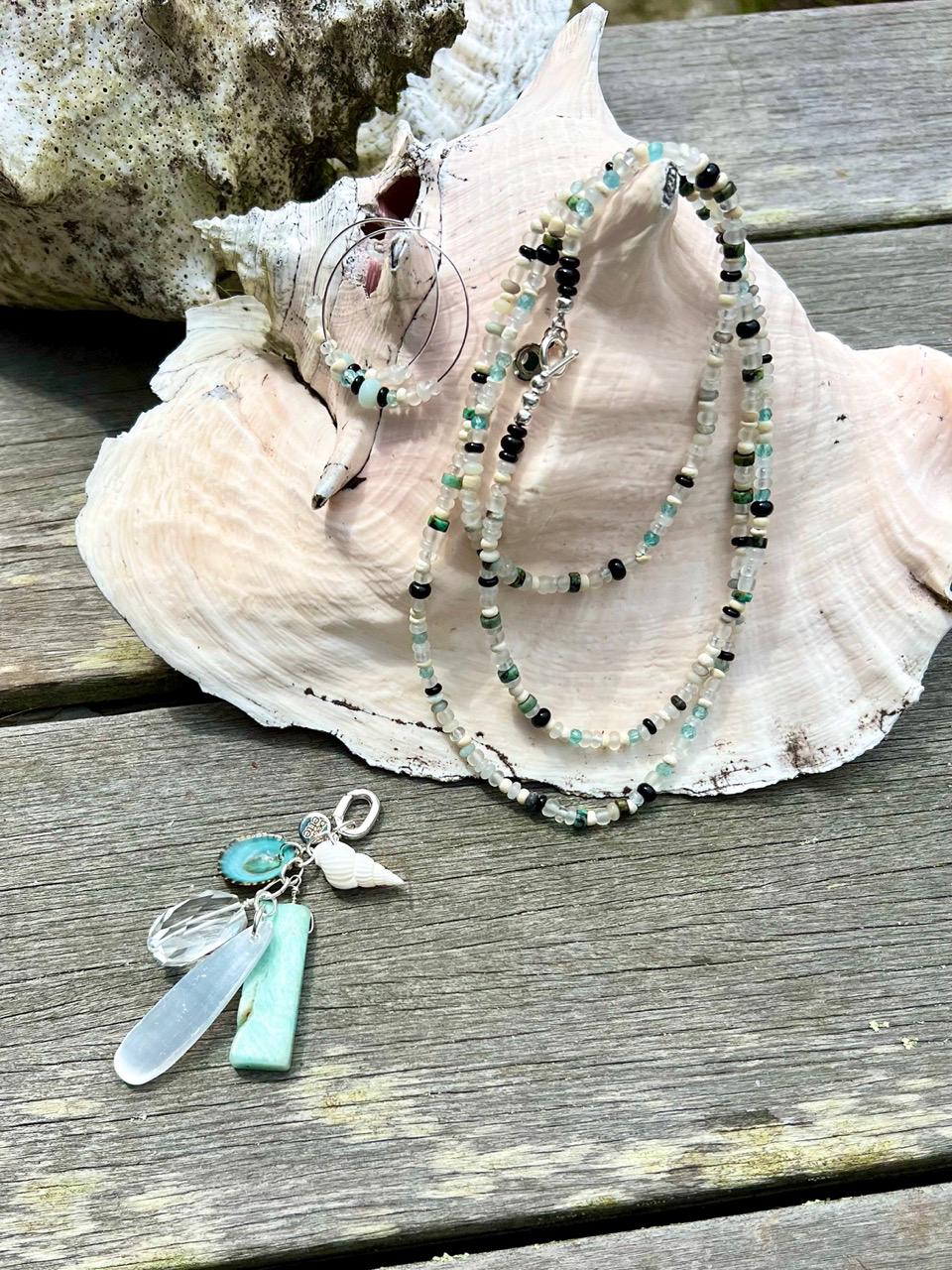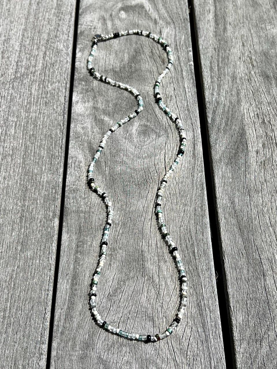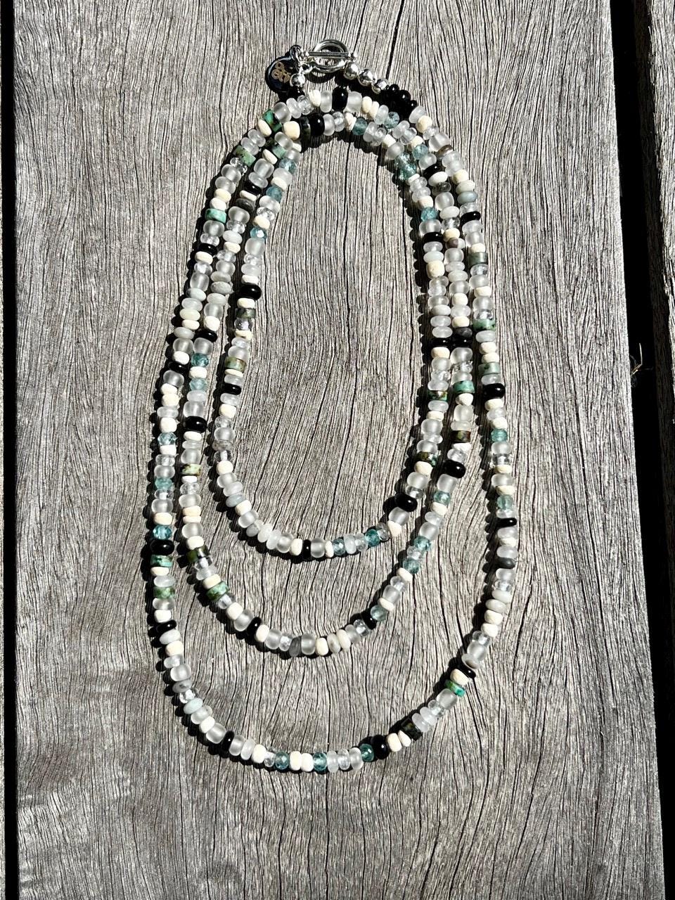 This unique hand beaded necklace consists of 4mm beads of African Turquoise, Black Gold Amazonite, Green Apatite, Clear quartz, Onyx, White jade, Natural coconut, Clear matte glass from Ghana and finished with a silver plated toggle clasp. It is 35.5" long so that it may be worn as a long single strand or doubled, or 5 times around a wrist for a bracelet, depending on wrist size. For even more versatility, it may be paired with a coordinating pendant available separately in my shop. There are also matching earrings available, https://www.etsy.com/listing/4339697272.