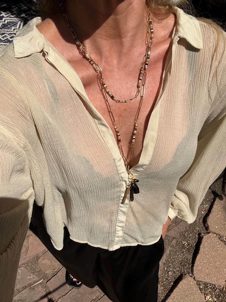 All jewelry is handmade of natural materials, by me, by the beach in California or by the mountains in Colorado or wherever I happen to be traveling. Packaging is compostable or recycled and/or recyclable. Items are shipped in an organic cotton jewelry bag, with a care card, in a gift box with raffia ribbon and wood beads, ready for gifting to yourself or another.