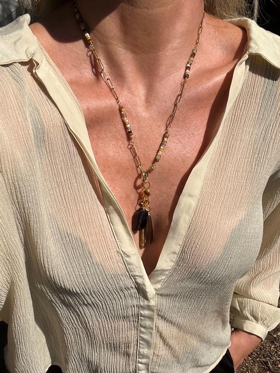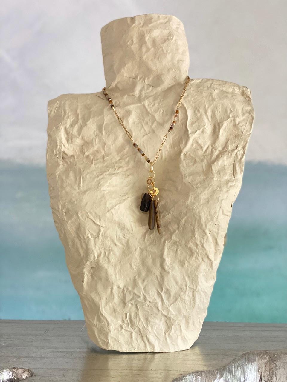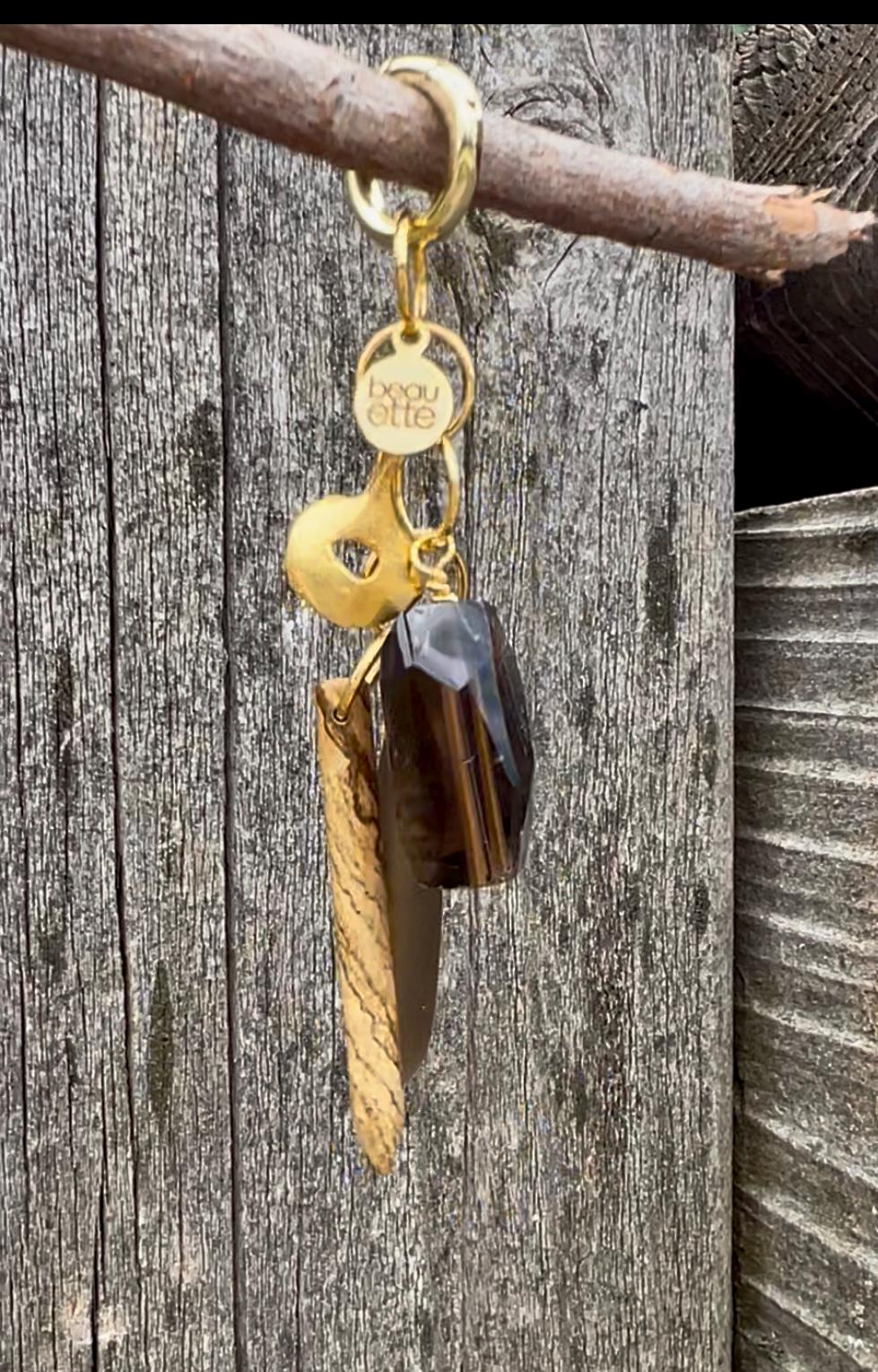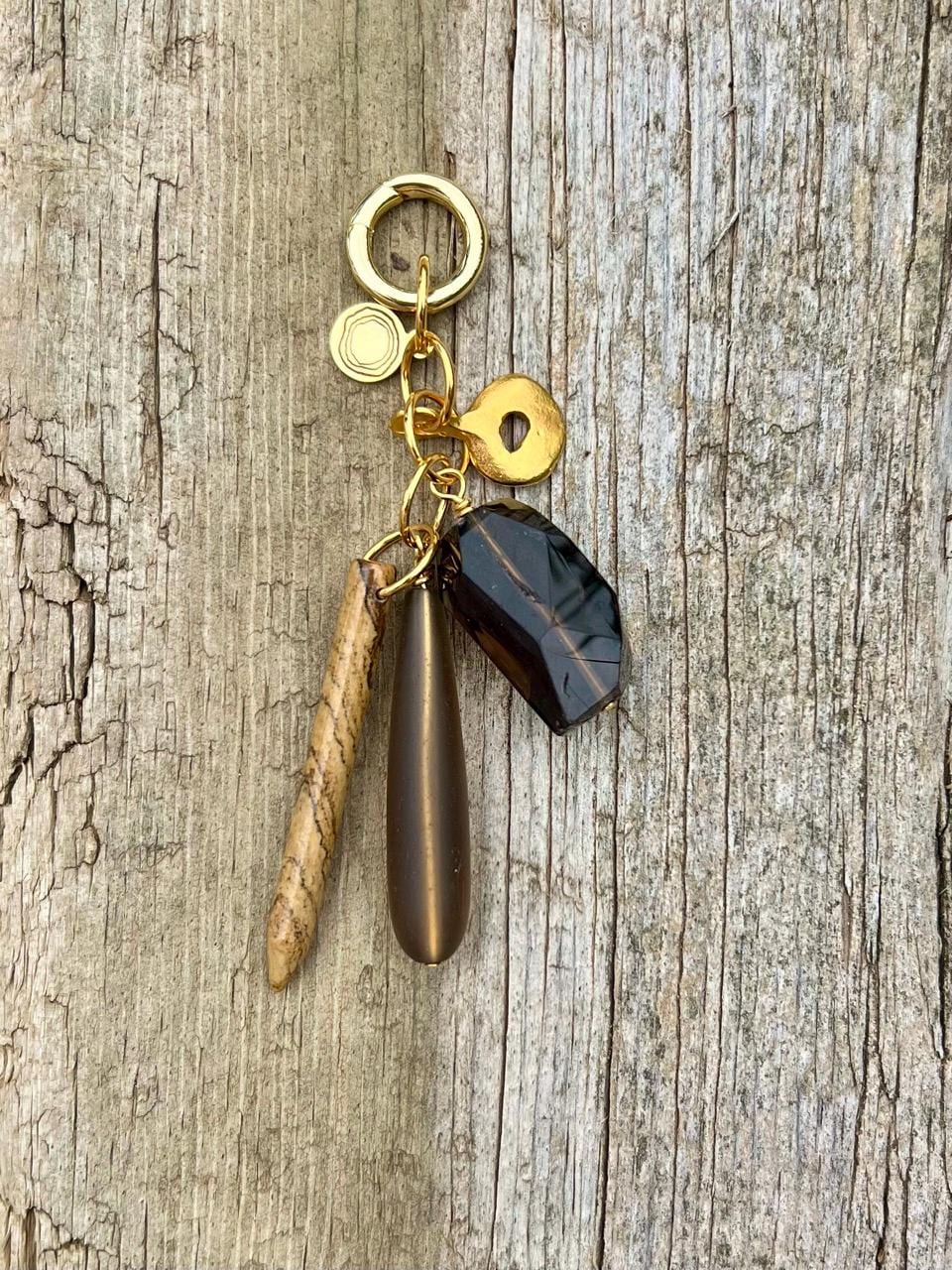 Versatile, one of a kind, unusual charm pendant makes a great gift as it works not just on a necklace but also as a trendy, upscale, handbag charm. Picture Jasper thin spike, chunky Smoky Quartz gem, tumbled glass, and gold plated charms are connected together by hand on gold plated rings, hanging from a gold filled round hinge clasp. Clasp interior diameter is 9mm for sliding on and has an opening of 3mm when clipping on. The pendant hangs a little over 3.5" long and slightly under 1" at its widest point. Purchase it alone to be worn on your own chain or cord necklace, or purse, or pair it with the beaded gold chains in my shop - https://www.etsy.com/listing/4347033241