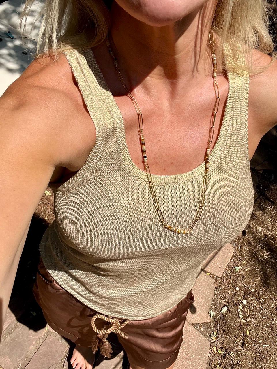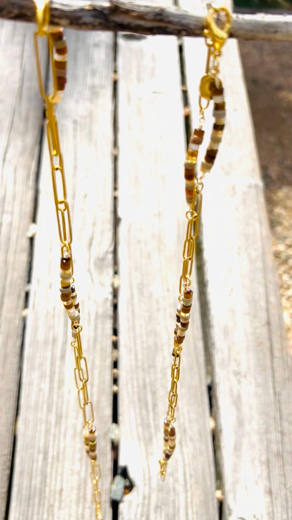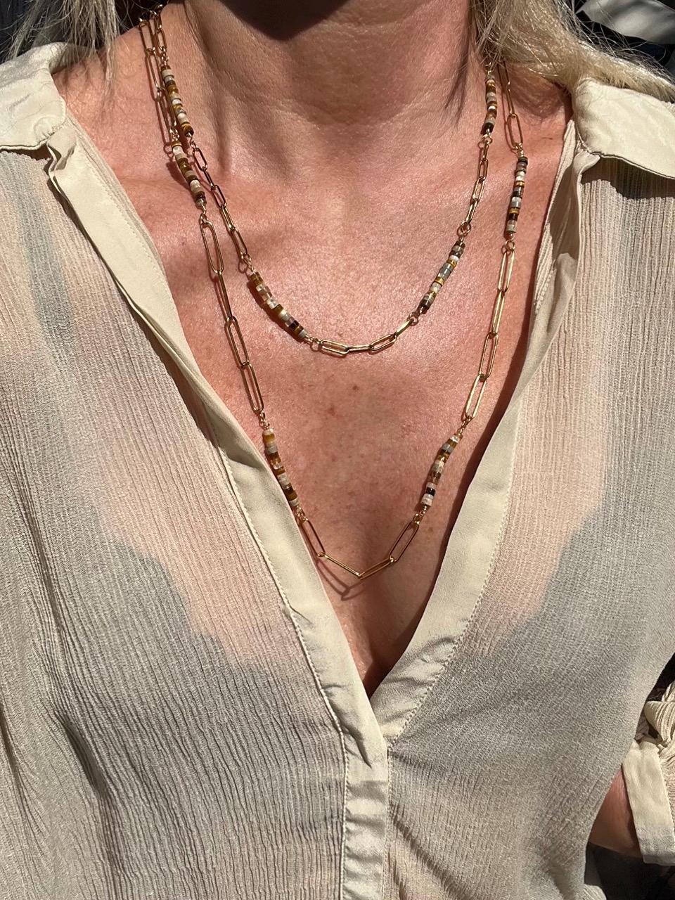 These unique necklaces alternate sections of gold plated paperclip chain with sections of 4mm beads of Tiger's Eye, Fluorite, Jasper and Mother of Pearl for a beautiful and original look. The luminous shades of gold are great neutrals for just about any outfit. There is a large version, 29" long with 20mm links, and a small version, 21.75" with 10mm links. The gold plated lobster claw clasp can be attached to any link on the necklace, making them totally adjustable in length. These necklaces are elegant on their own or together, and can be made even more impactful by adding a pendant from my shop, https://www.etsy.com/shop/beauette/?etsrc=sdt§ion_id=54239716