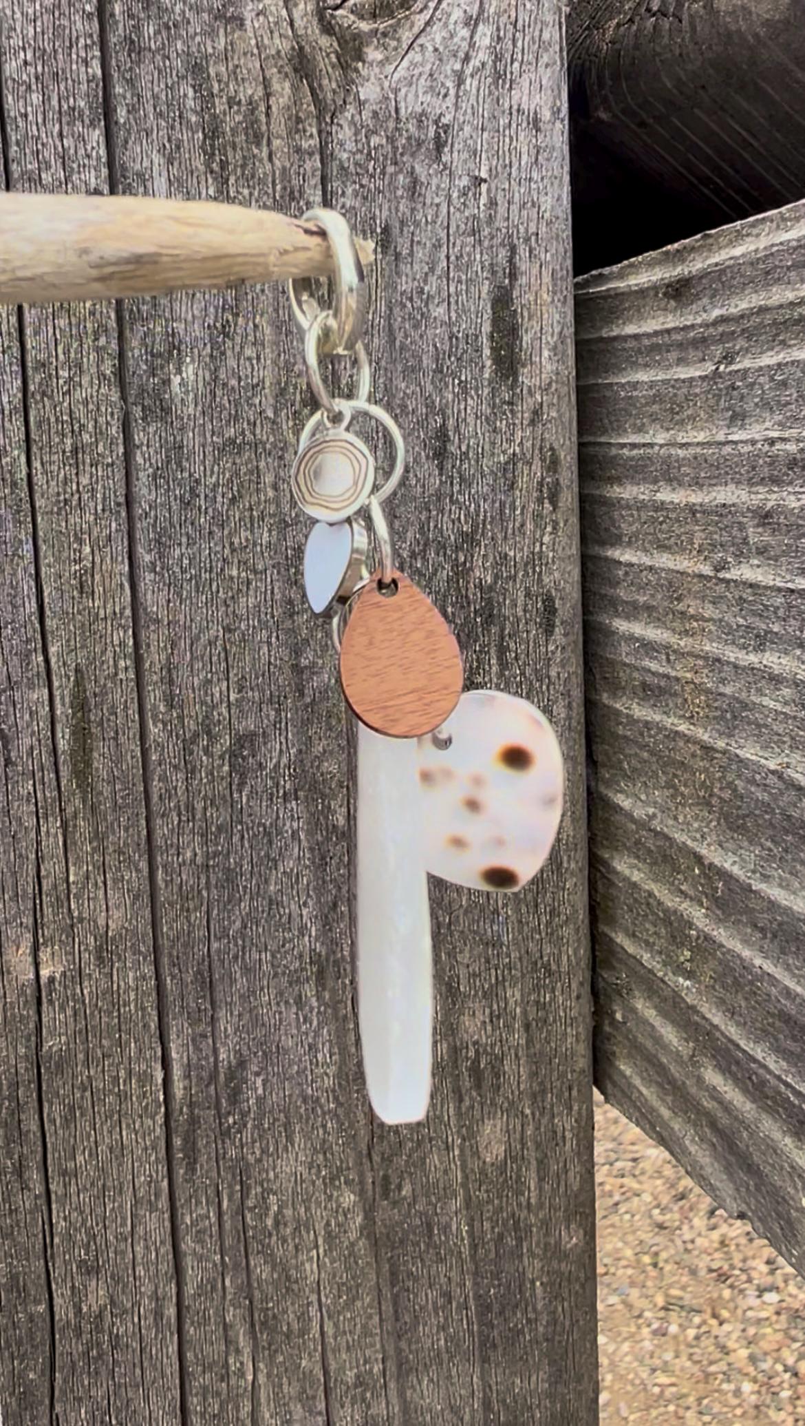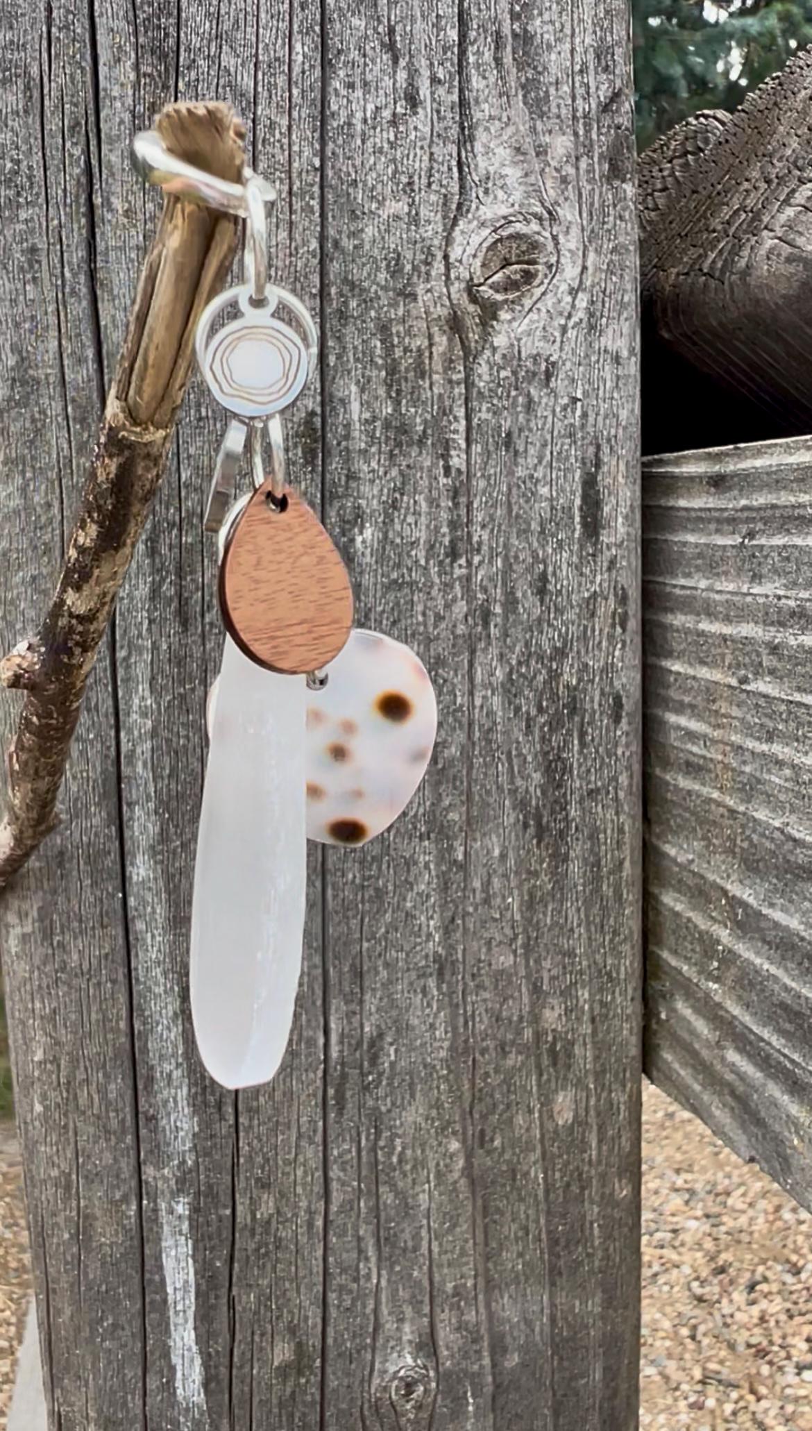 This fun yet elegant charm pendant is made up of a long Selenite teardrop, a Walnut Wood teardrop, an Enamel heart, a Cowrie shell heart & a rhodium plated Beauette charm, strung together by hand on silver plated rings, hanging from a 925 sterling silver clasp. Put it on a necklace you already own, or pair it with a beaded necklace from my shop, like the long, tripled silver plated chain with faceted clear crystals and freshwater pearls shown, https://www.etsy.com/listing/4314703117. The interior diameter of the clasp is 7mm when sliding on, and has an opening of 3mm when clipping on.