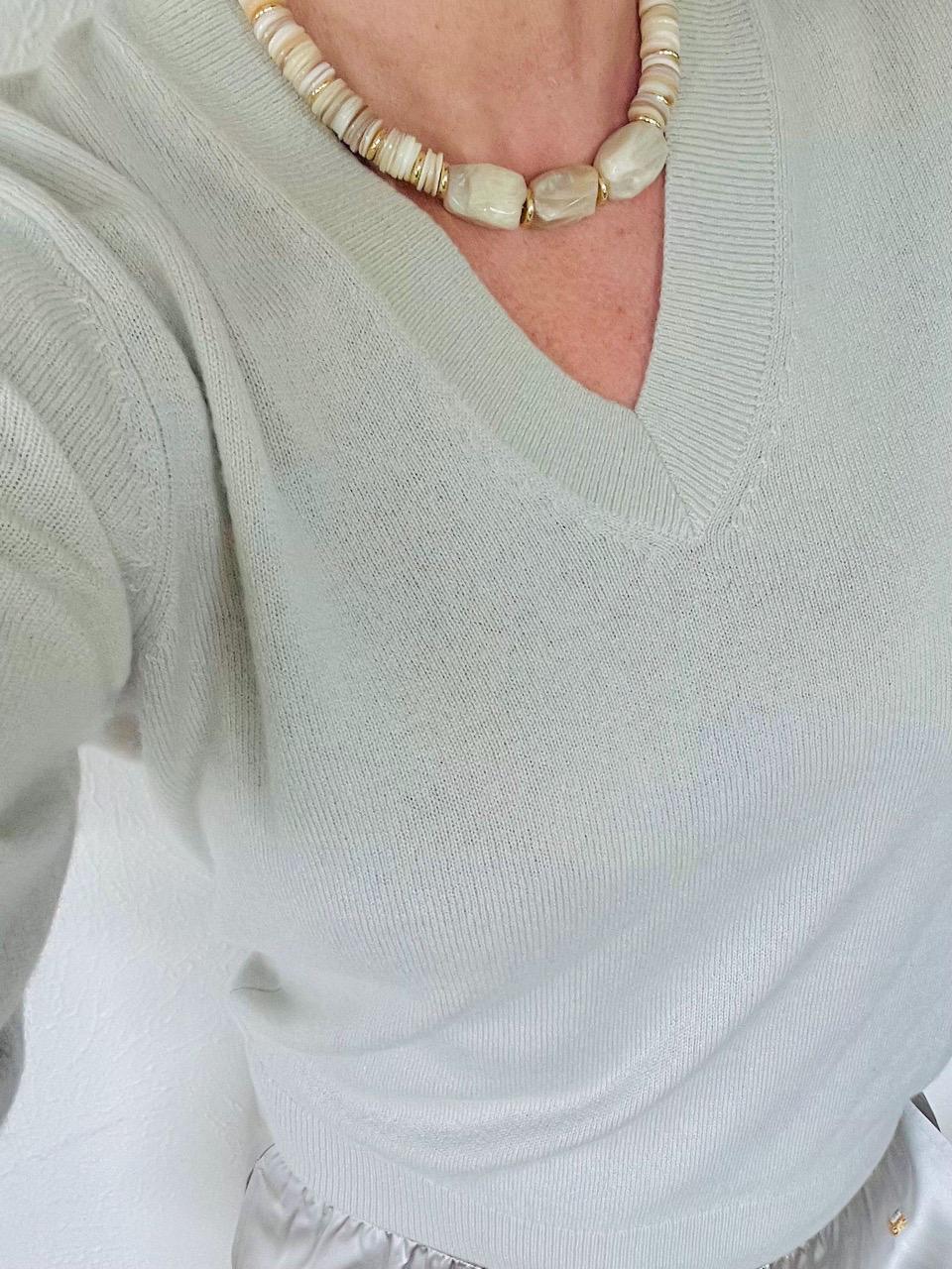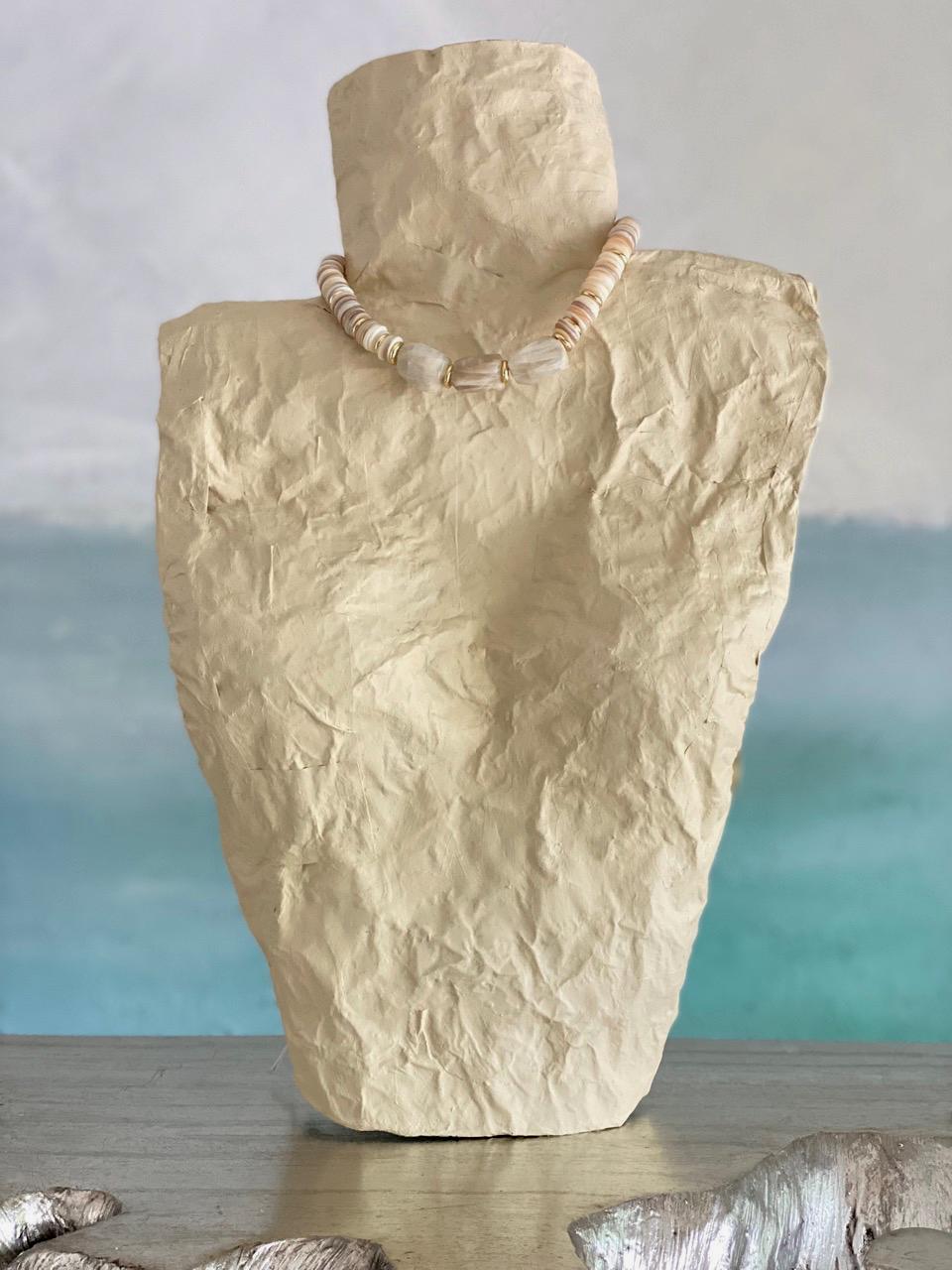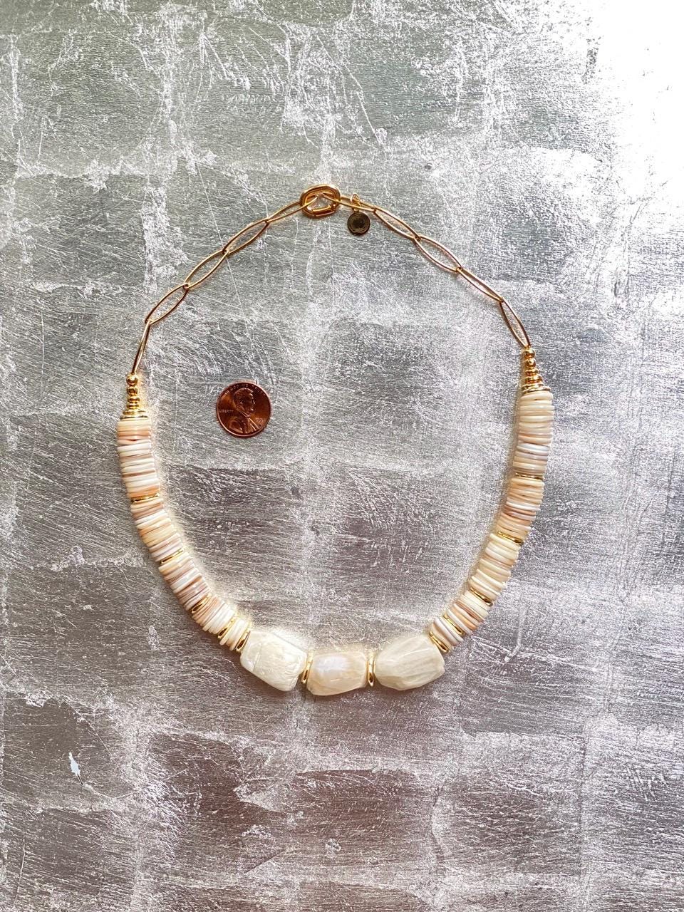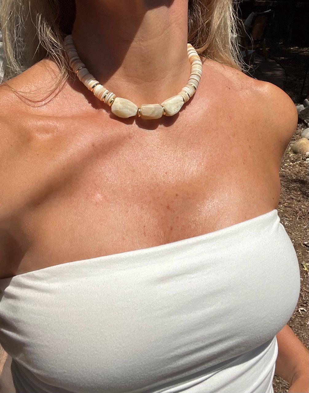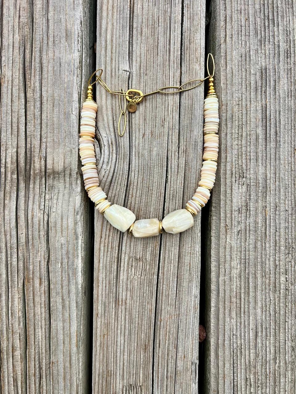 This unique, adjustable, statement choker necklace features three large Moonstone nuggets at its center and white shell discs along outer collar, with Gold fill discs, Gold plated chain and lobster claw clasp. Length can be adjusted from 14" to 18"; thickness is approximately 12-15mm. This necklace is a year-round statement piece and will go seamlessly from Summer looks to Fall and Winter white styles.