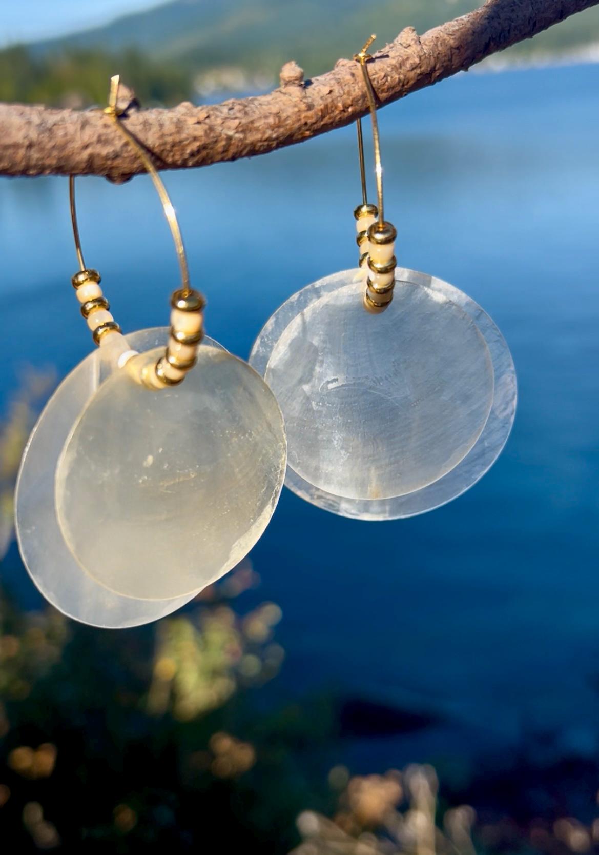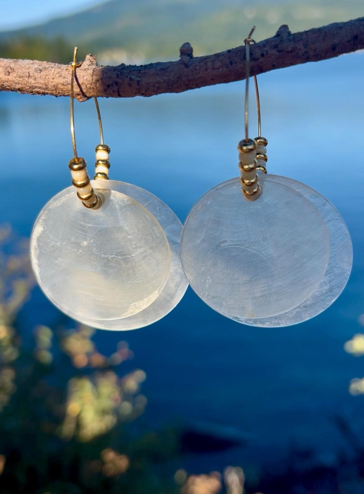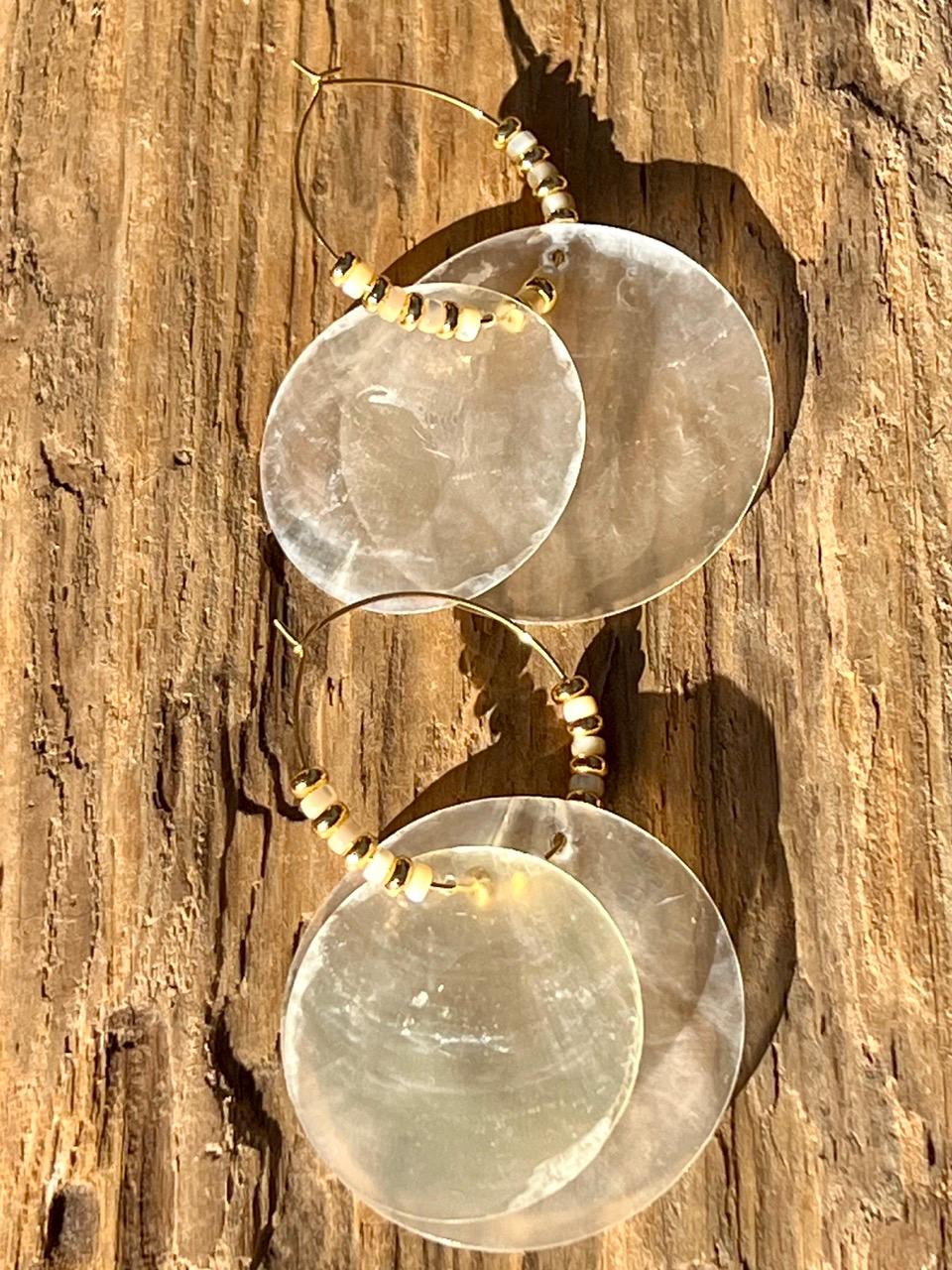 These big, beautiful statement earrings are lightweight and comfortable to wear due to the large capiz shell discs hanging from the 1.25" gold plated hoops. Surrounding and between the discs are beads of golden mother of pearl and gold plate. Total hanging length is 3.25" and the largest disc is about 2". These would be stunning with a simple white dress or strapless top, and the neutral colors go with so many looks.