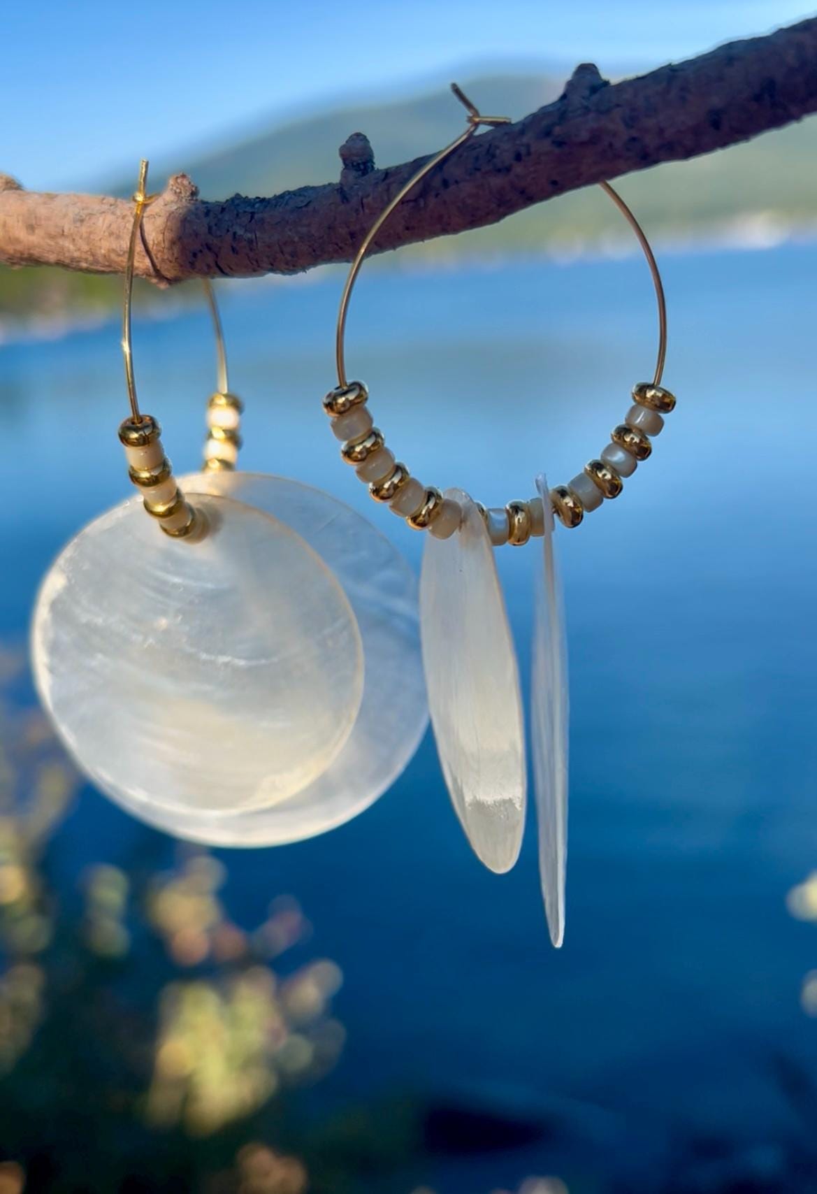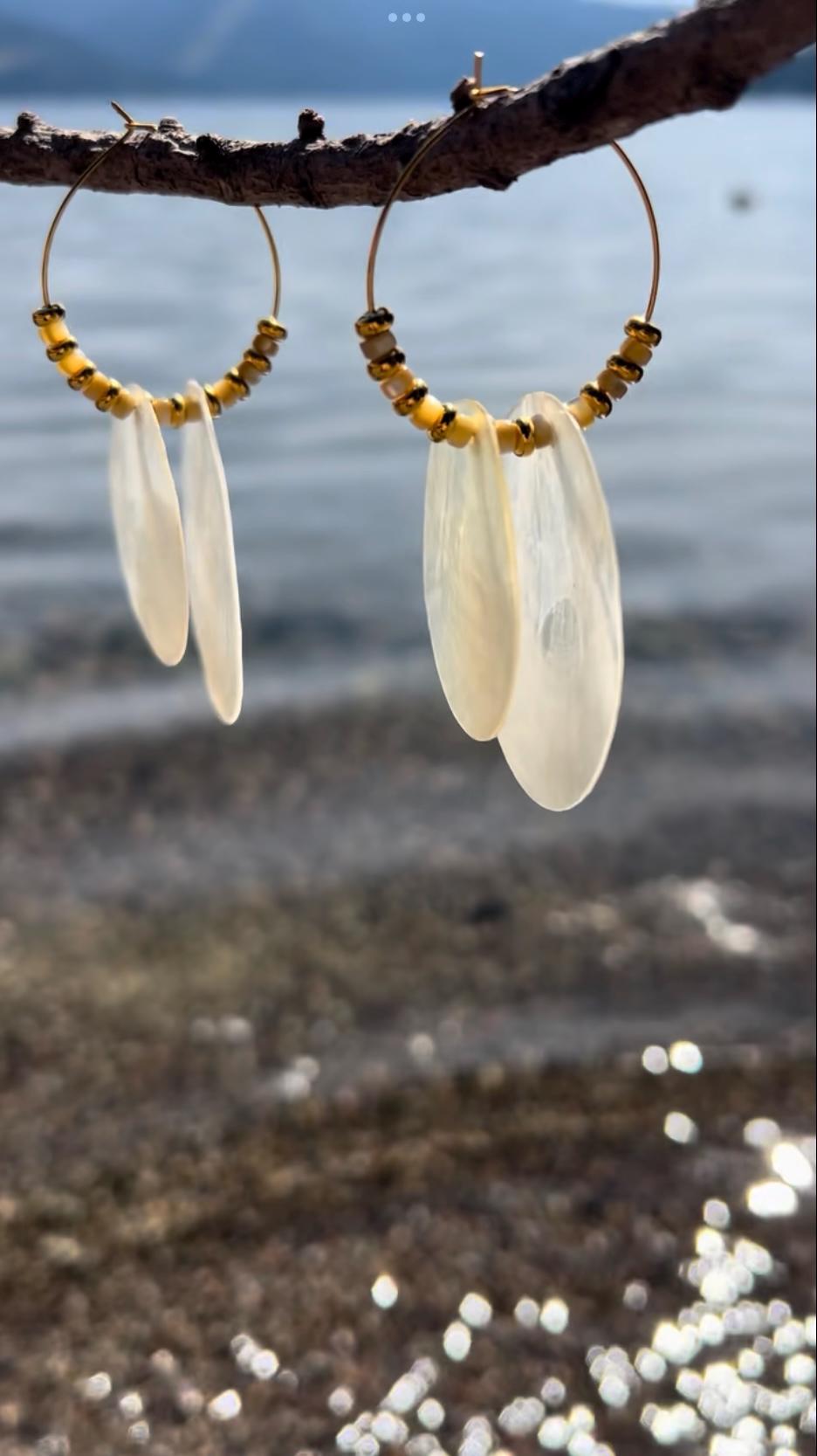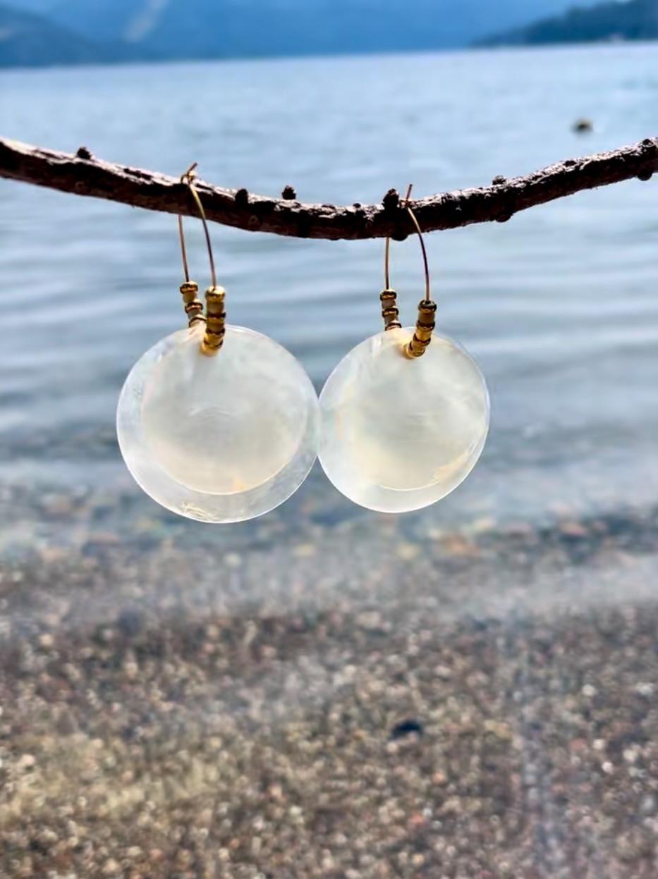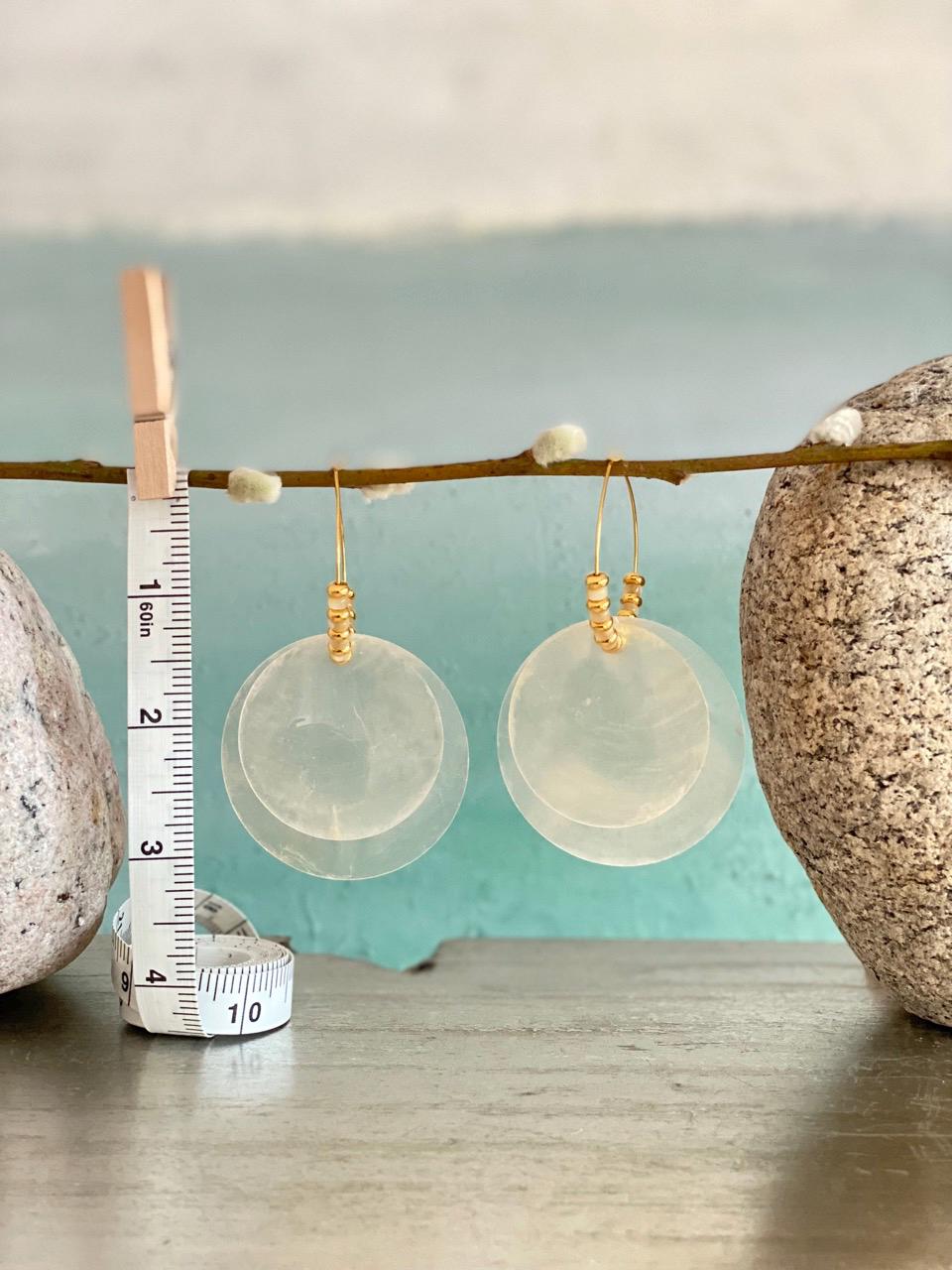 These big, beautiful statement earrings are lightweight and comfortable to wear due to the large capiz shell discs hanging from the 1.25" gold plated hoops. Surrounding and between the discs are beads of golden mother of pearl and gold plate. Total hanging length is 3.25" and the largest disc is about 2". These would be stunning with a simple white dress or strapless top, and the neutral colors go with so many looks.
