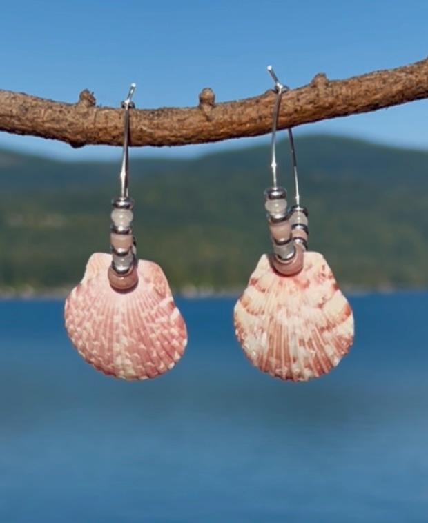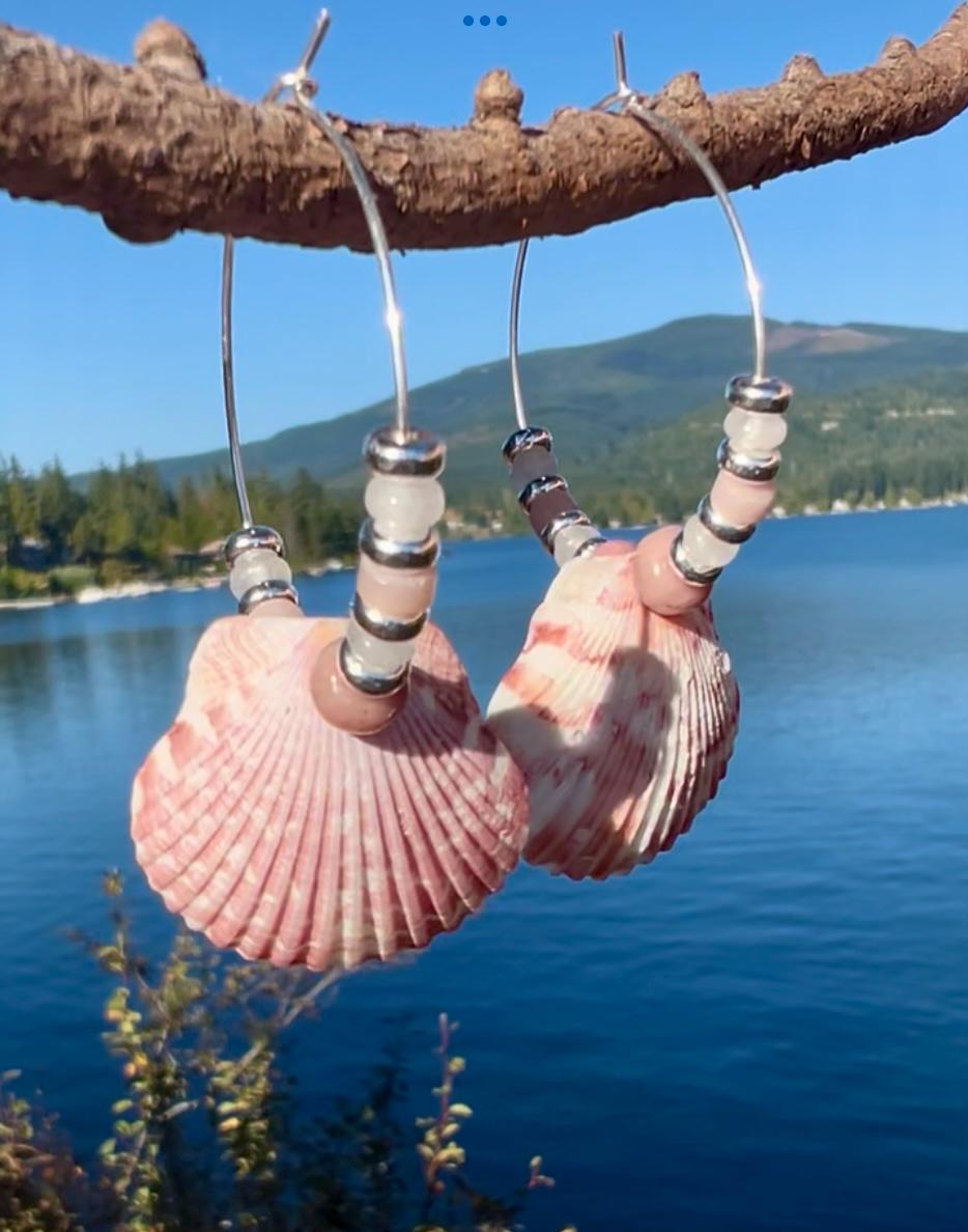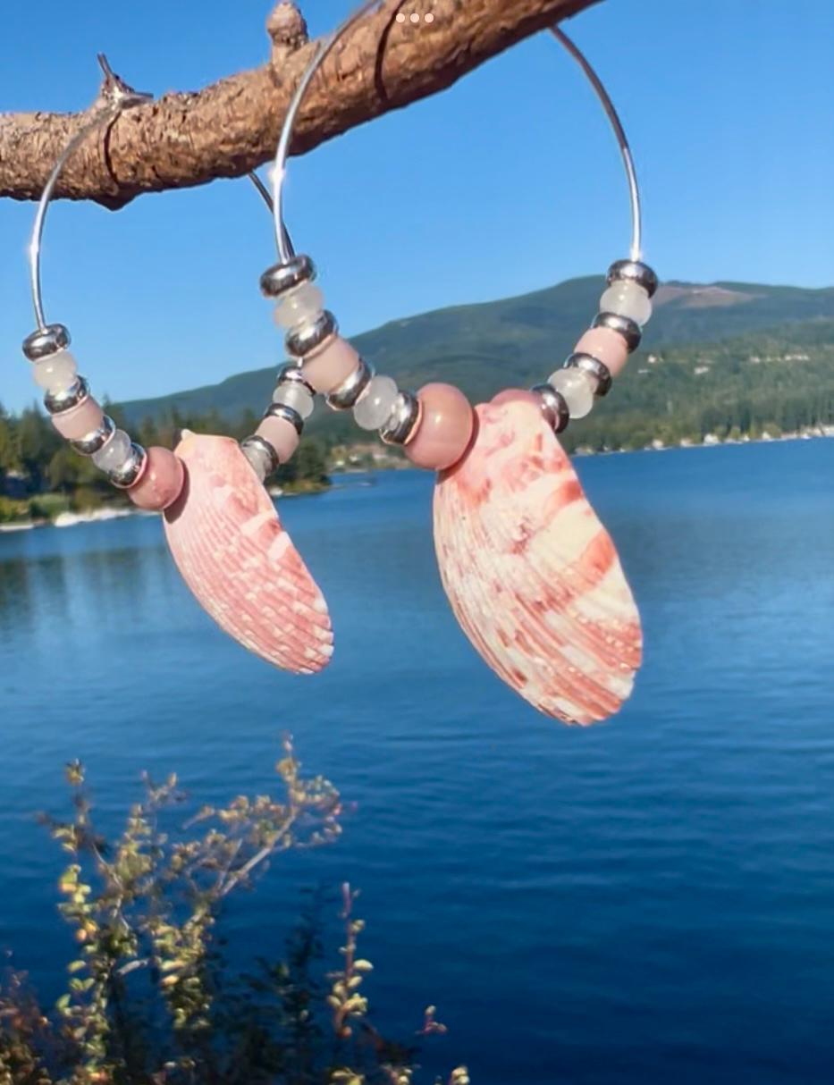 Small silver plated hoops 1.25" with pink and white calico scallop shells hang close to 2.5" total. Shells are surrounded by pink rhodonite, rose quartz and white jade as well as silver plated beads. The lovely shades of pink with the shells evoke a pretty, coastal vibe.
