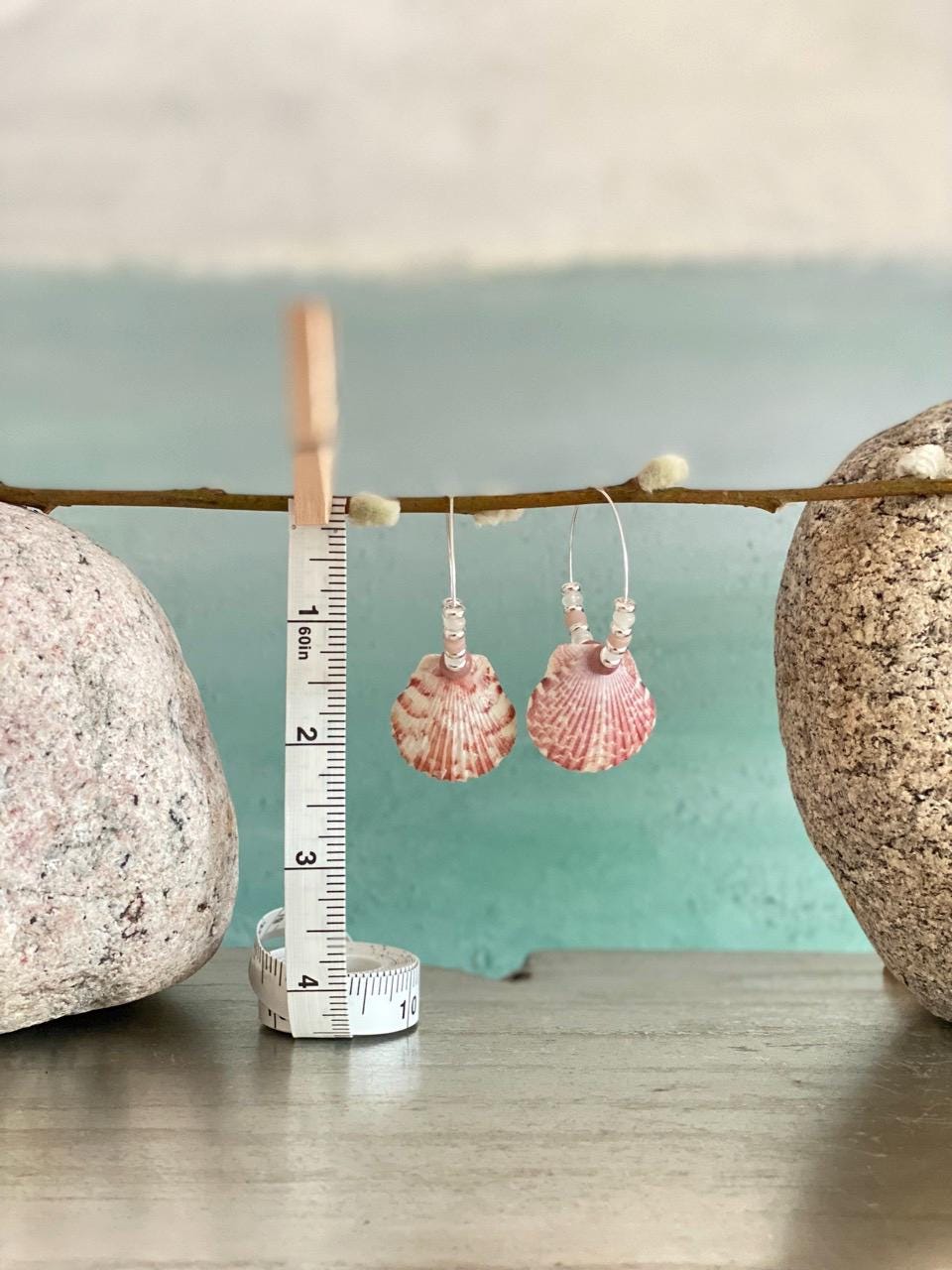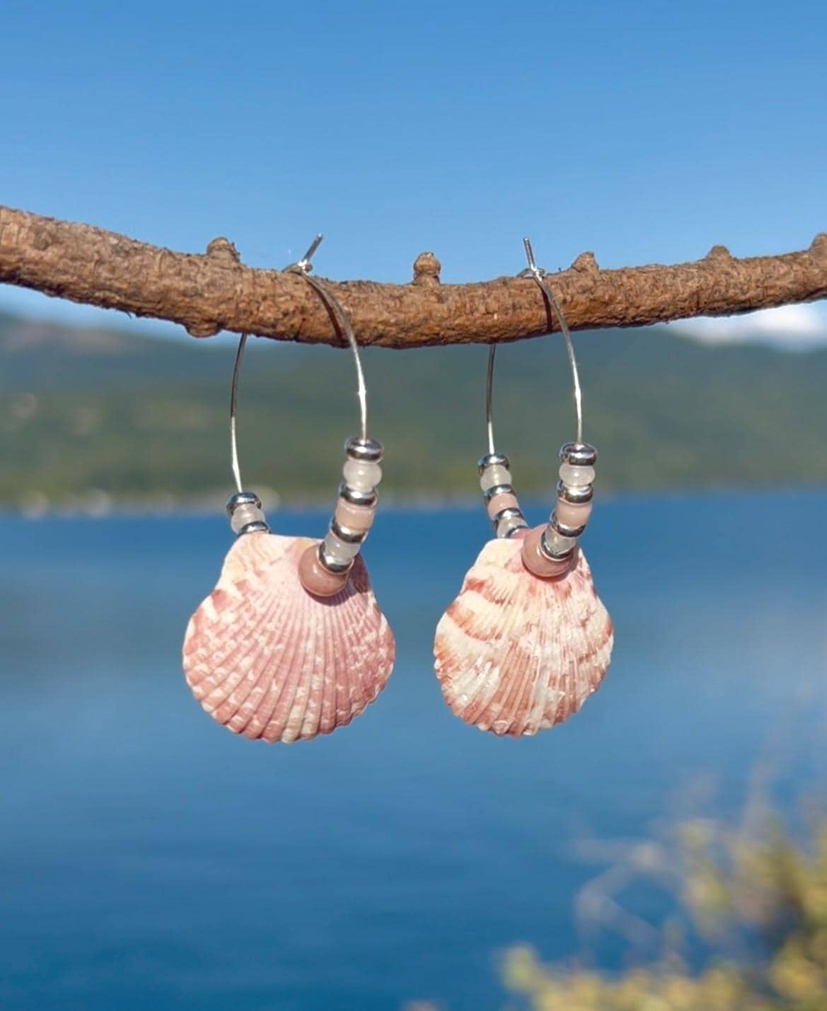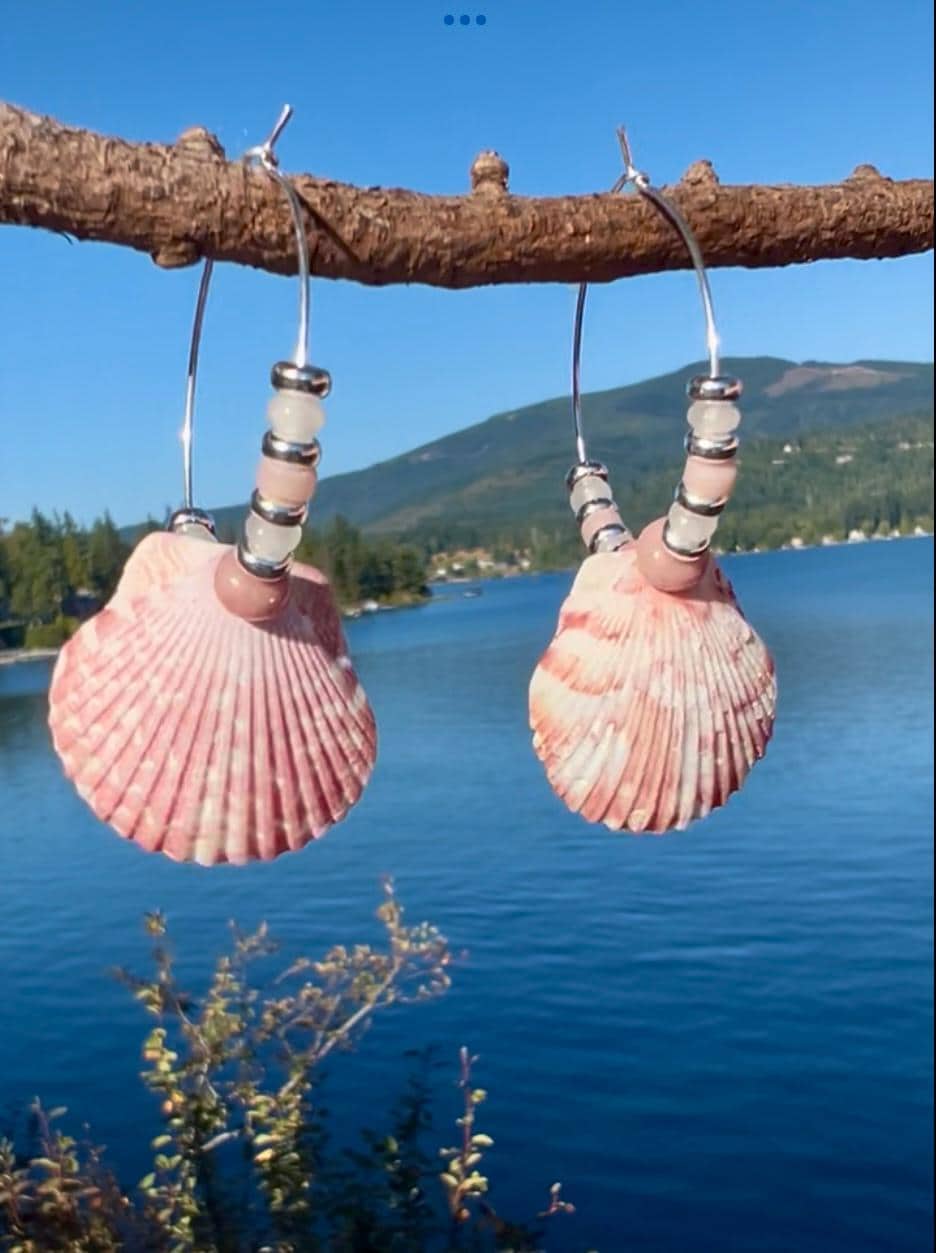 Small silver plated hoops 1.25" with pink and white calico scallop shells hang close to 2.5" total. Shells are surrounded by pink rhodonite, rose quartz and white jade as well as silver plated beads. The lovely shades of pink with the shells evoke a pretty, coastal vibe.
