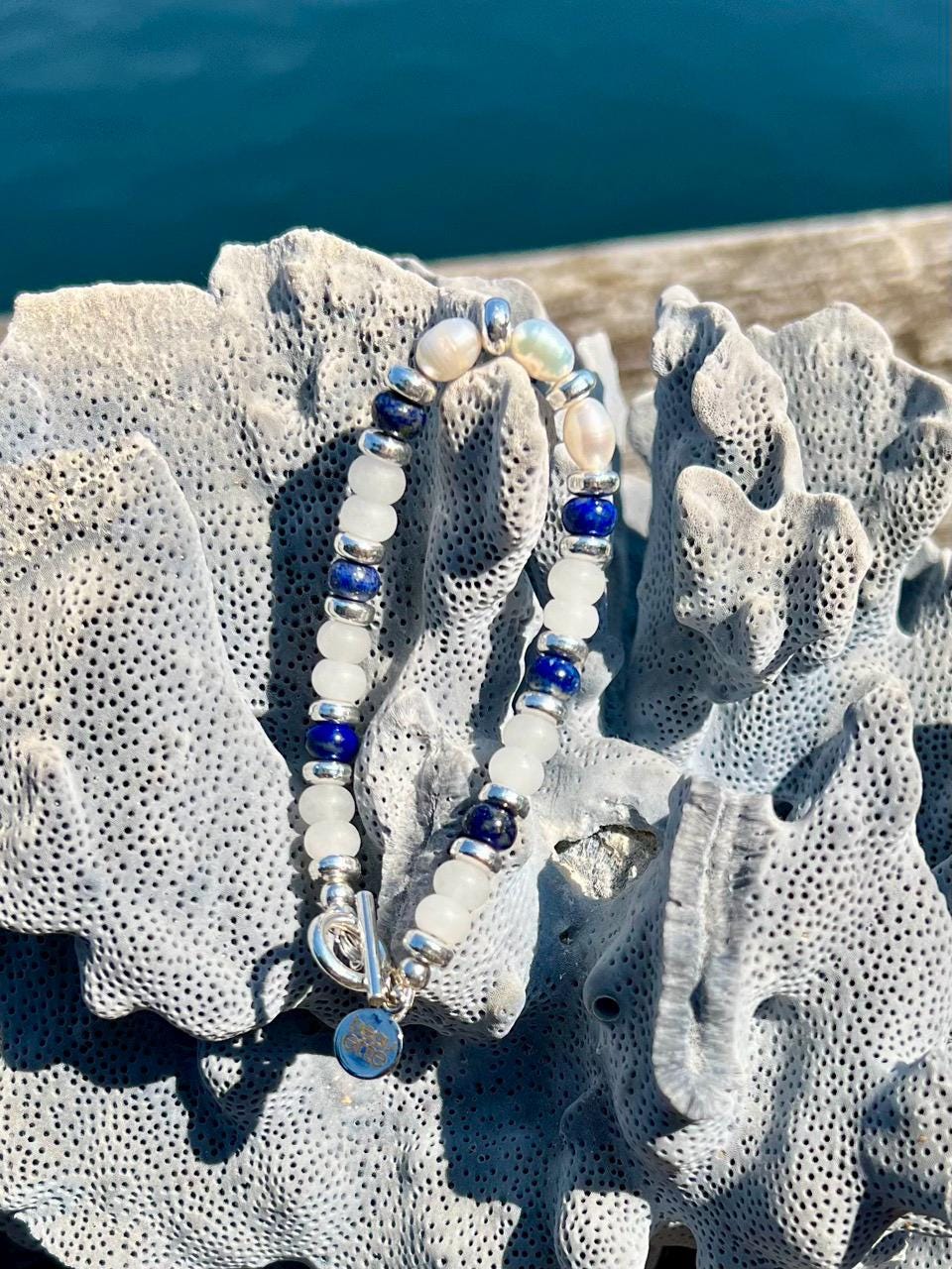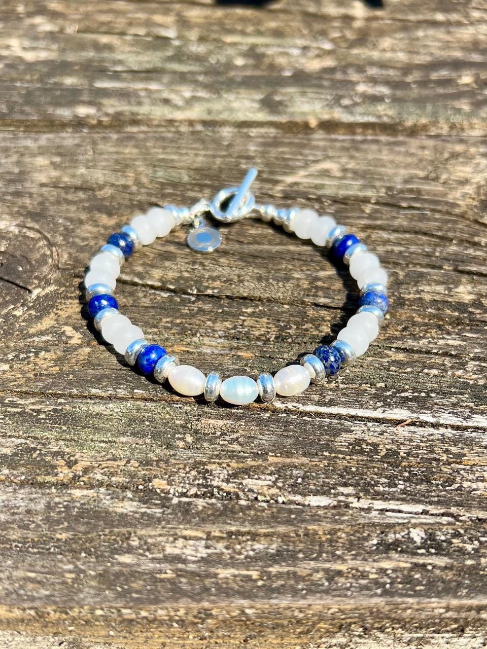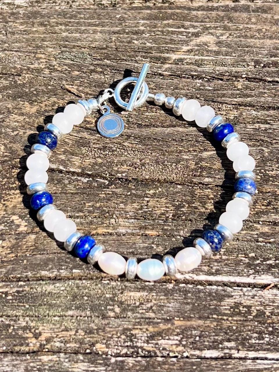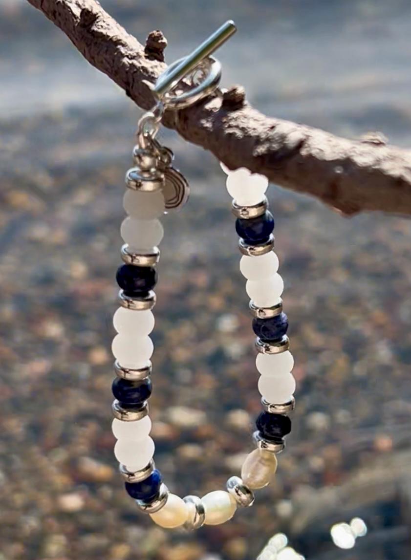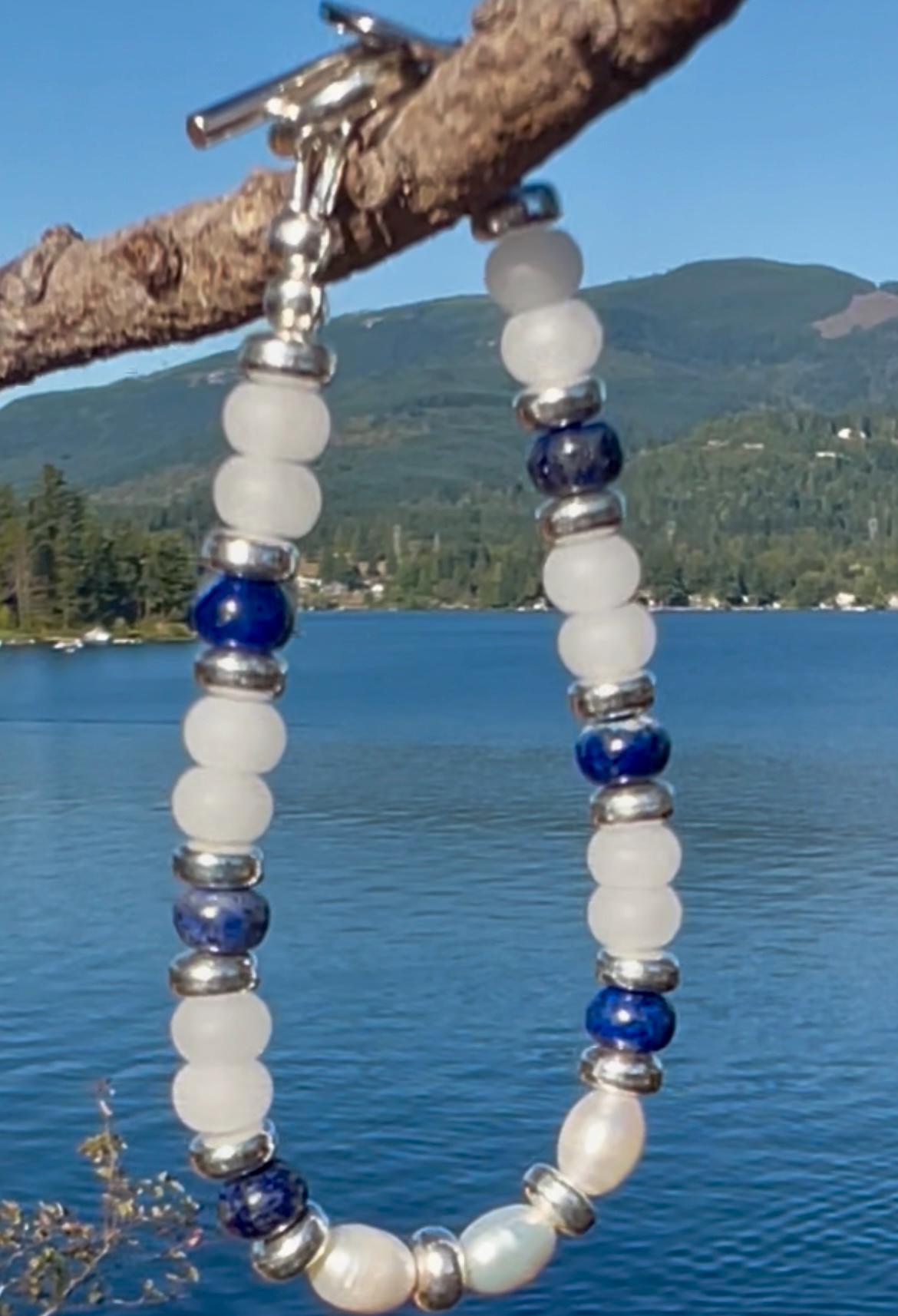 Clean and classic in navy blue and white, this artisan hand crafted beaded bracelet pairs gemstones Lapis Lazuli and White Jade with freshwater pearls and silver plated section markers and toggle clasp. Total length is 7.25". Matching necklace and earrings are available in my shop.