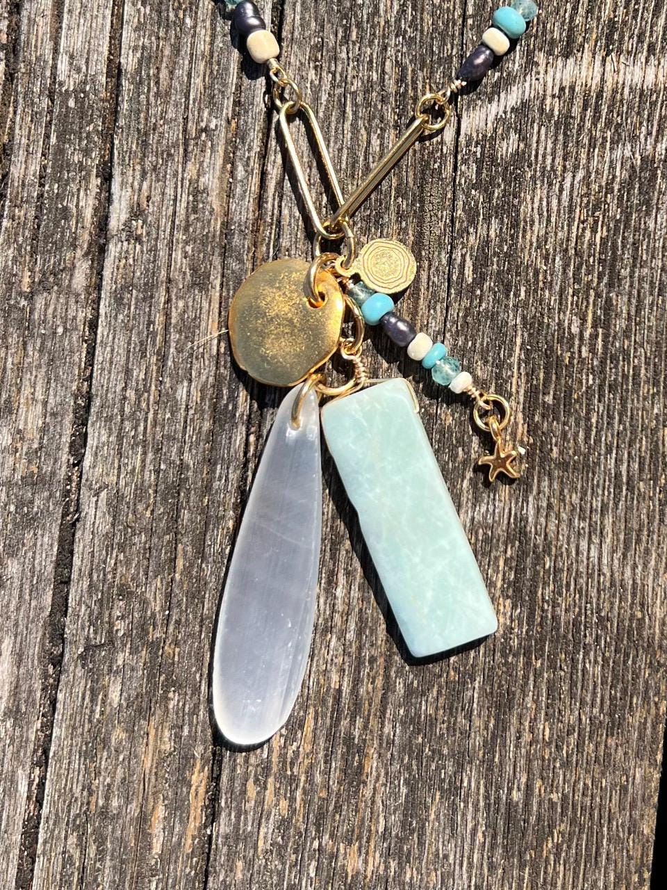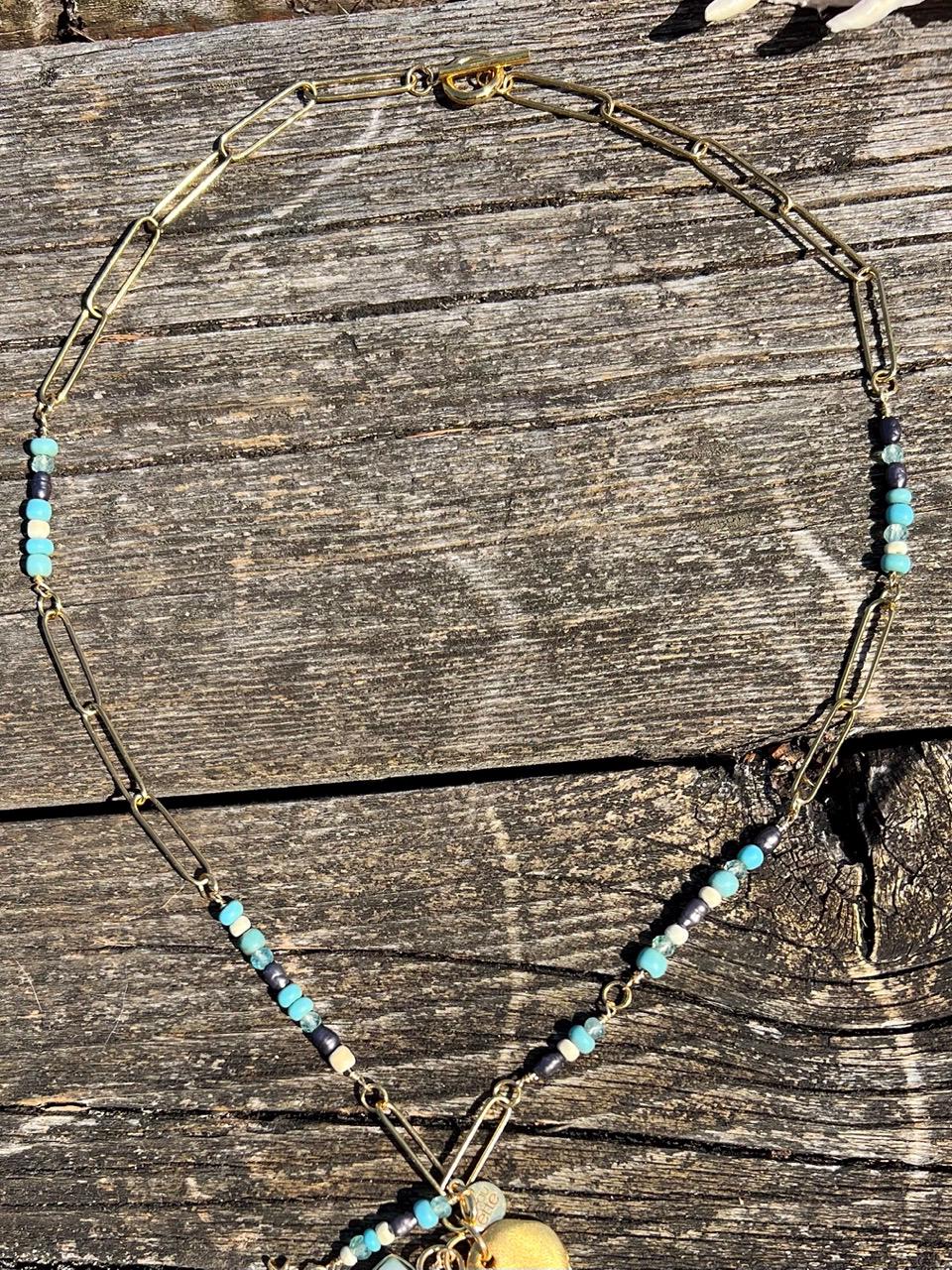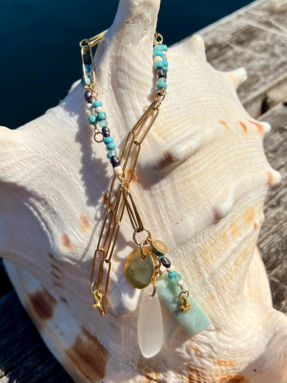OOAK hand crafted necklace of gold plated paperclip chain mixed with sections of beads in various blues and materials: Japanese River Pearls, Green Apatite, Coconut Shell, Java Glass. Charm pendant made up of Amazonite rectangle, gold plated coin disc, Selenite teardrop, necklace beads with gold plated starfish and gold plated Beauette charm. The different shapes and textures in the assymetrical configuration give it a beautiful, organic feel. I love this with a bathing suit or v-neck top. The necklace is 21" around and the pendant hangs down an additional 2.75". Gold plated toggle clasp closure.
