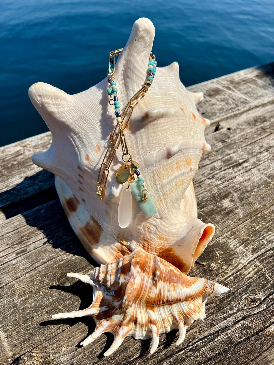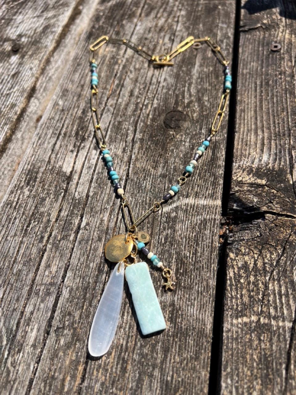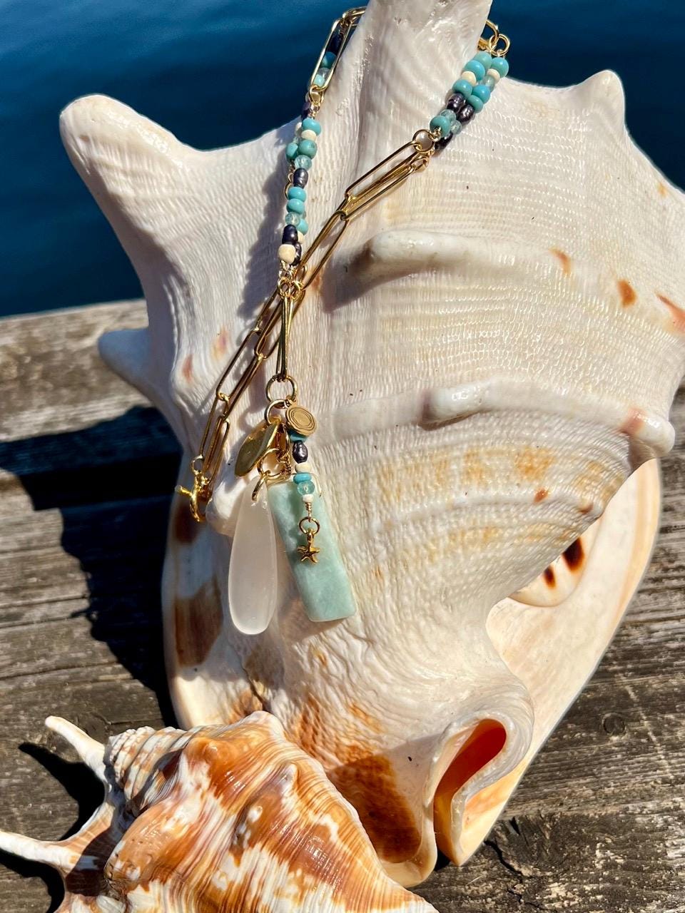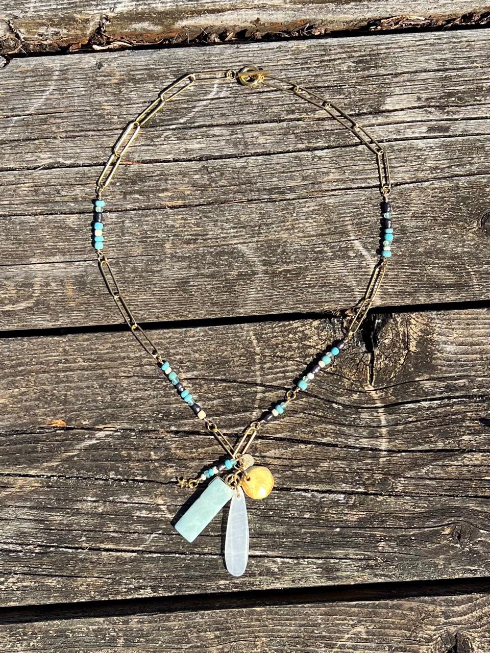 OOAK hand crafted necklace of gold plated paperclip chain mixed with sections of beads in various blues and materials: Japanese River Pearls, Green Apatite, Coconut Shell, Java Glass. Charm pendant made up of Amazonite rectangle, gold plated coin disc, Selenite teardrop, necklace beads with gold plated starfish and gold plated Beauette charm. The different shapes and textures in the assymetrical configuration give it a beautiful, organic feel. I love this with a bathing suit or v-neck top. The necklace is 21" around and the pendant hangs down an additional 2.75". Gold plated toggle clasp closure.
