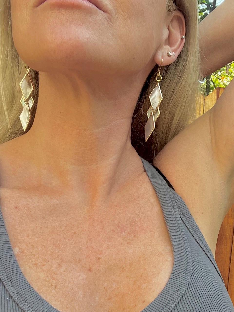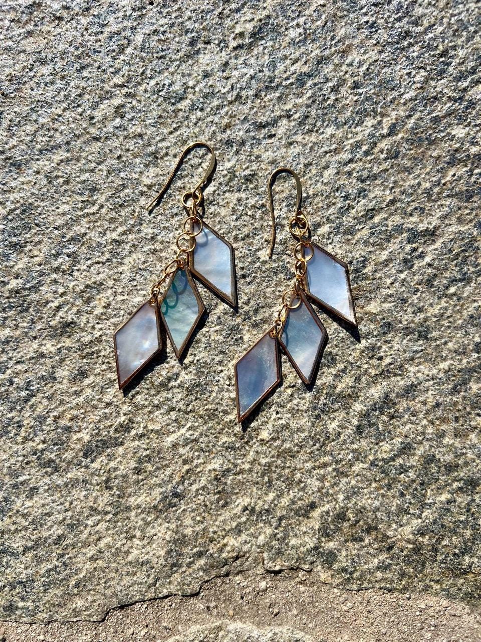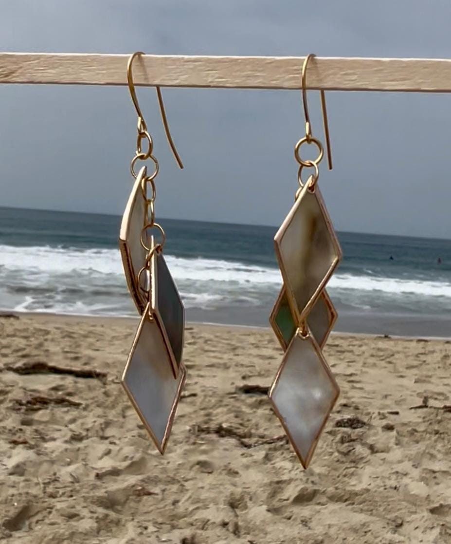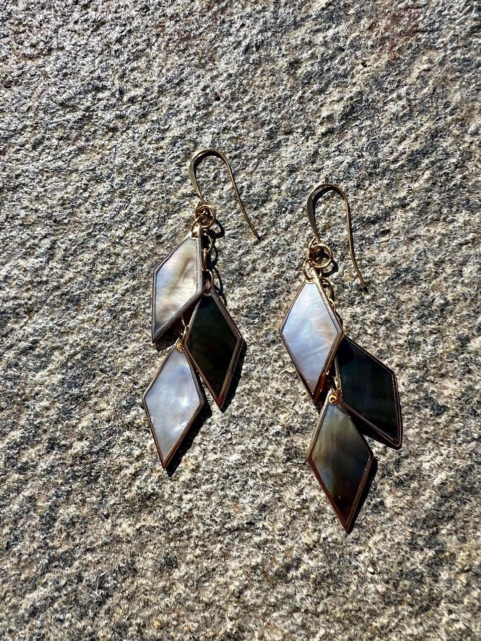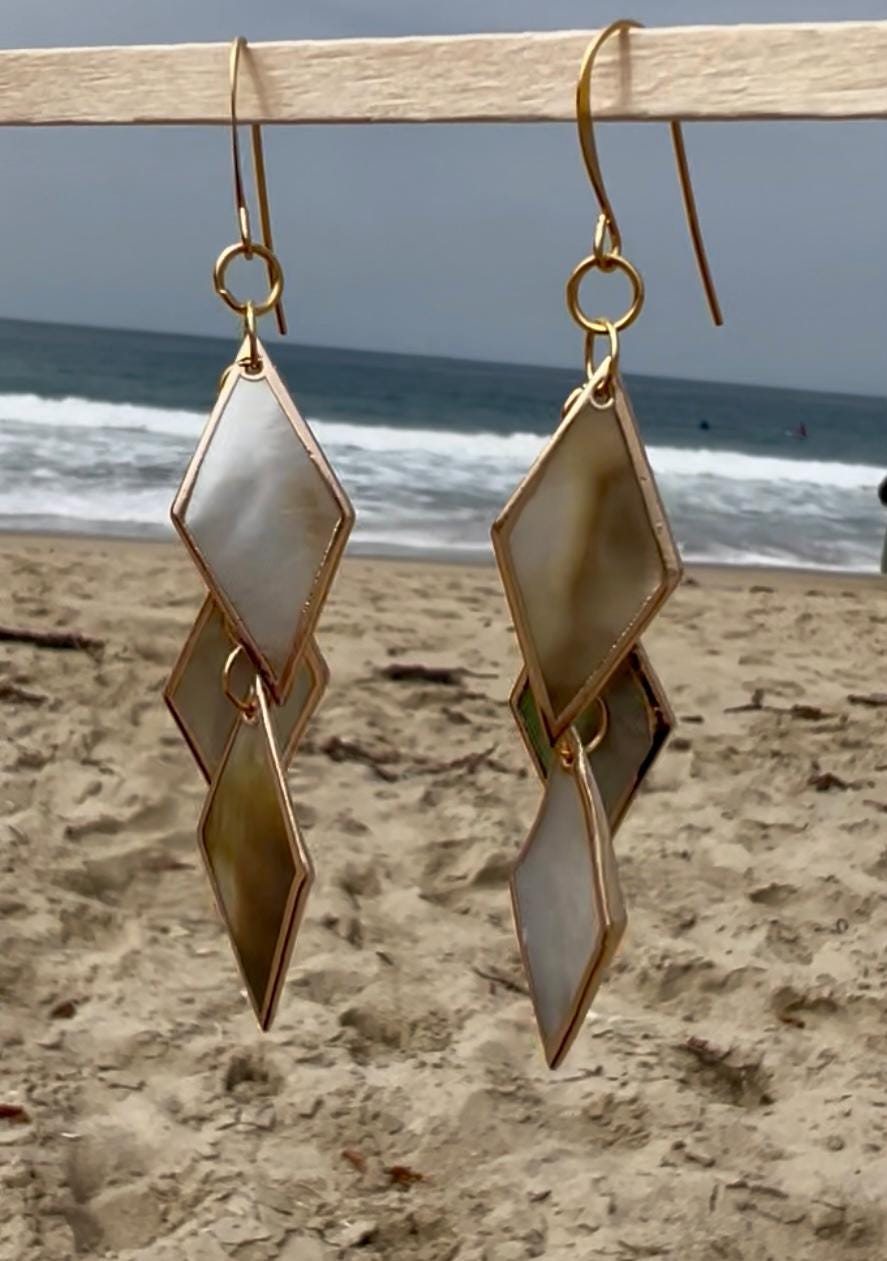 Unique, handmade drop earrings with 3 diamond-shaped pieces of black lip shell with gold leaf style edging. Gold plated rings link the pieces together and hang from a gold plated ear hook. A tad over 3 1/4" long. These sophisticated, fun earrings have great movement and shine and change color with the light. They are very lightweight and easy to wear. See my shop for many more styles of earrings with (and without) shells, as well as other jewelry.