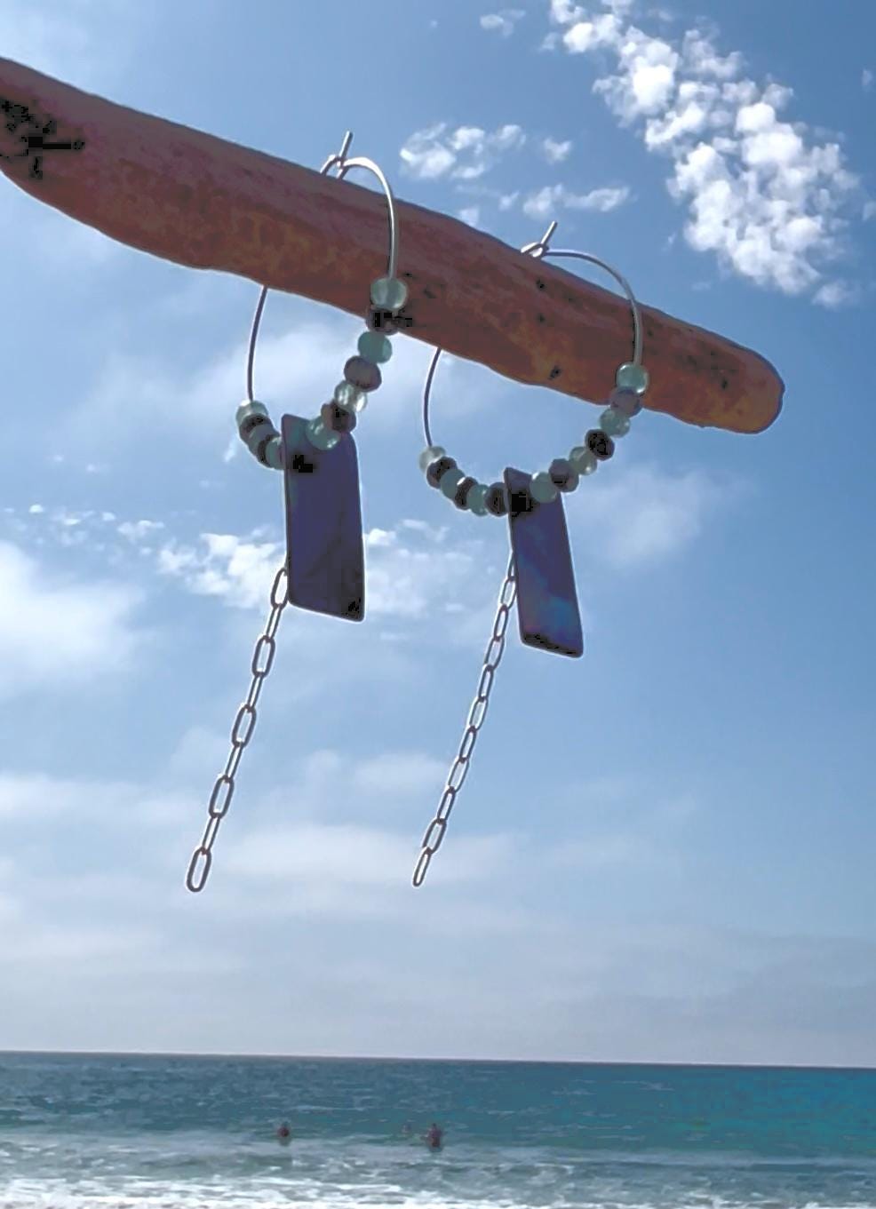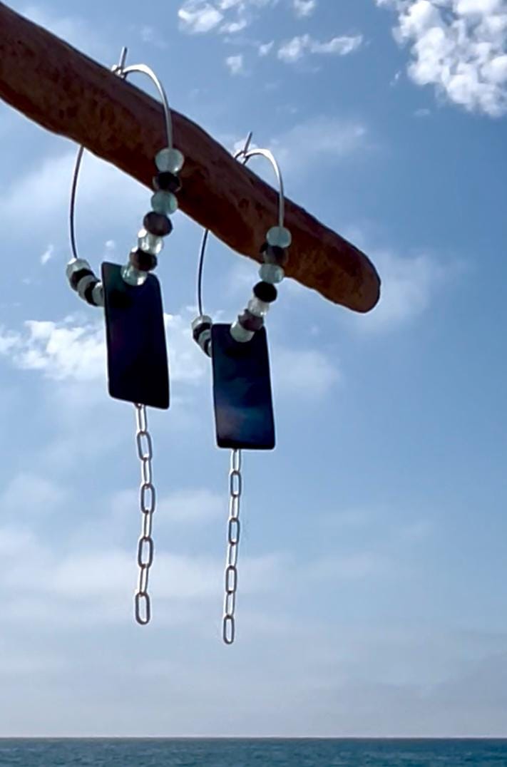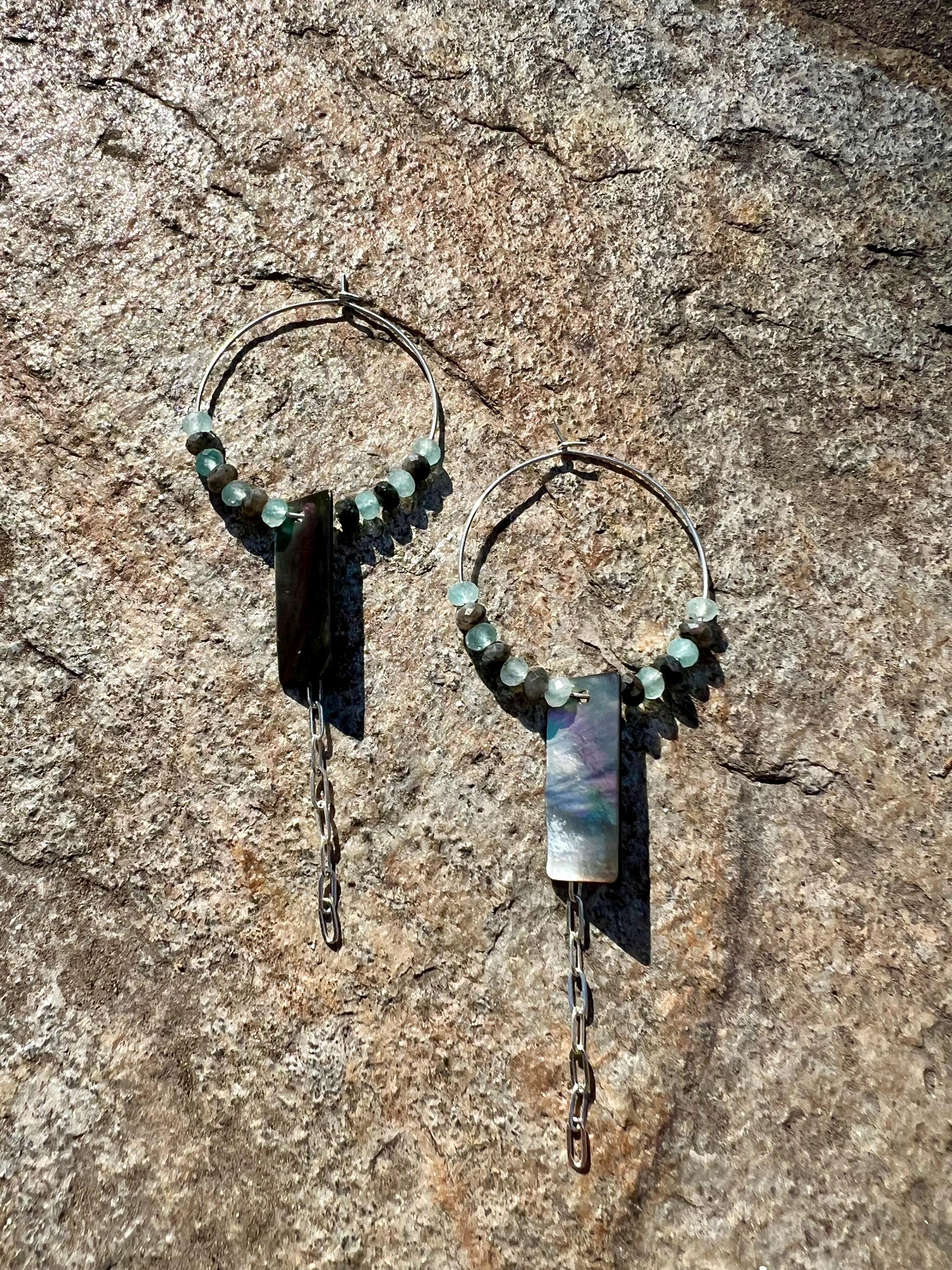 Unique and lightweight, these earrings feature tiny, faceted beads of Apatite and Labradorite creating a stripe pattern surrounding a rectangular cut Black Lip Shell and a long, delicate Silver plated chain on Silver plated hoops. Hoops are about 1.25" diameter and overall length is 3.5".