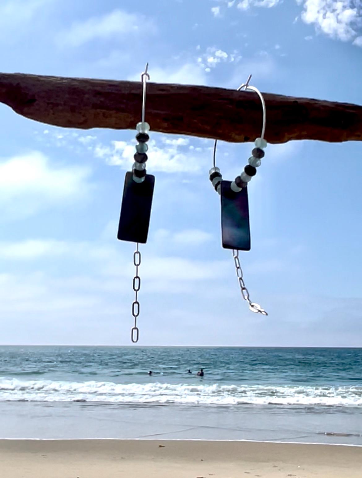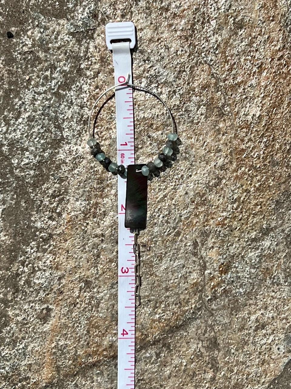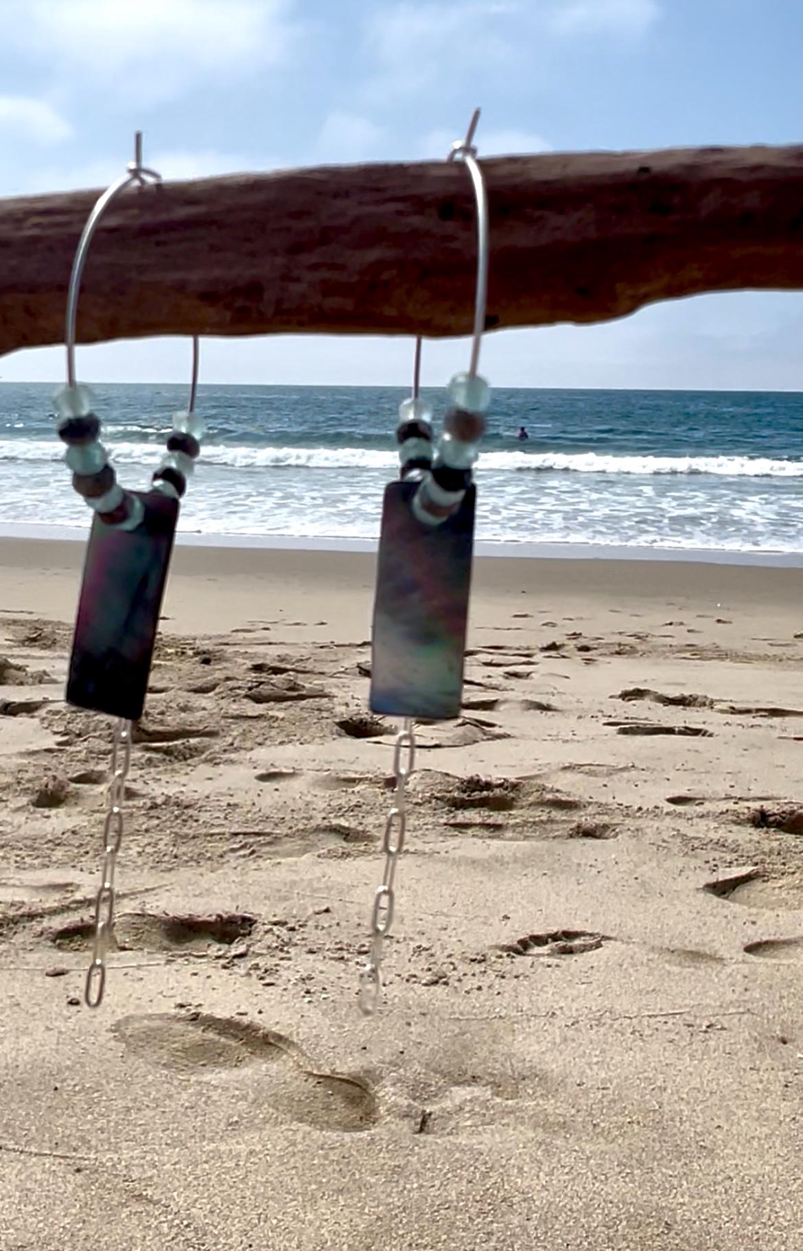 Unique and lightweight, these earrings feature tiny, faceted beads of Apatite and Labradorite creating a stripe pattern surrounding a rectangular cut Black Lip Shell and a long, delicate Silver plated chain on Silver plated hoops. Hoops are about 1.25" diameter and overall length is 3.5".