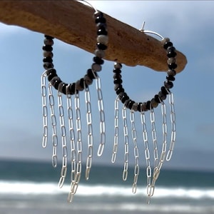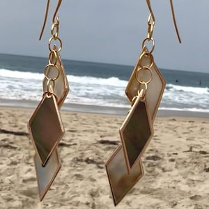 These unique and beautiful earrings are so lightweight that you might forget you were wearing them if it weren't for the pleasant little jingle they make when you move. Made of shell discs linked together by hand with gold plated links and suspended from a gold plated hook, they give a little pop right by your jawline that is very flattering. I love how the shiny silver inside of the shell plays against the rough, brown outer shell.