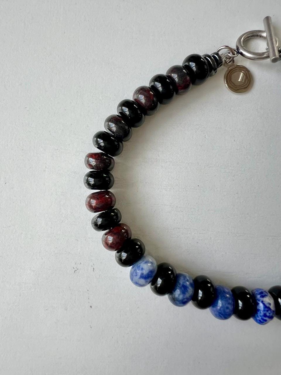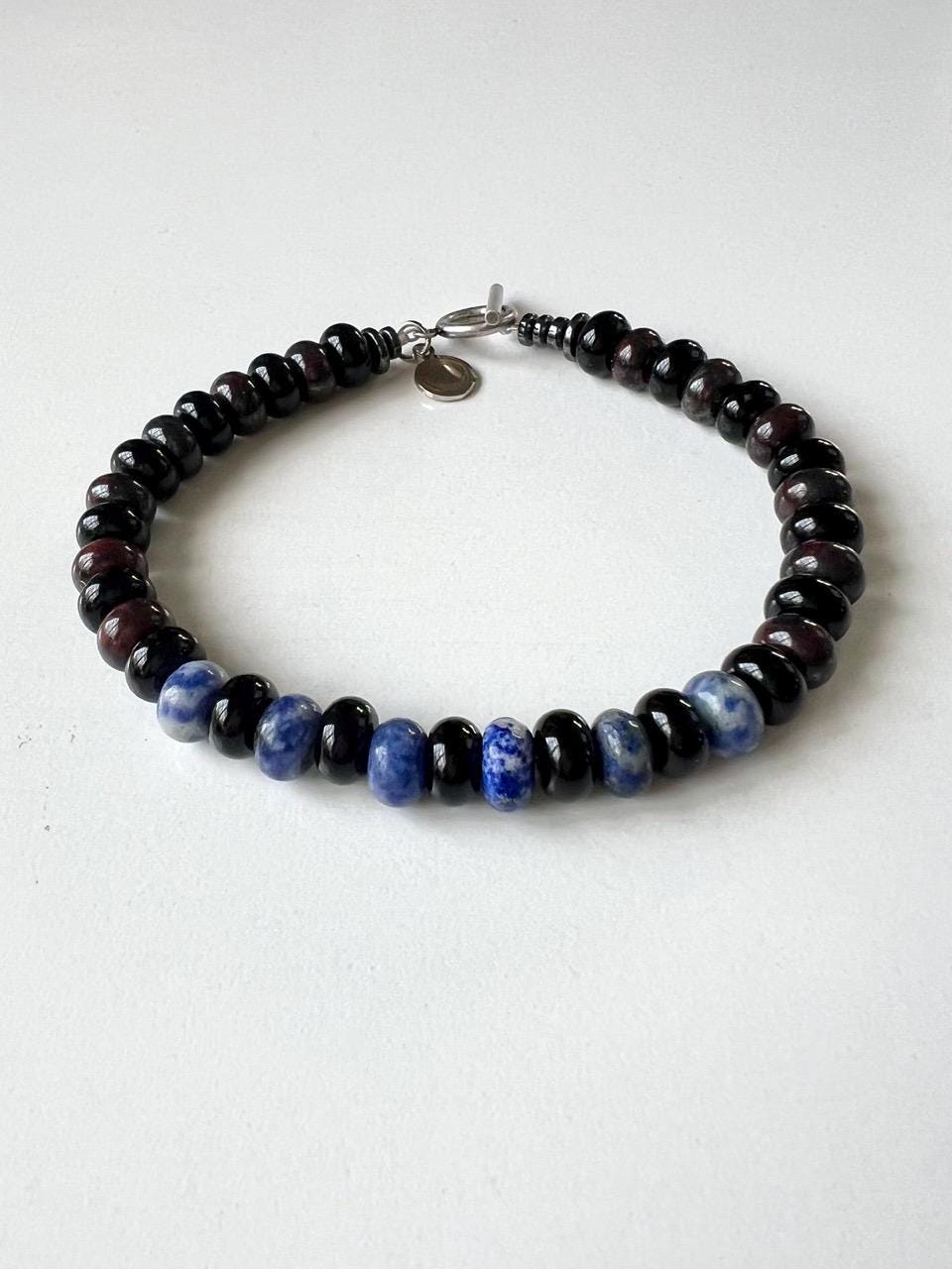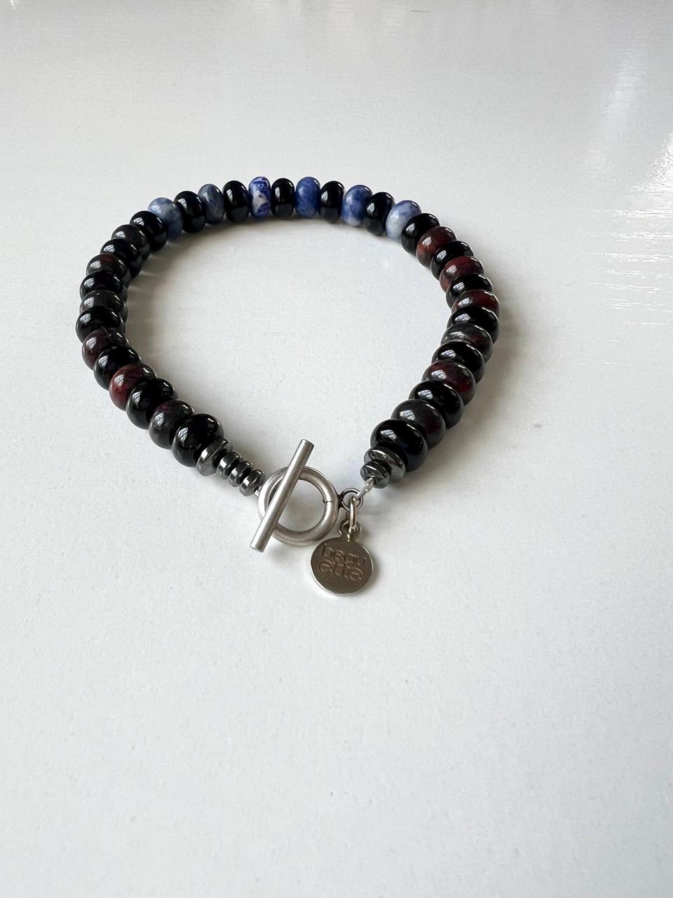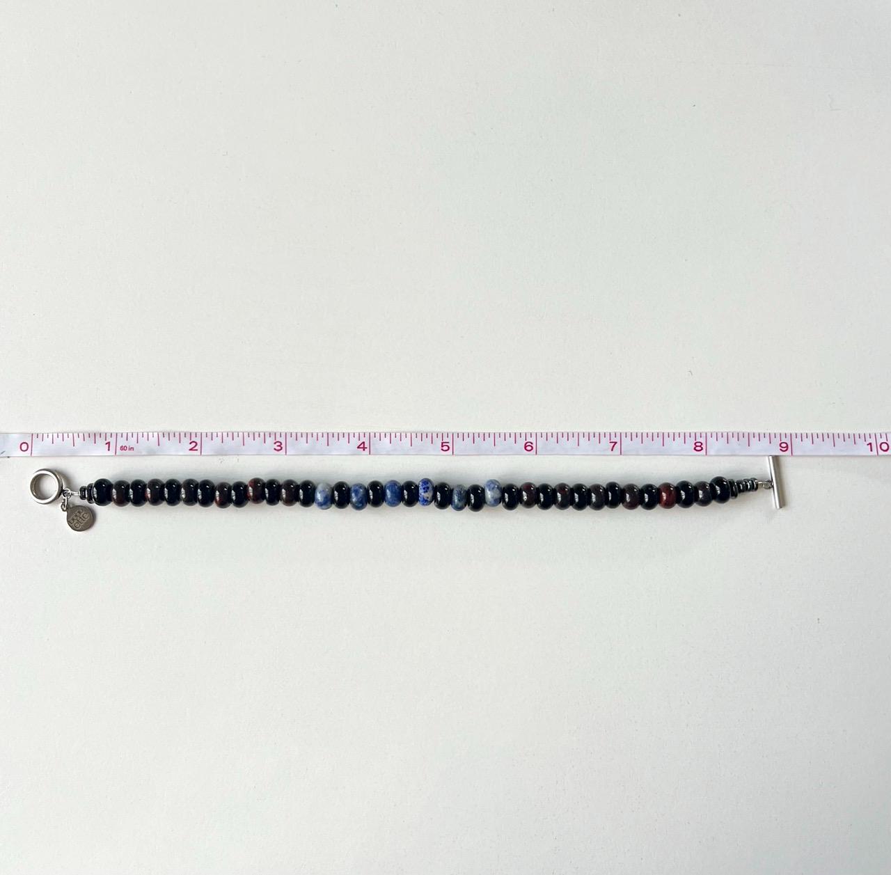Unisex bracelet of chunky, rondelle gemstone beads, 8mm diameter. Approx 9" long or men's size L/XL. Center features blue Sodalite alternated with black Onyx, with poppy Jasper alternated with Onyx on either side. Bracelet is finished with Hematite beads, Antiqued Silver Plated toggle clasp and a Rhodium plated brand tag. More styles availble in my shop.