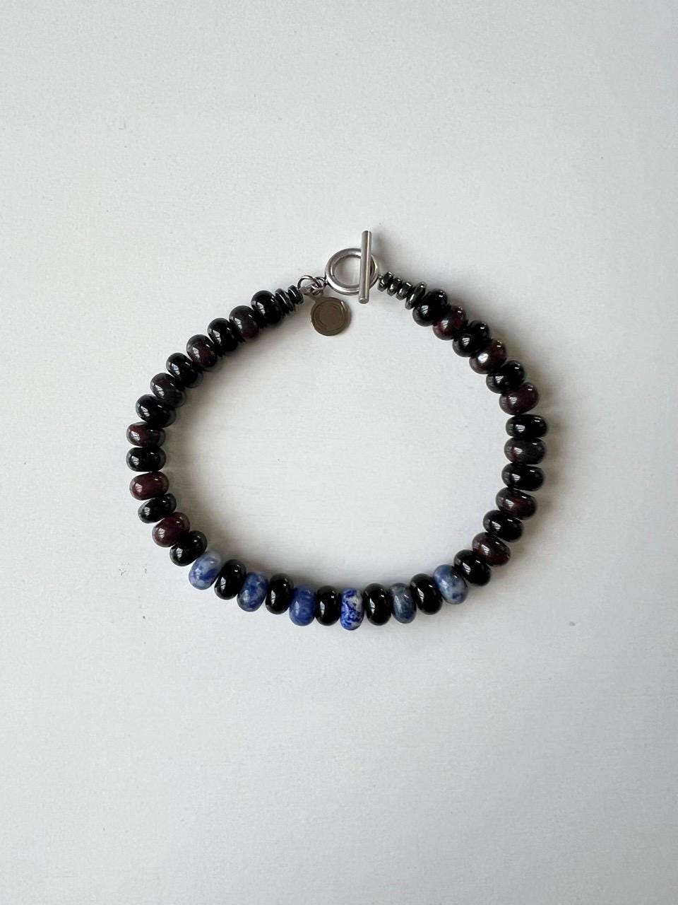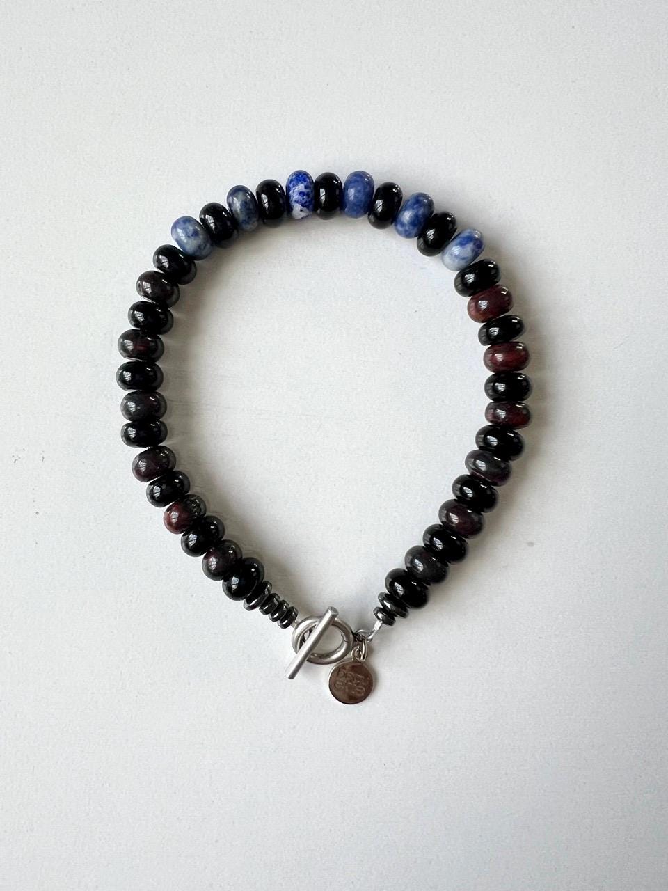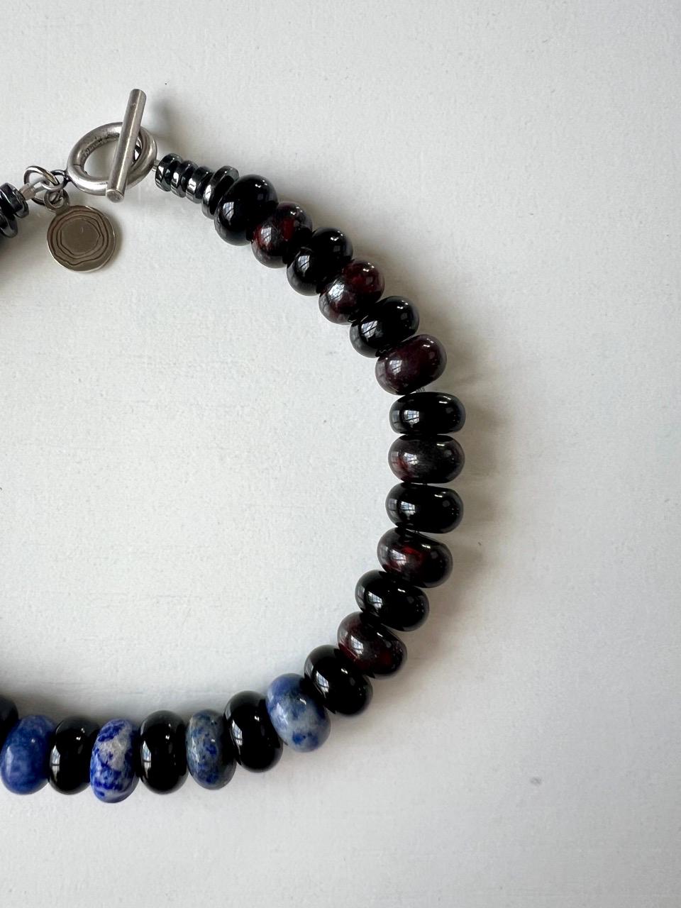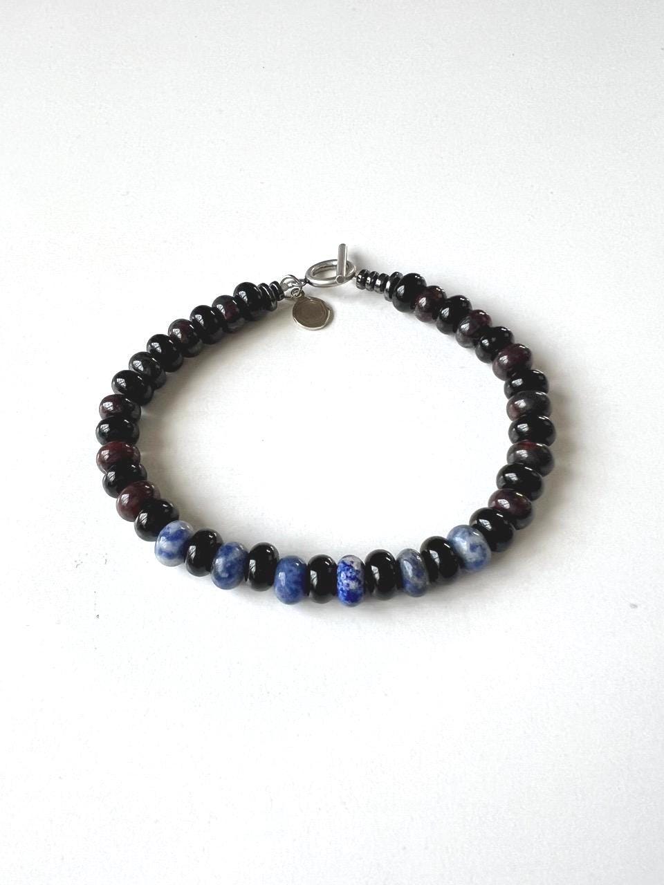 Unisex bracelet of chunky, rondelle gemstone beads, 8mm diameter. Approx 9" long or men's size L/XL. Center features blue Sodalite alternated with black Onyx, with poppy Jasper alternated with Onyx on either side. Bracelet is finished with Hematite beads, Antiqued Silver Plated toggle clasp and a Rhodium plated brand tag. More styles availble in my shop.