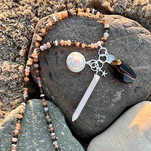 All jewelry is handmade of natural materials, by me, by the beach in California or by the mountains in Colorado or wherever I happen to be traveling. Packaging is compostable or recycled and/or recyclable. Items are shipped in an organic cotton jewelry bag, with a care card, in a gift box with raffia ribbon and wood beads, ready for gifting to yourself or another.