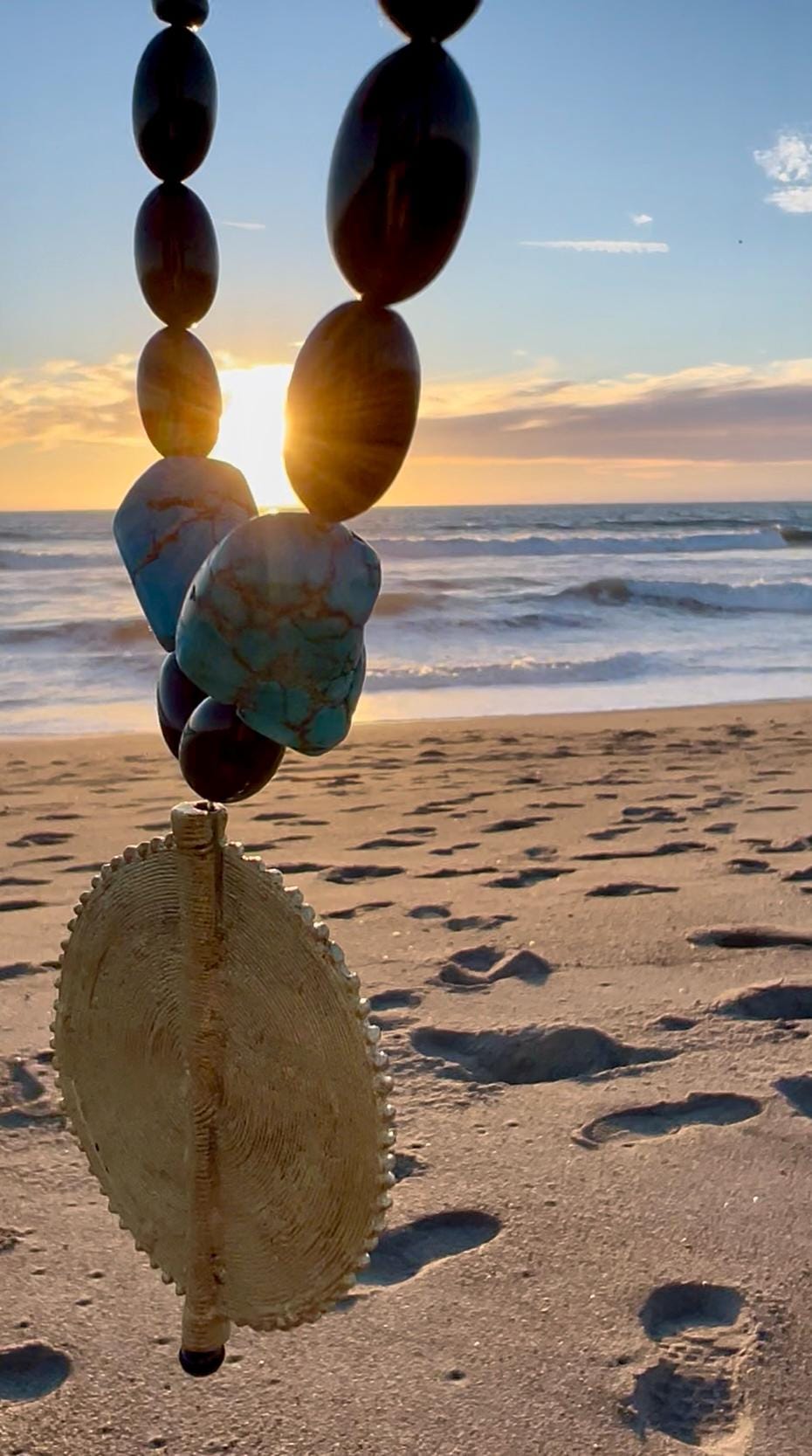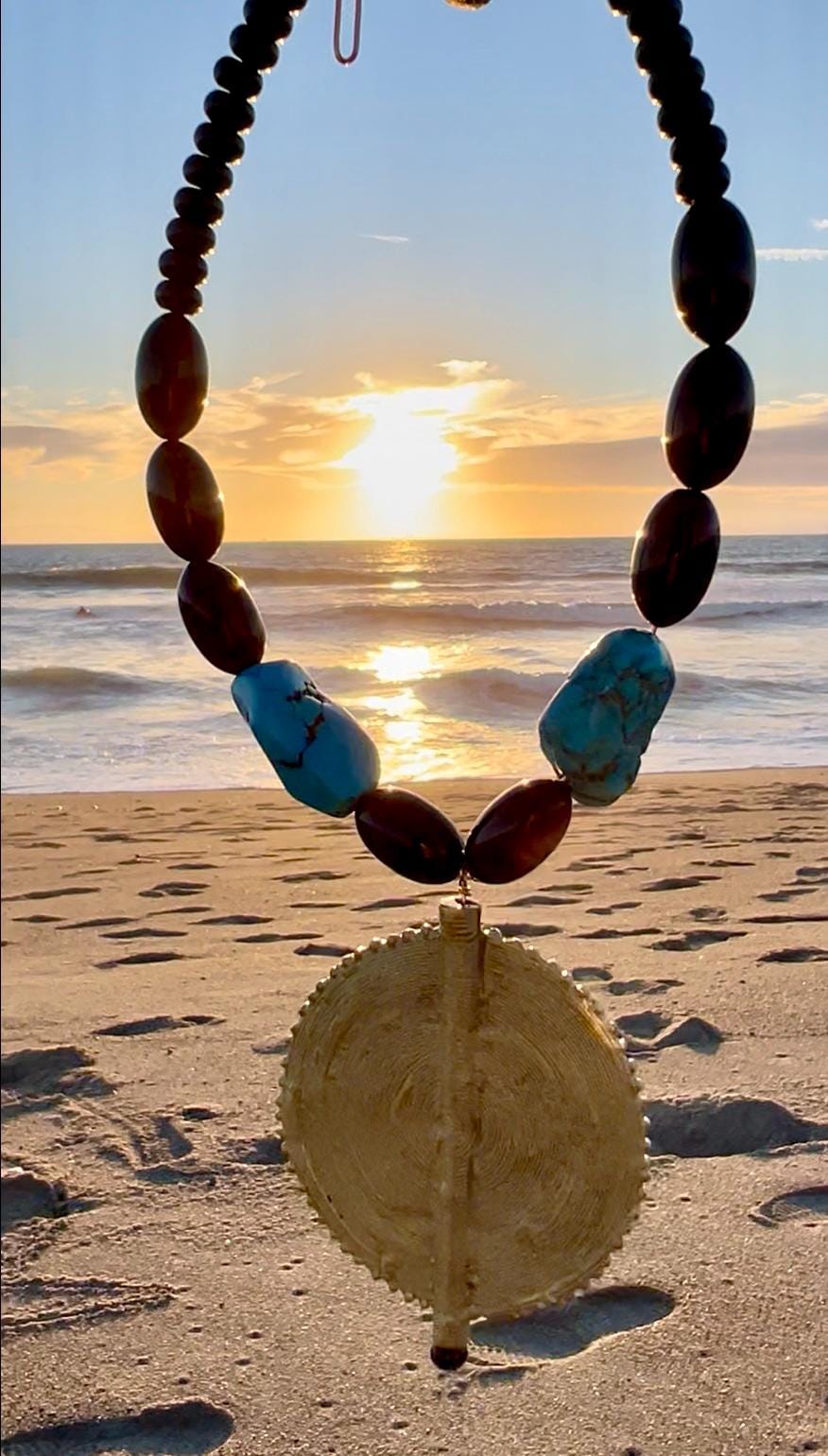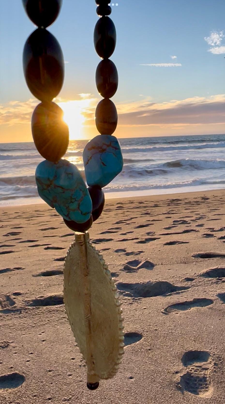 All jewelry is handmade of natural materials, by me, by the beach in California or by the mountains in Colorado or wherever I happen to be traveling. Packaging is compostable or recycled and/or recyclable. Items are shipped in an organic cotton jewelry bag, with a care card, in a gift box with raffia ribbon and wood beads, ready for gifting to yourself or another.