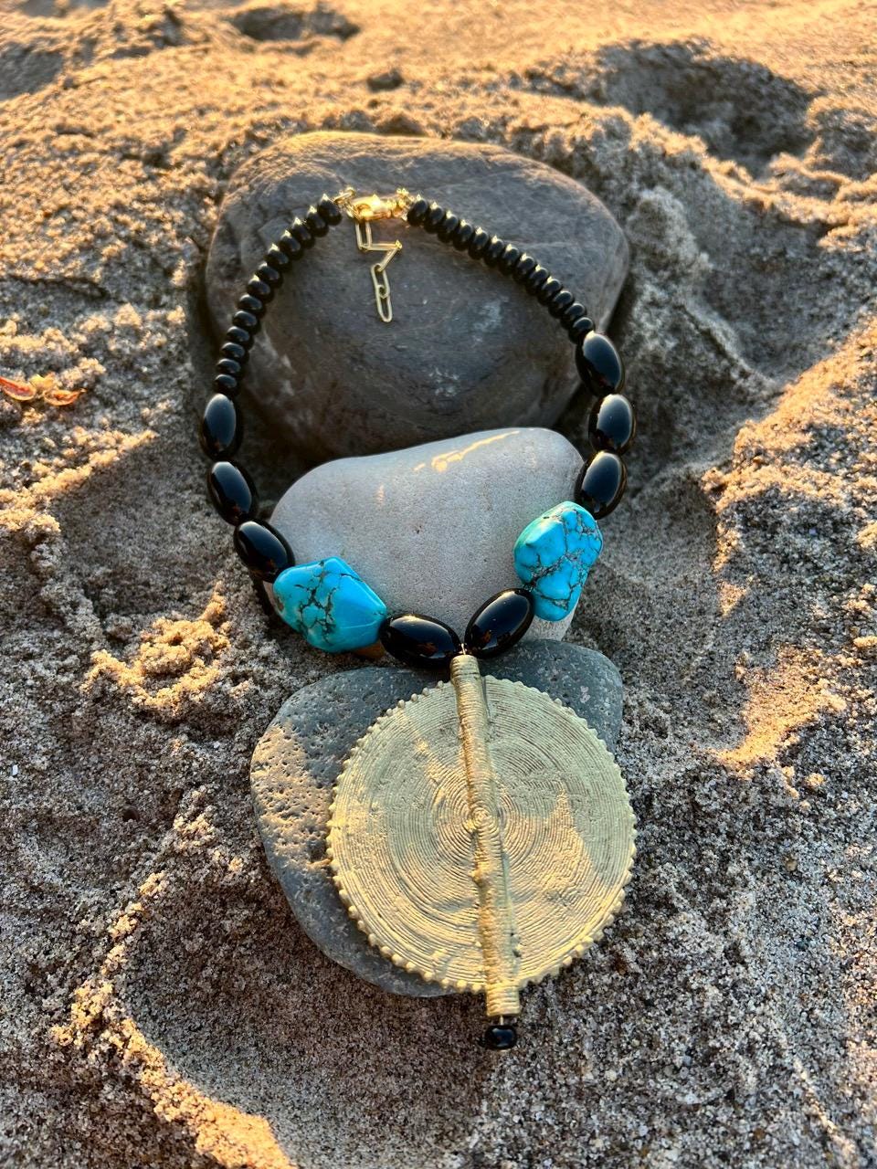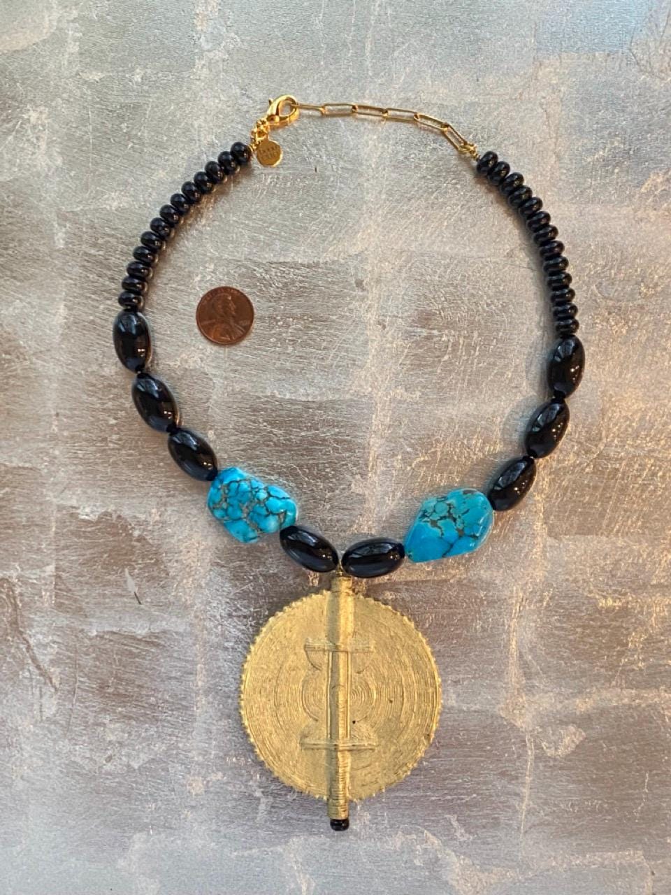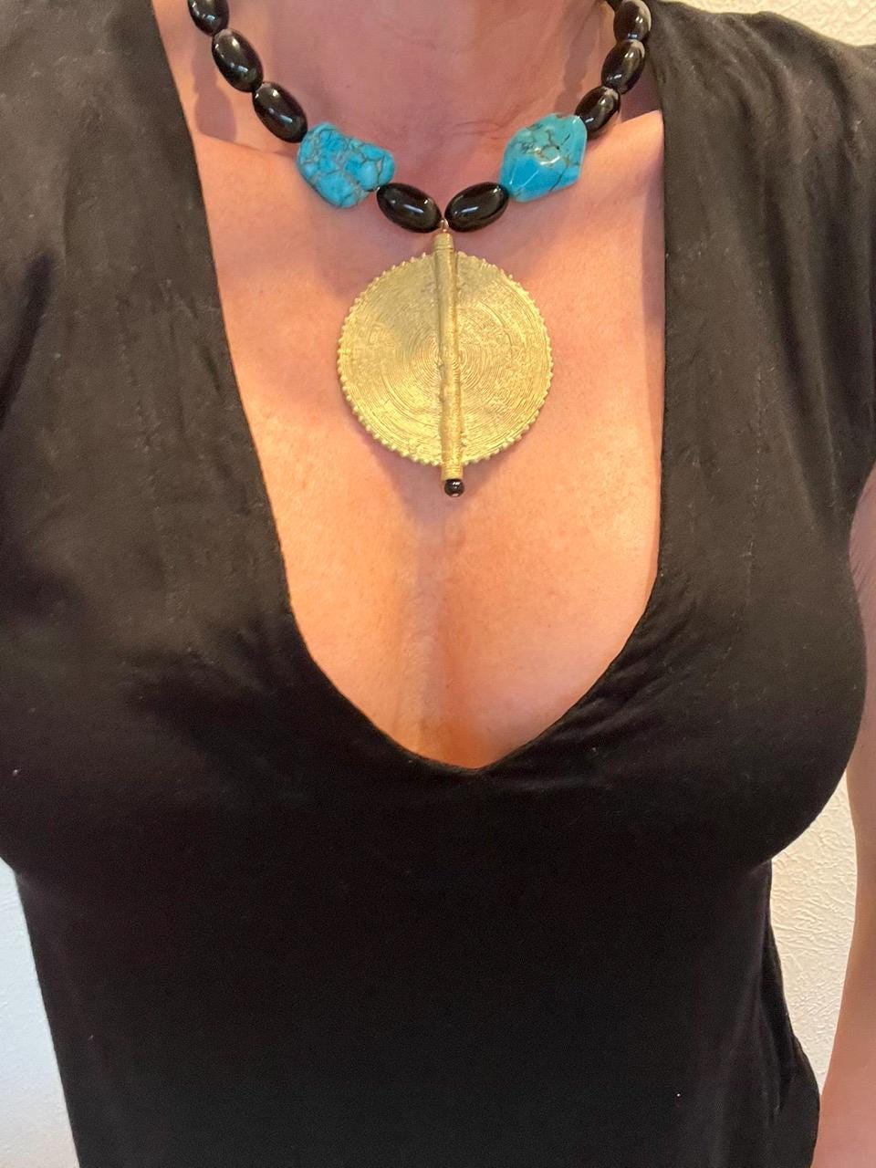 Handmade choker necklace of Onyx large oval spheres and smaller rondelles and Turquoise large nuggets features Brass African Baule Sun Pendant, with a different design on each side. Finished with Gold plated lobster claw clasp, chain and Beauette tag. Length is adjustable from approximately 15.5" to 17.5". Pendant is 2.75" wide and hangs down 3.25" from necklace.