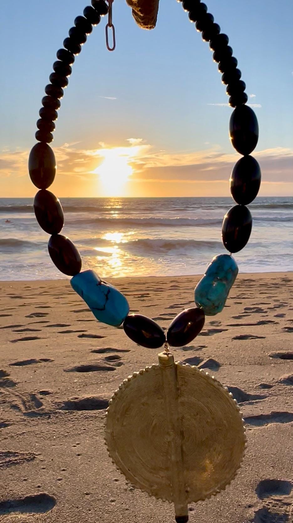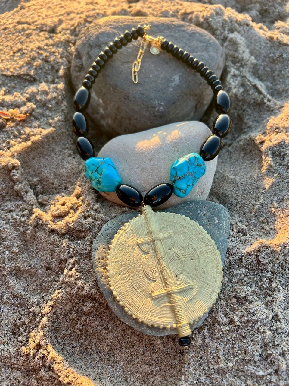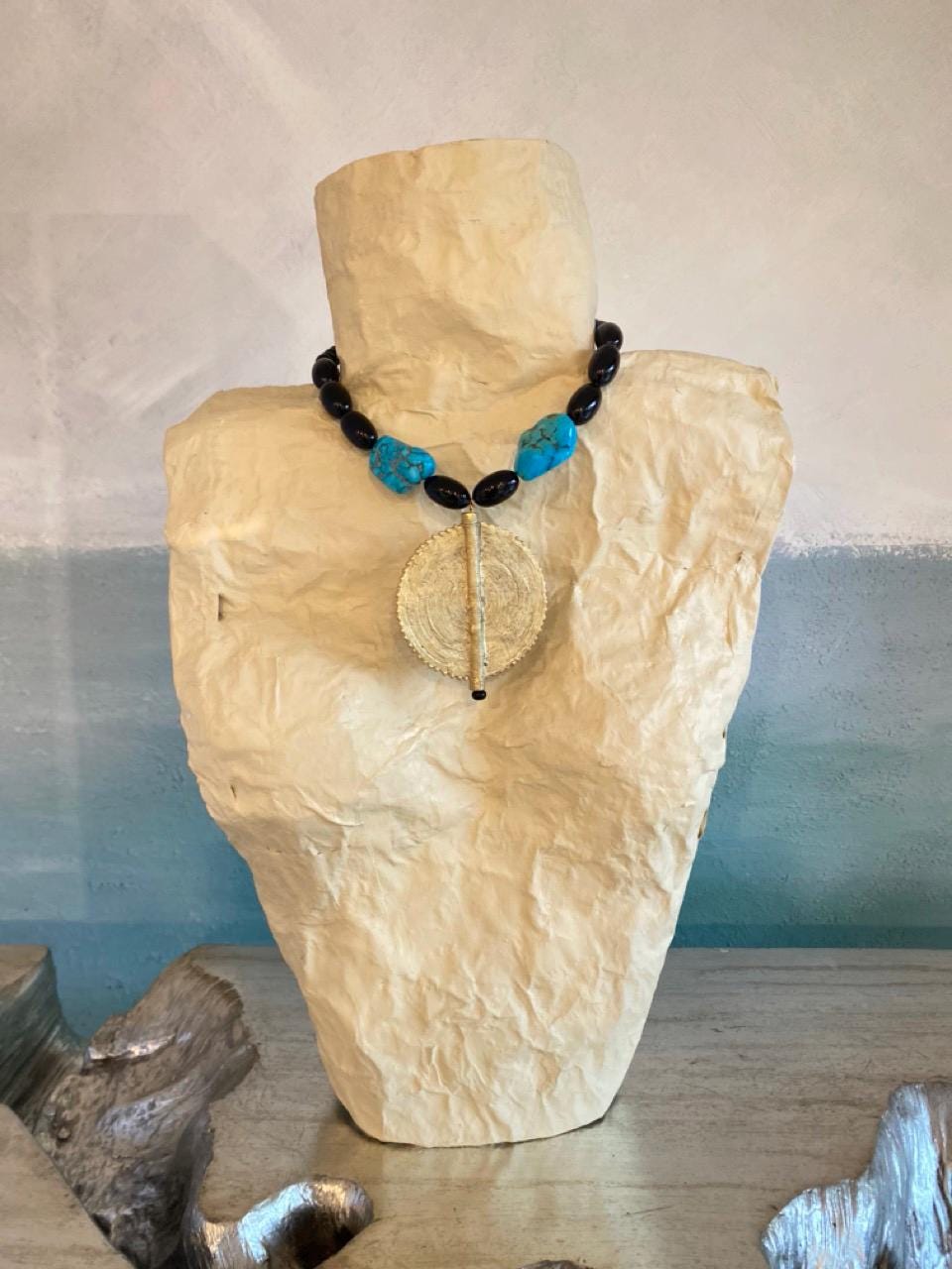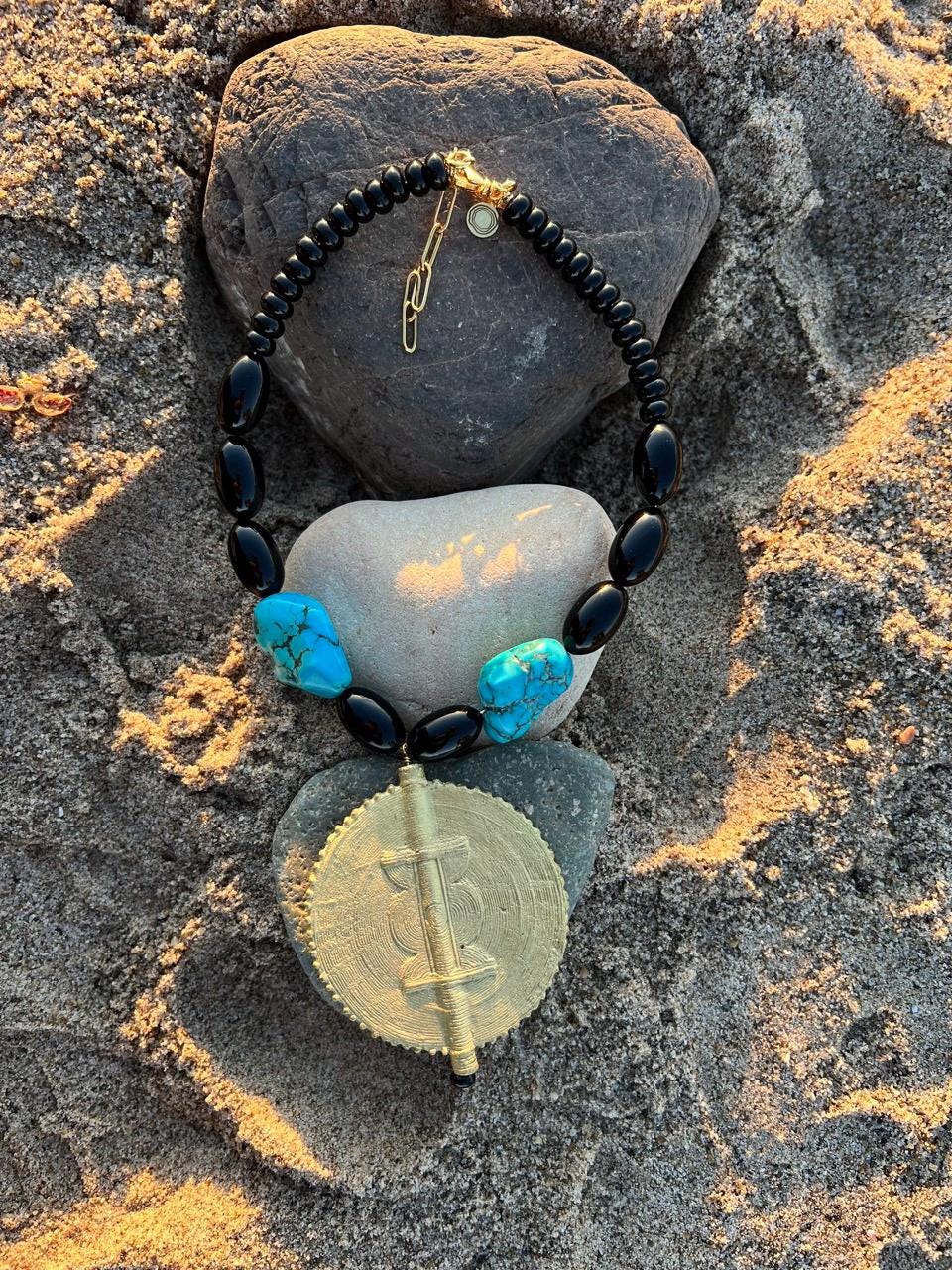 Handmade choker necklace of Onyx large oval spheres and smaller rondelles and Turquoise large nuggets features Brass African Baule Sun Pendant, with a different design on each side. Finished with Gold plated lobster claw clasp, chain and Beauette tag. Length is adjustable from approximately 15.5" to 17.5". Pendant is 2.75" wide and hangs down 3.25" from necklace.