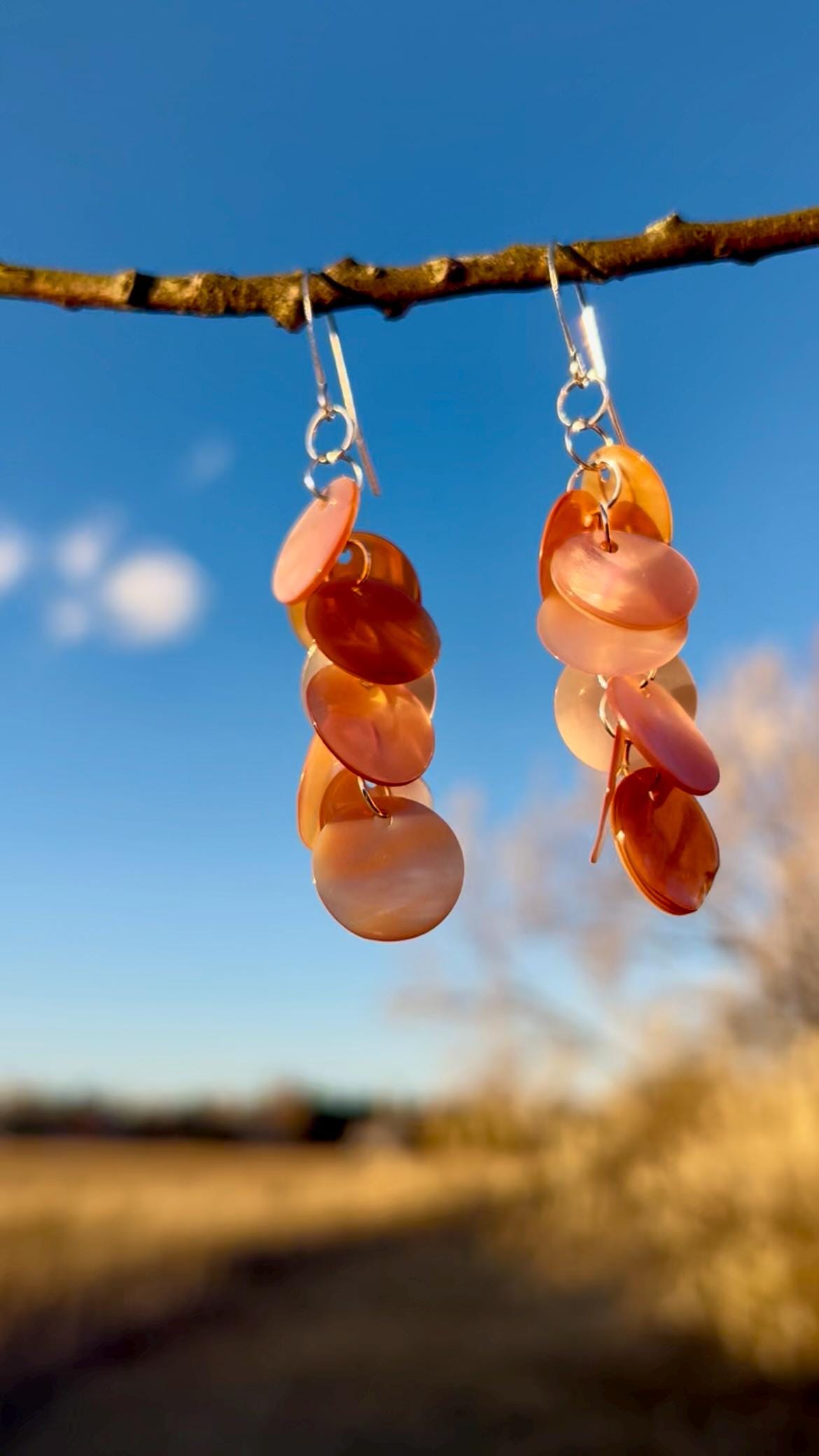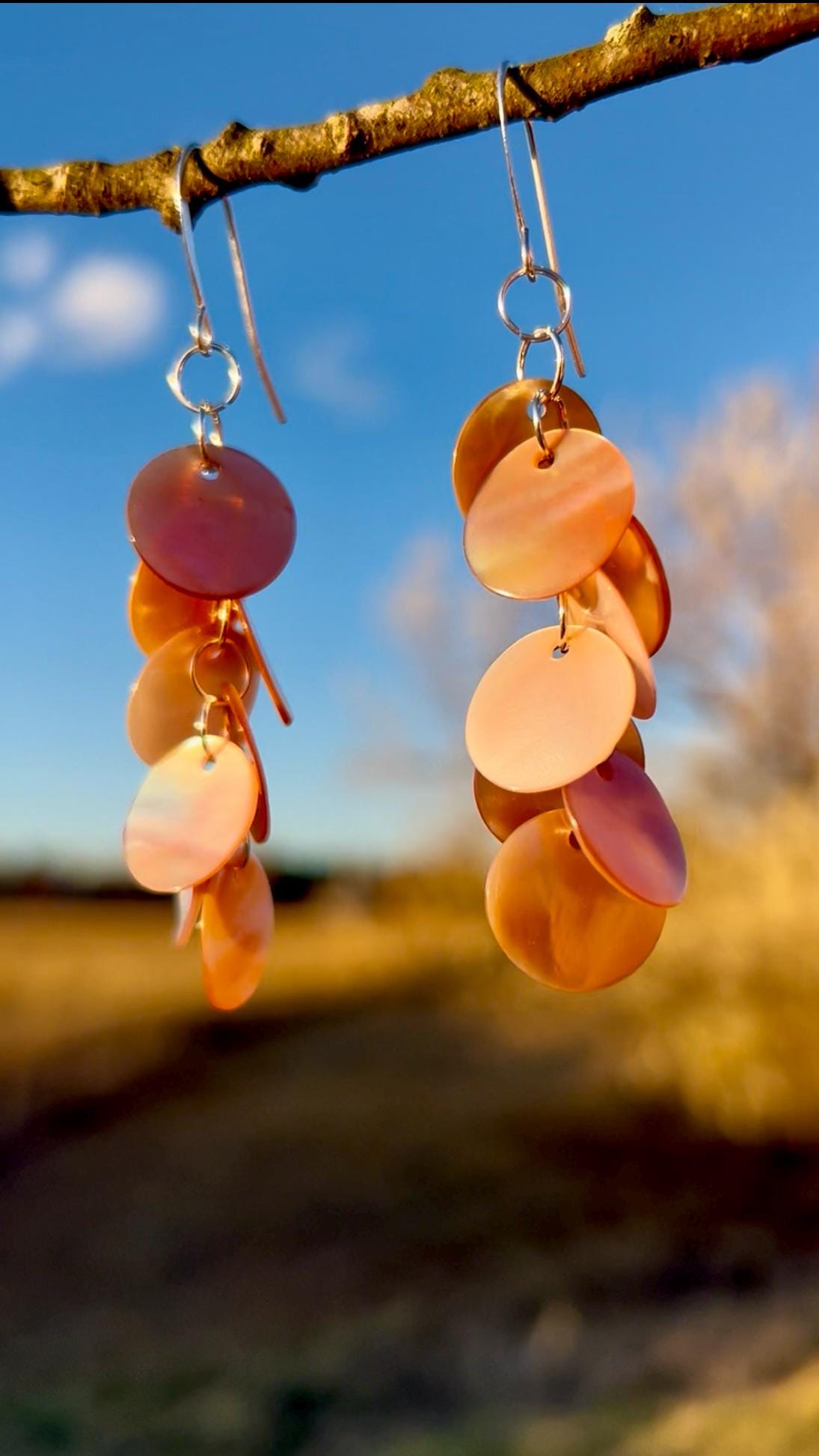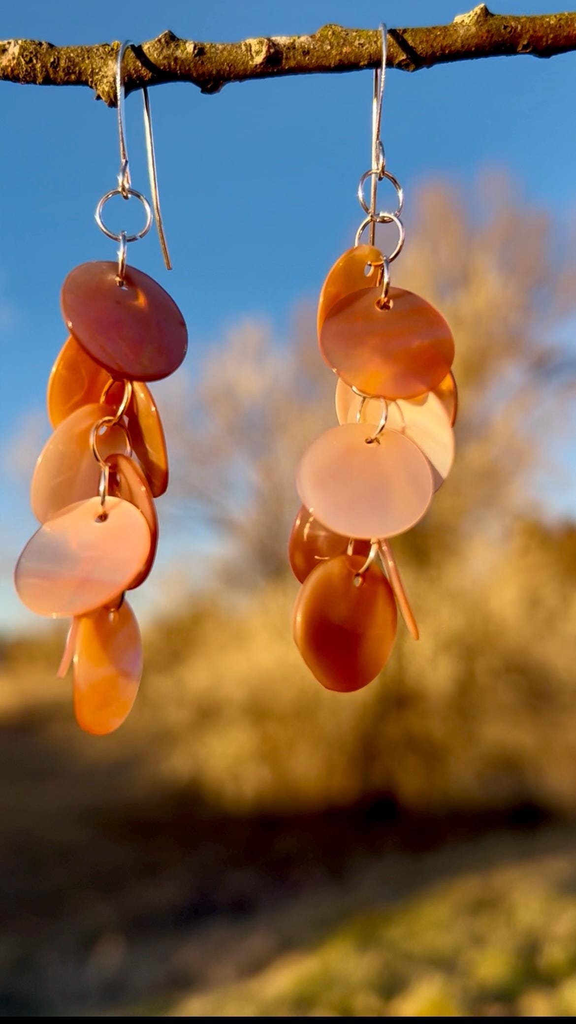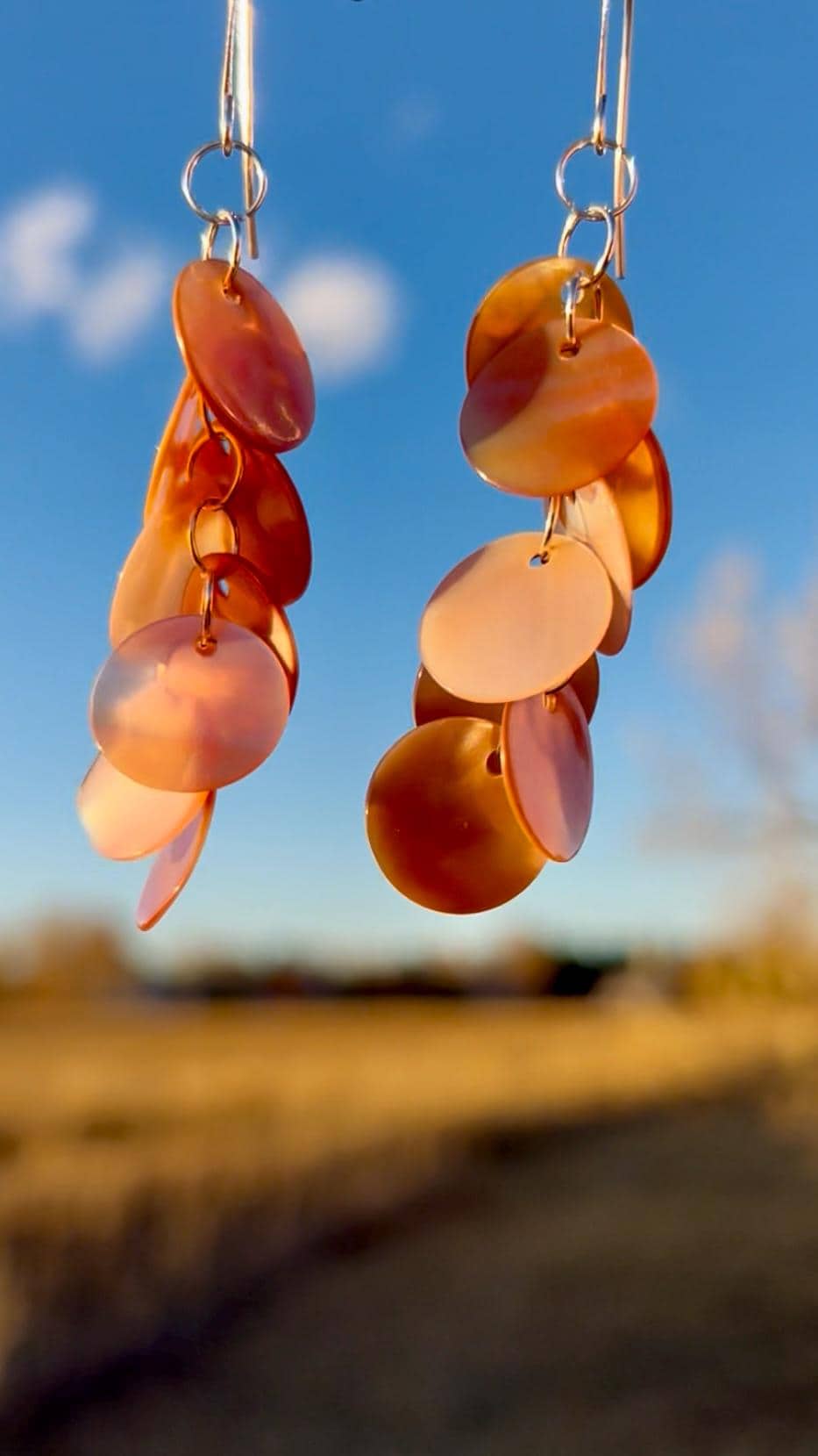 Lightweight, long, dangly statement earrings of pink shell discs linked together by hand with silver plated rings, hanging on silver plated ear hook. The shell color is a pale pink like shown in the image with the tape measure. The darker pink/orange shown in the outdoor photos is what happens when they are hit with direct sunlight. The shells have a nice iridescence to them and pick up the light as you move. These earrings are very lightweight and easy to wear. The discs are about 1/2" wide and the earrings hang at about 3/4" wide to nearly 3" long.