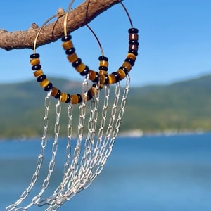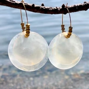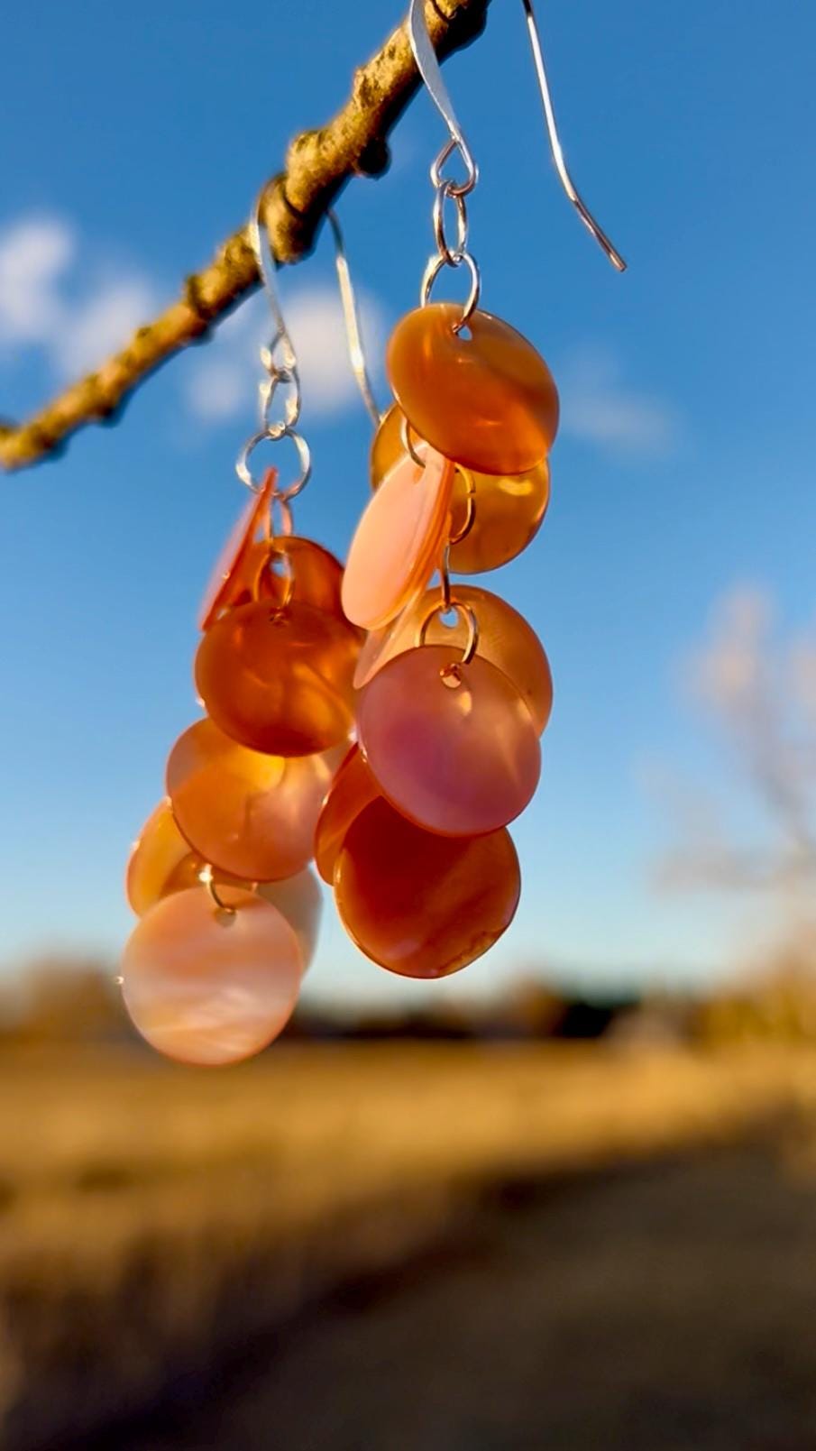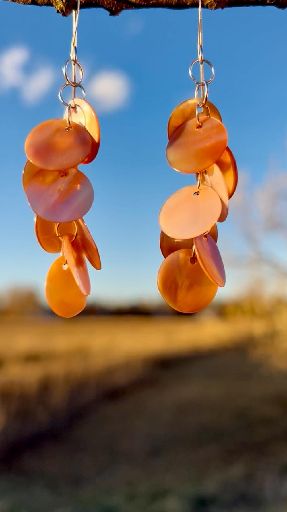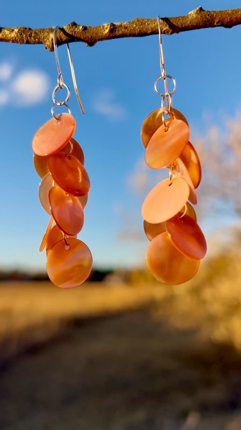 Lightweight, long, dangly statement earrings of pink shell discs linked together by hand with silver plated rings, hanging on silver plated ear hook. The shell color is a pale pink like shown in the image with the tape measure. The darker pink/orange shown in the outdoor photos is what happens when they are hit with direct sunlight. The shells have a nice iridescence to them and pick up the light as you move. These earrings are very lightweight and easy to wear. The discs are about 1/2" wide and the earrings hang at about 3/4" wide to nearly 3" long.