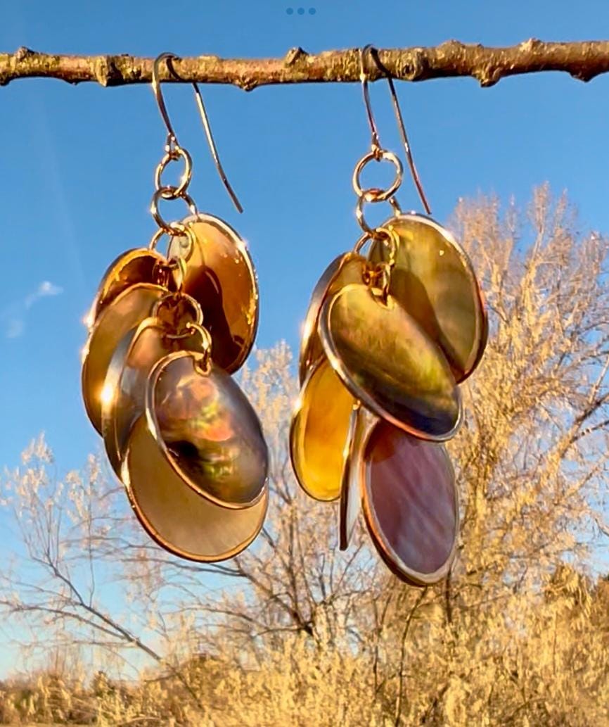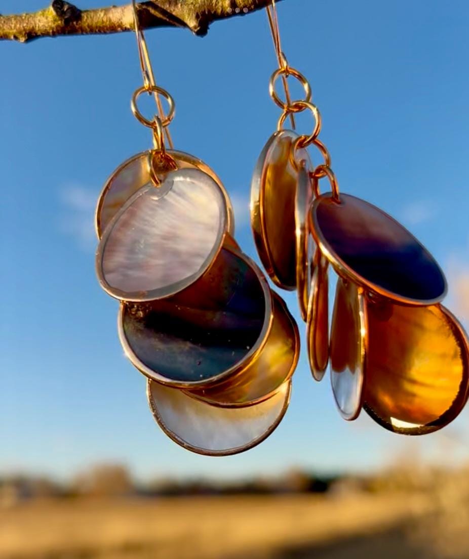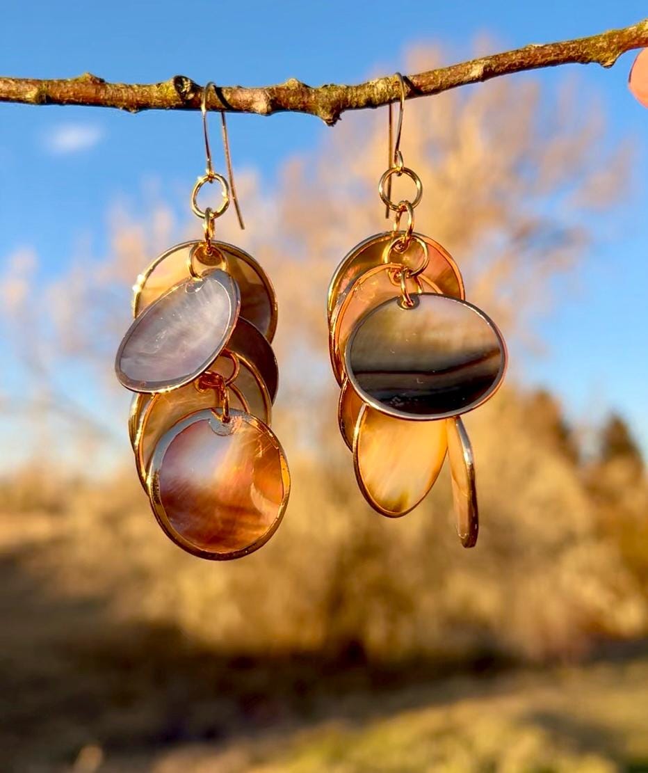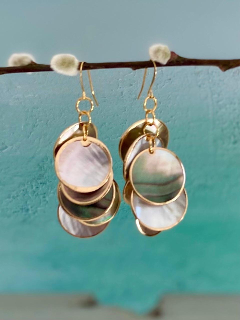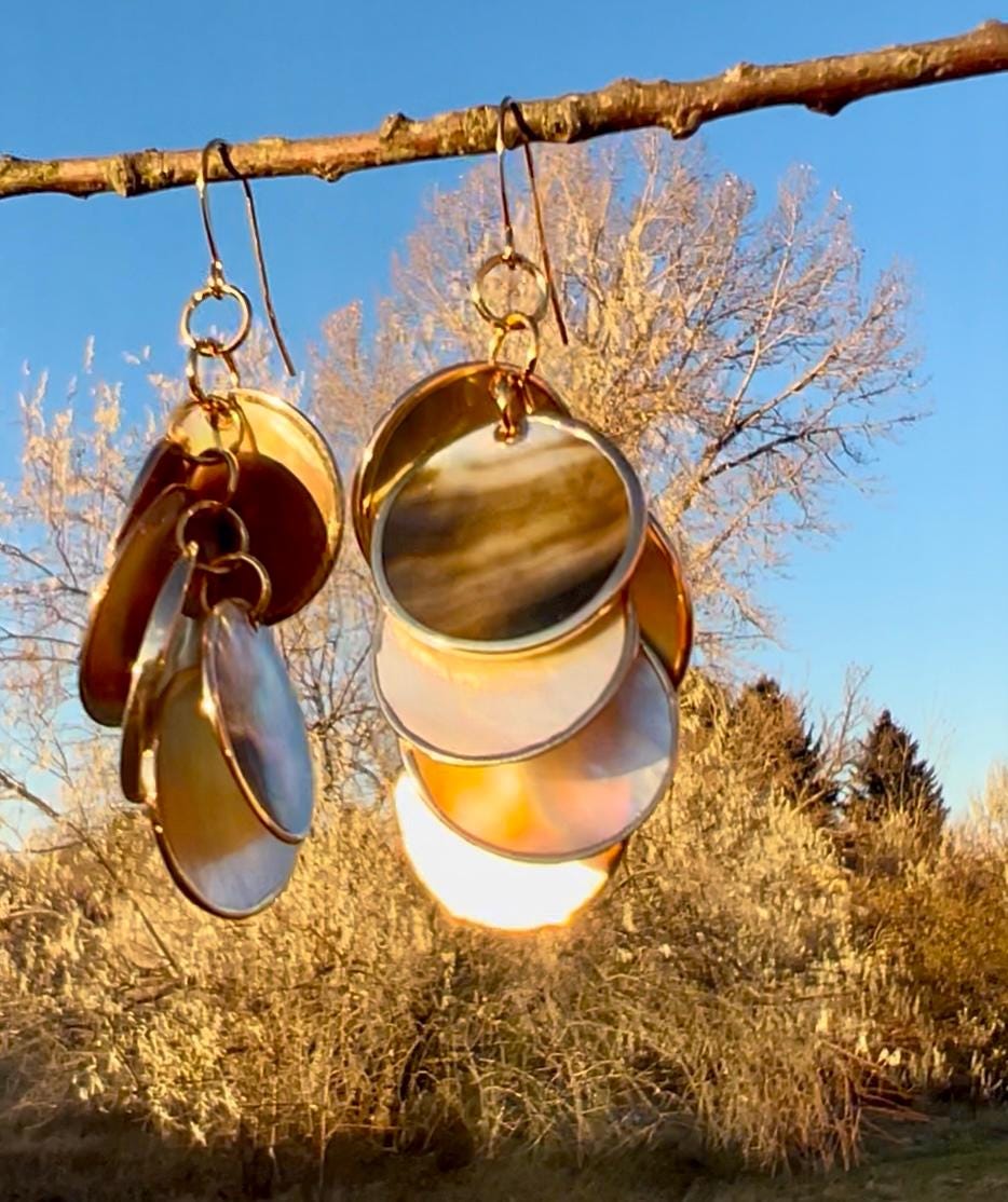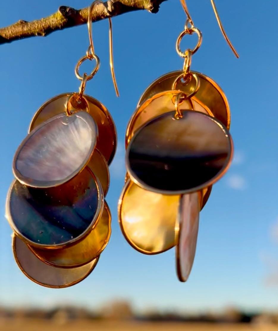1" diameter natural Black Lip Shell coins with gold finished edges are beautifully neutral for Fall and Winter styles. The shells themselves are ivory, brown and gray, and the gold edging adds even more shine. They move beautifully with you, reconfiguring and catching the light. Six shell coins are individually linked together by hand with gold plated rings, on gold-plated ear hooks. They are approximately 3.25" long and about 1" wide.