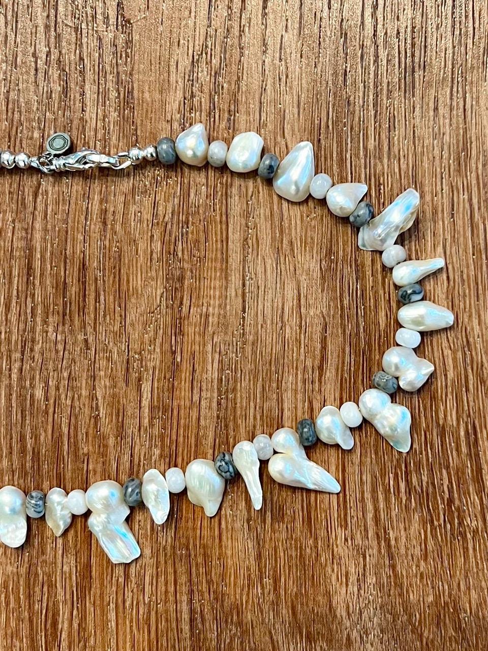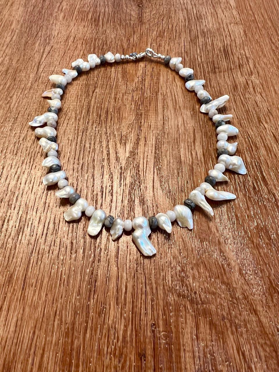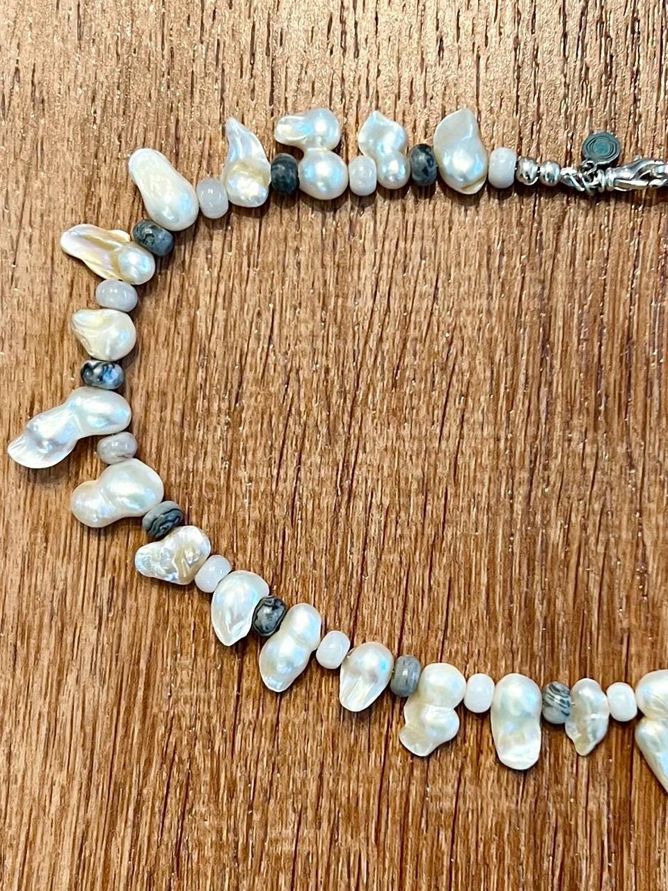 Biwa Pearls, White Crazy Lace Agate and Silver Crazy Lace Agate make up this choker necklace, right in line with the Fall trends and a fashion-forward take on the traditional pearl necklace. Finished with a silver plated lobster claw clasp, measures 16"